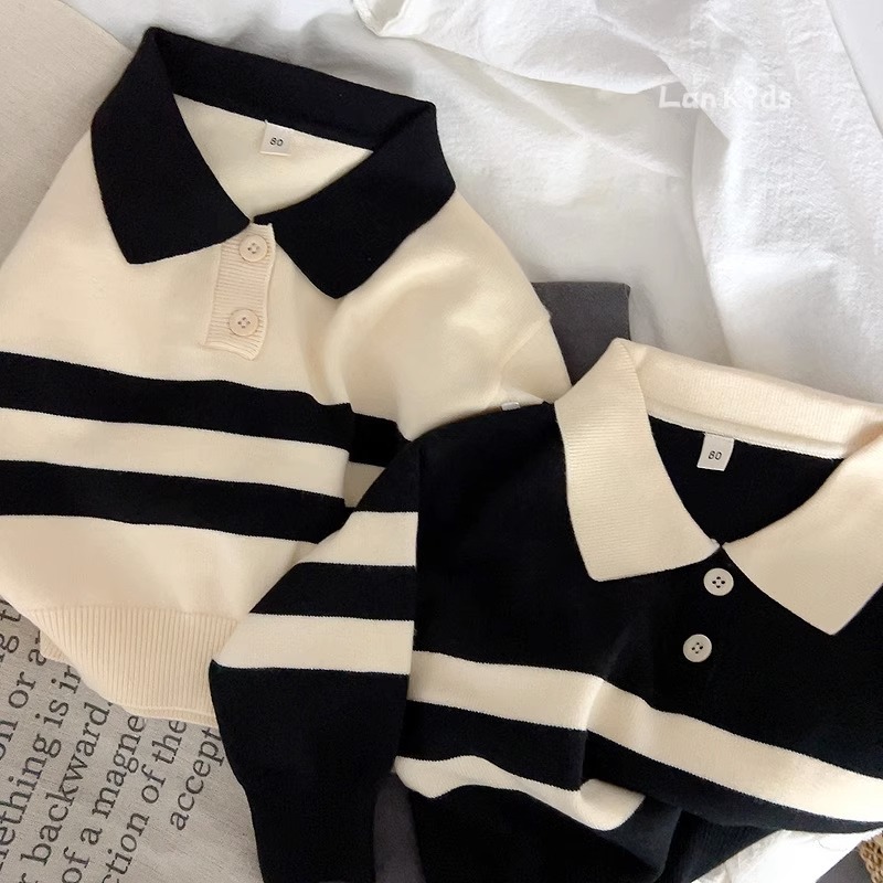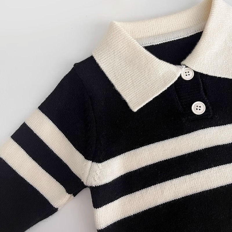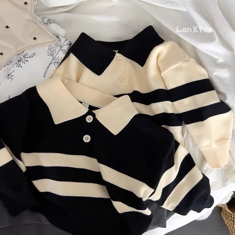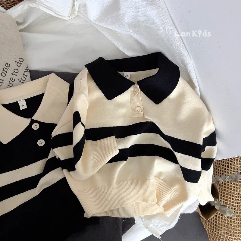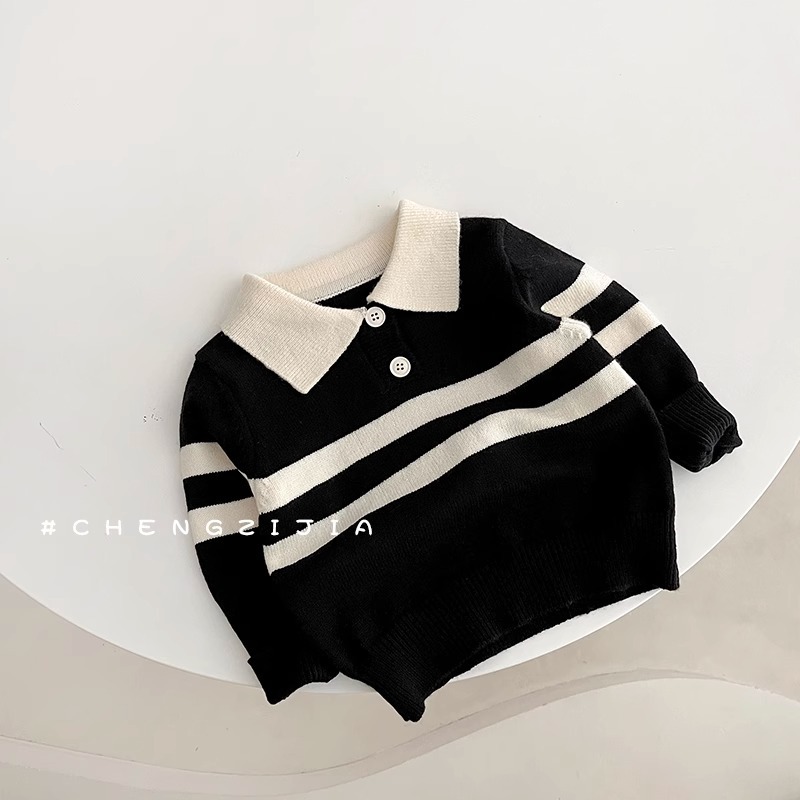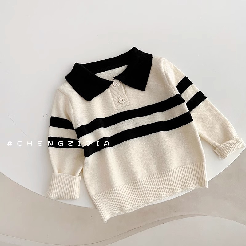 2023 새로운 한국어 버전 봄, 가을 어린이 스웨터 남성과 여성의 두 버튼 스트라이프 스웨터 느슨한 반팔 스타일스토어 가기