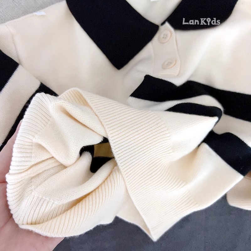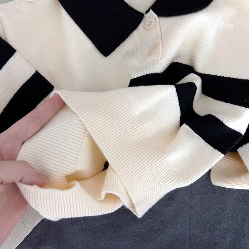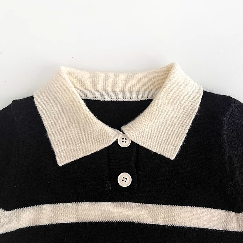 2023 새로운 한국어 버전 봄, 가을 어린이 스웨터 남성과 여성의 두 버튼 스트라이프 스웨터 느슨한 반팔 스타일