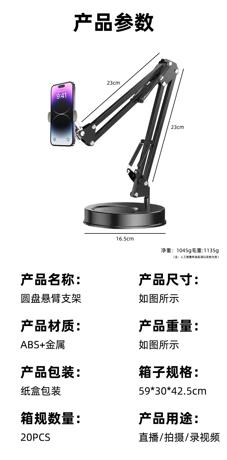 공장 도매 휴대 전화 라이브 사진 브래킷 가중 기본 데스크탑 브래킷 금속 외팔보 오버 헤드 브래킷