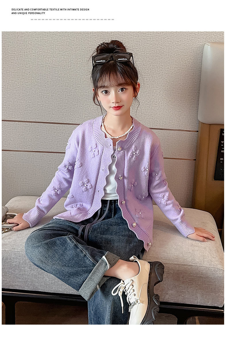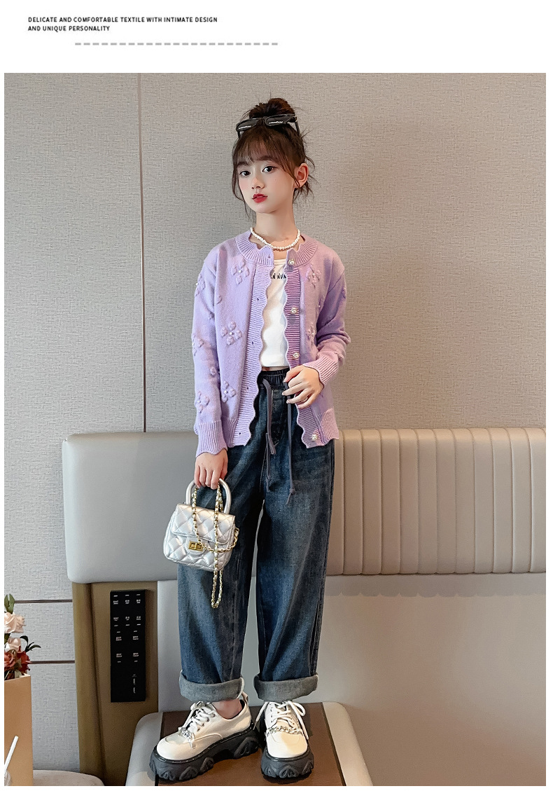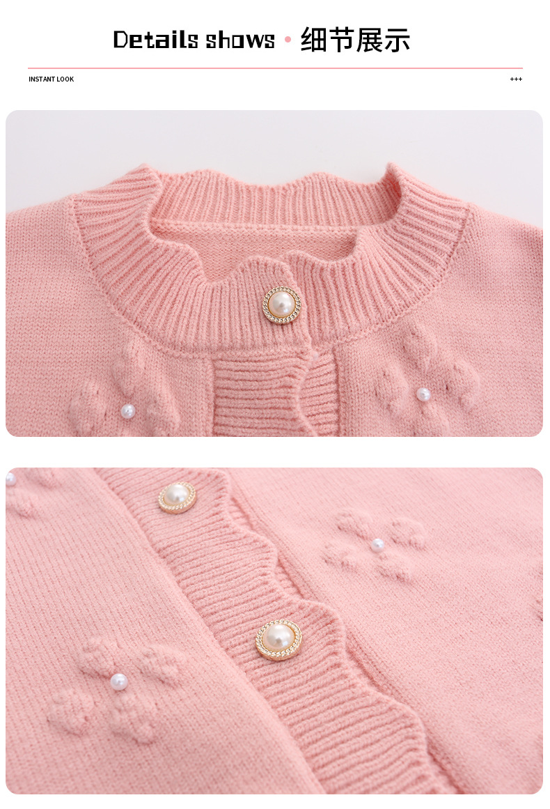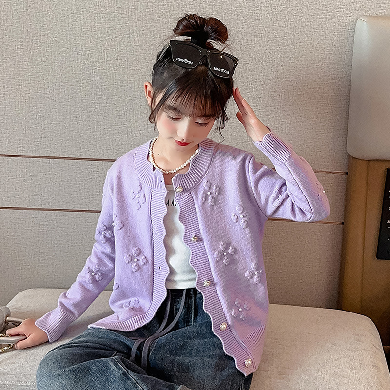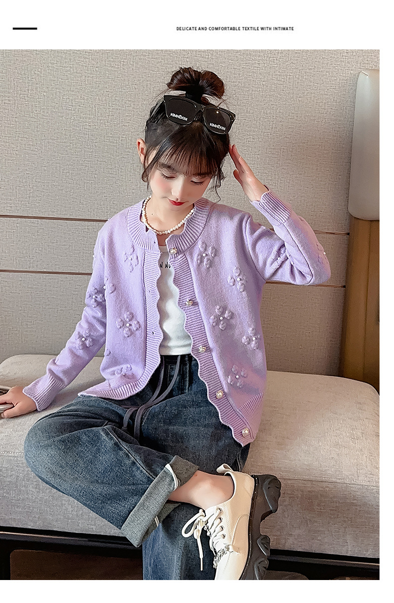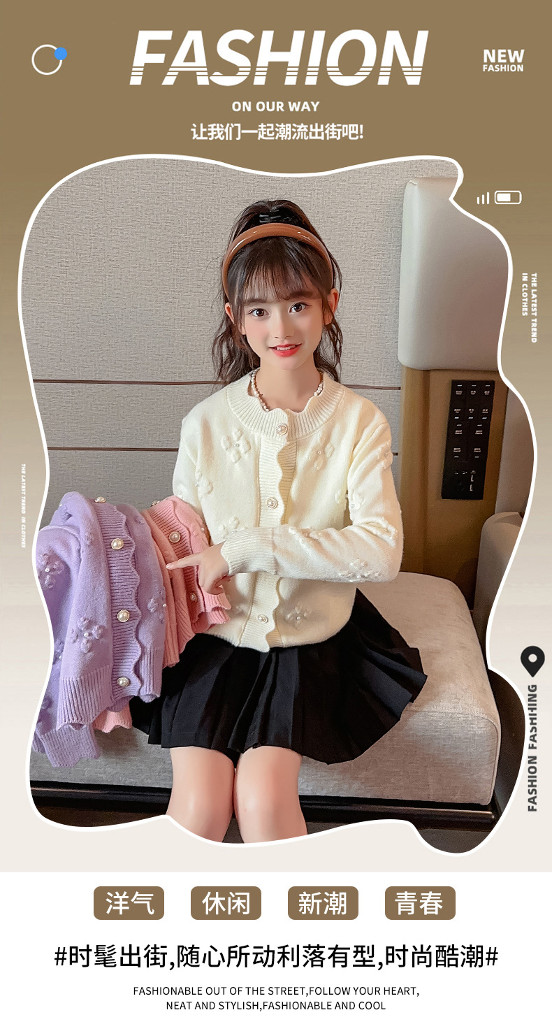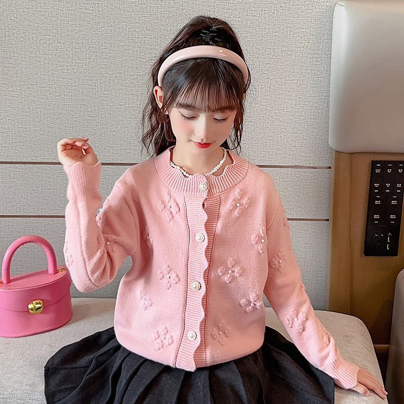 여아 니트 가디건 봄과 가을 2023 새로운 어린이 스웨터 코트 세련된 세련된 라운드 넥 스웨터