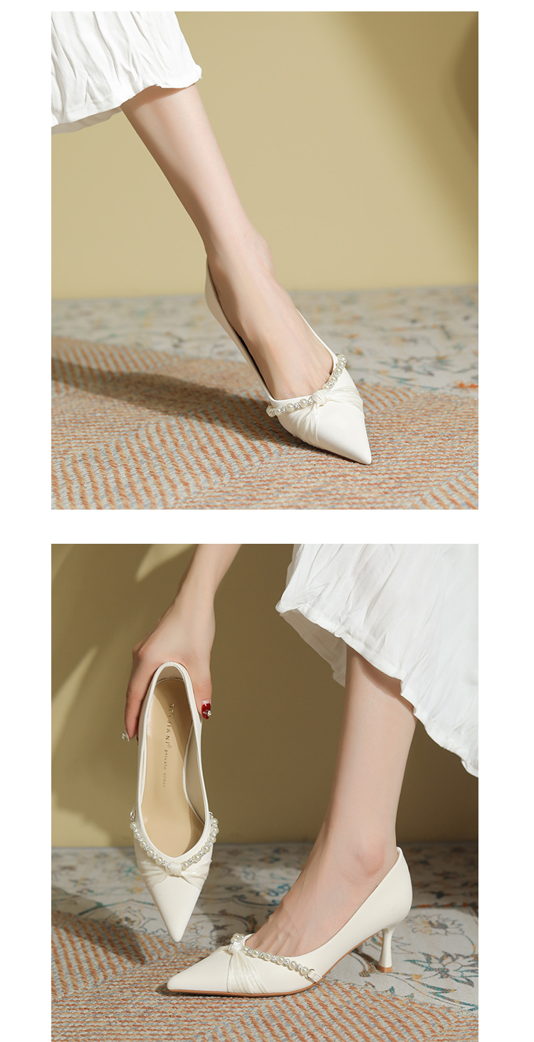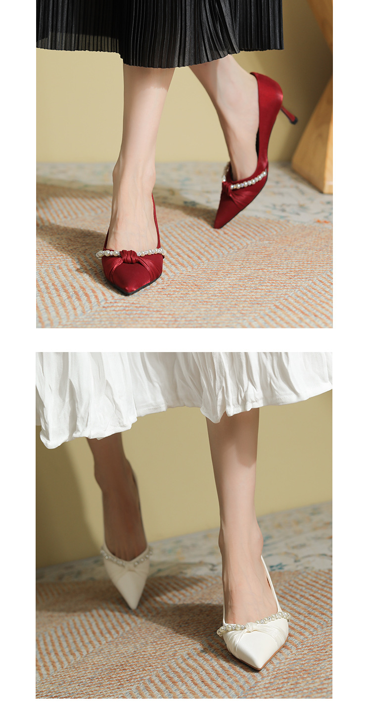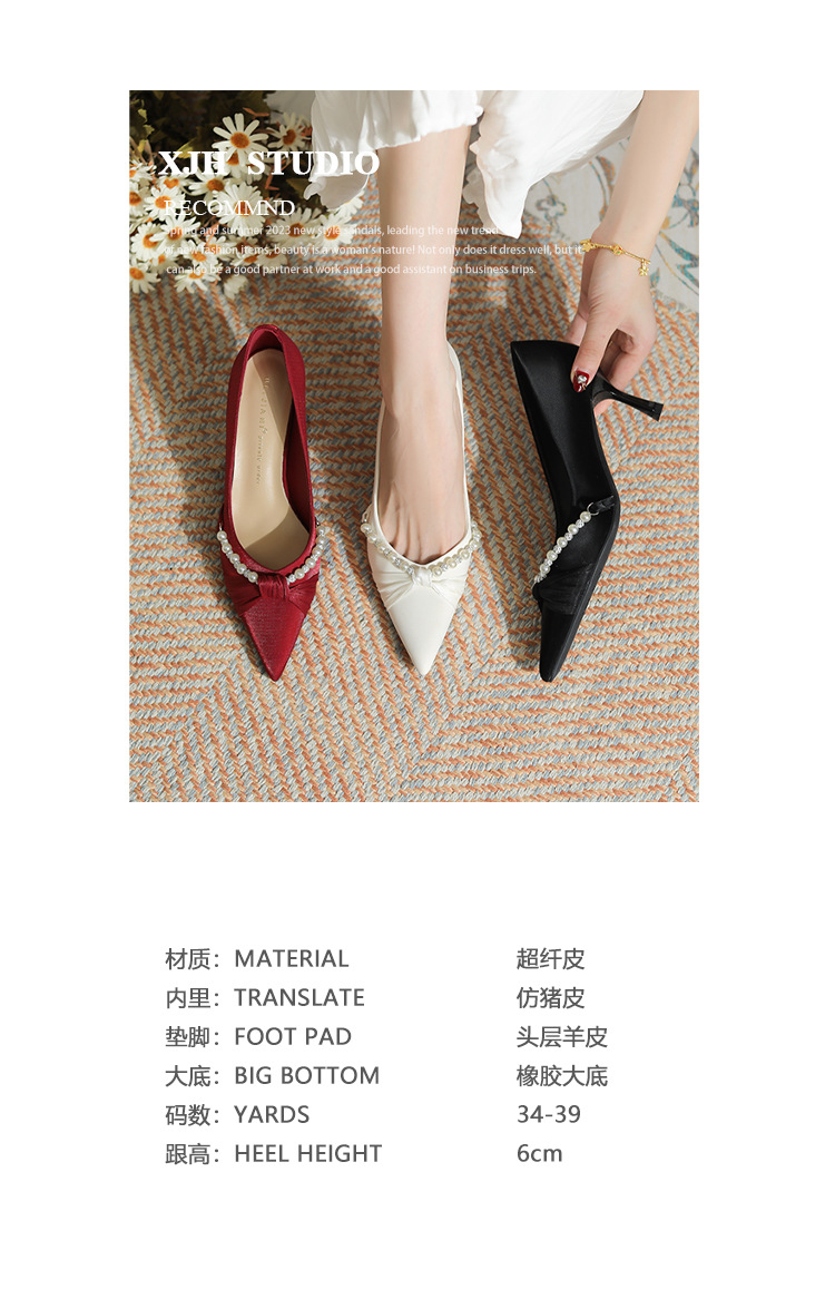 3356-1 꼬임 진주 Xiuhe 웨딩 슈즈 여성용 신부 신발 새틴 양가죽 우아한 하이힐 뾰족한 얇은 굽 단일 신발