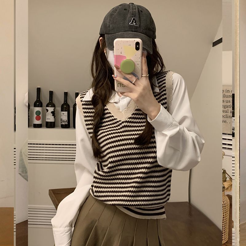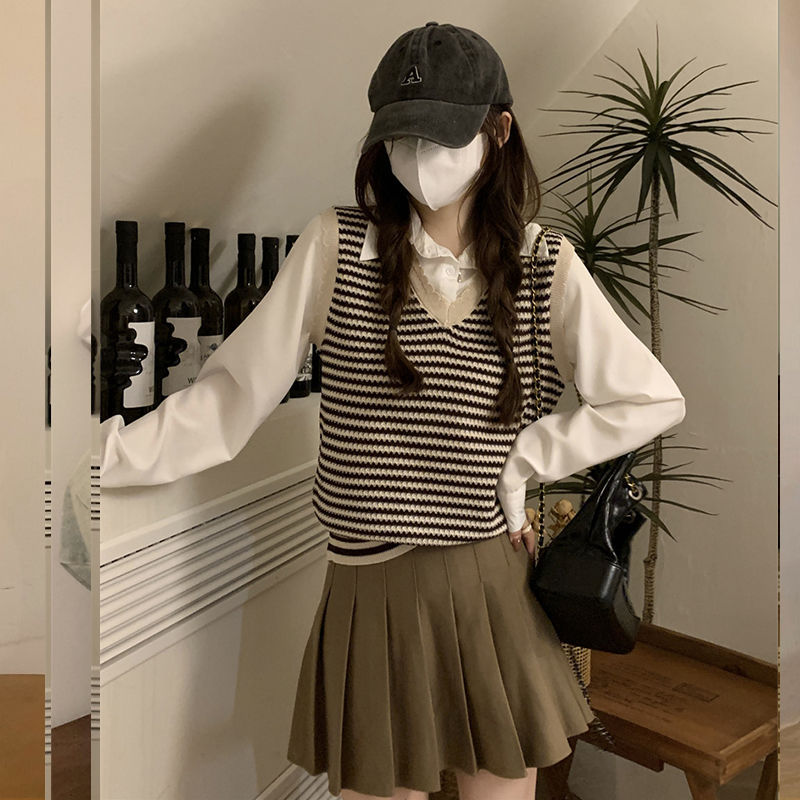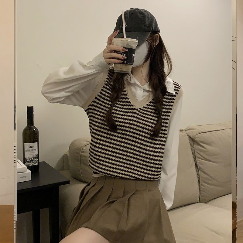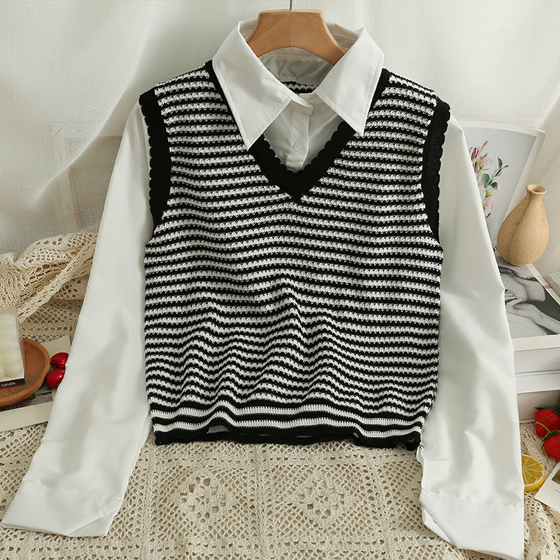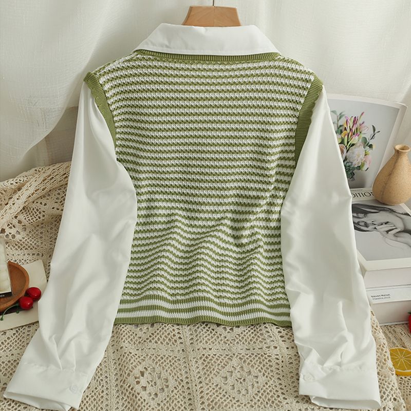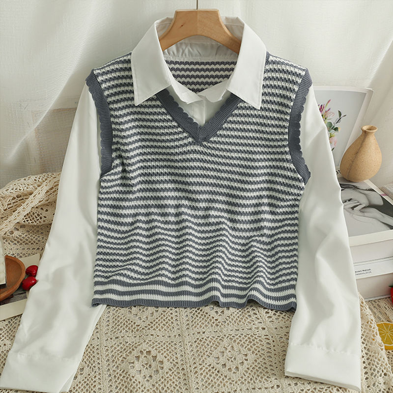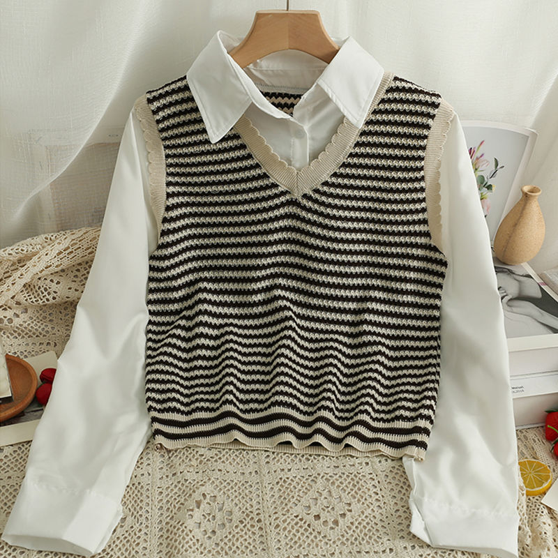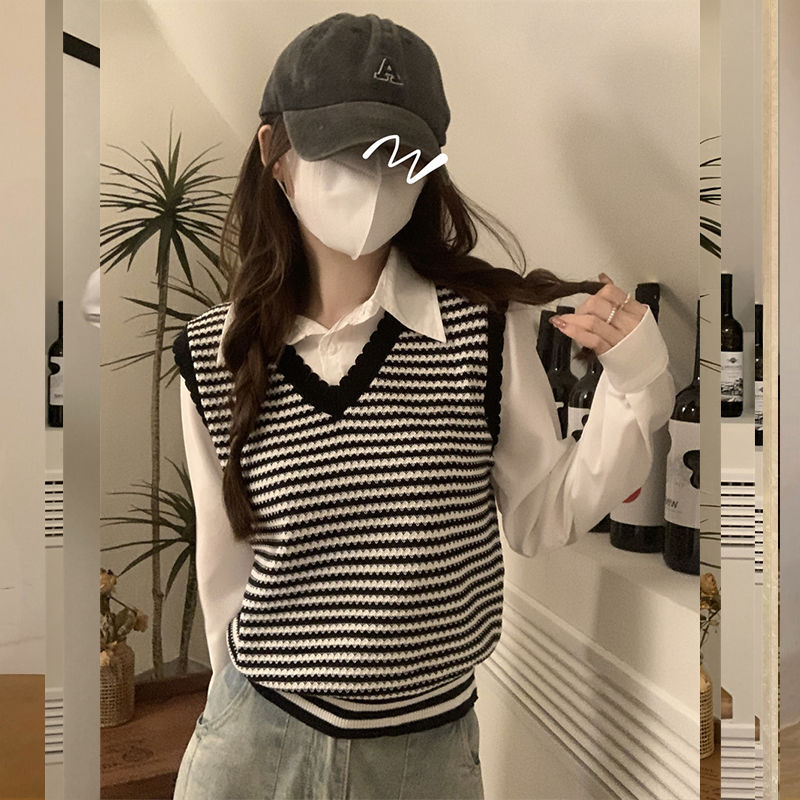 프랑스 스타일 나이를 줄이는 달콤한 디자인 스트라이프 페이크 투피스 니트 티셔츠 여성용 가을 스티칭 쉬폰 모든 매치 탑