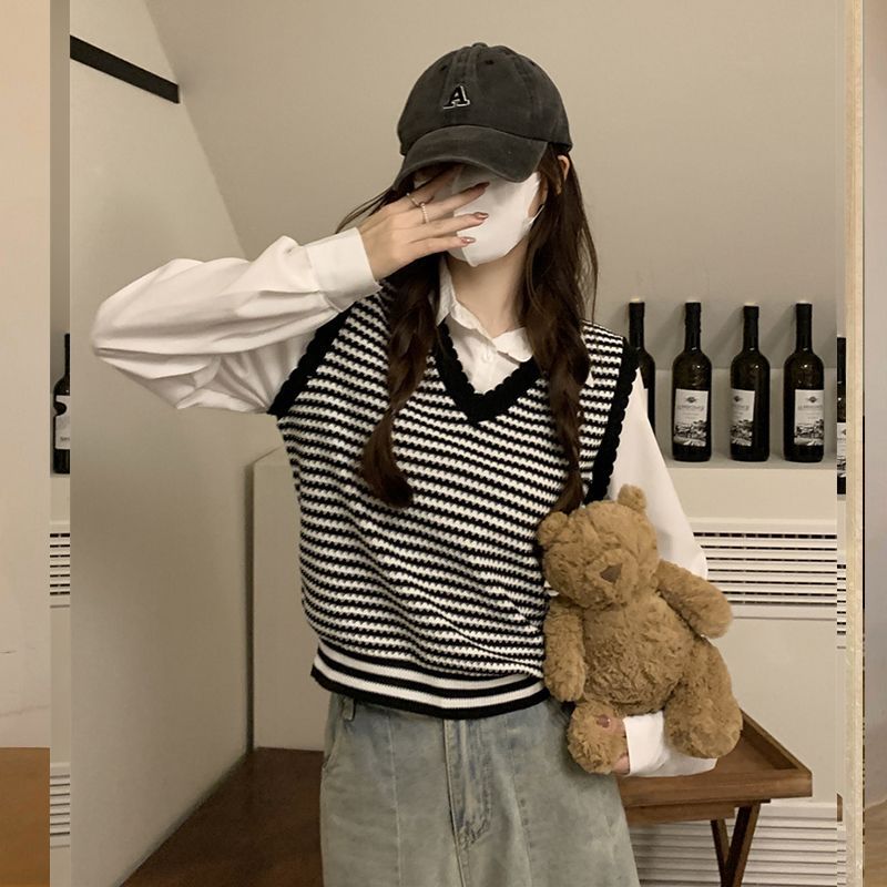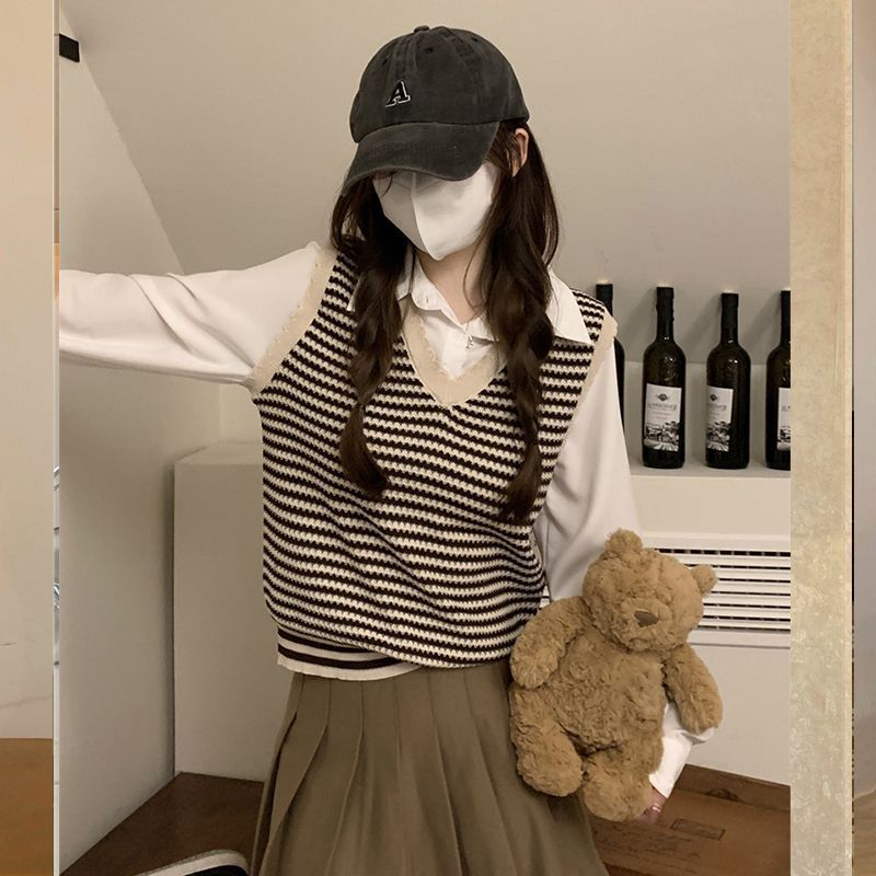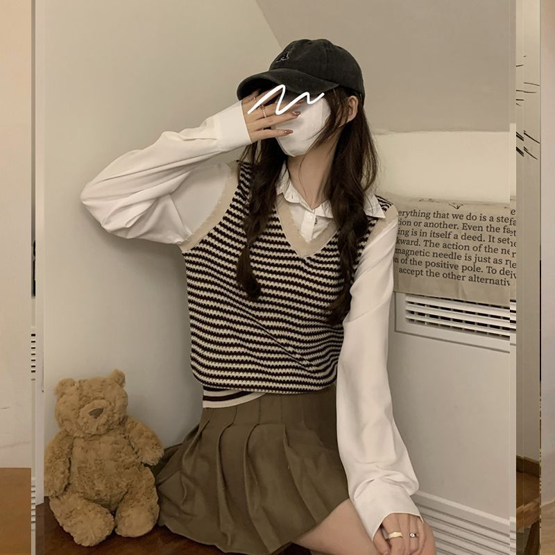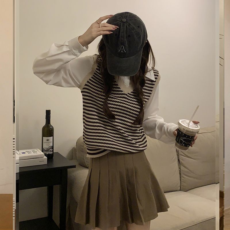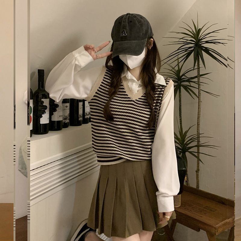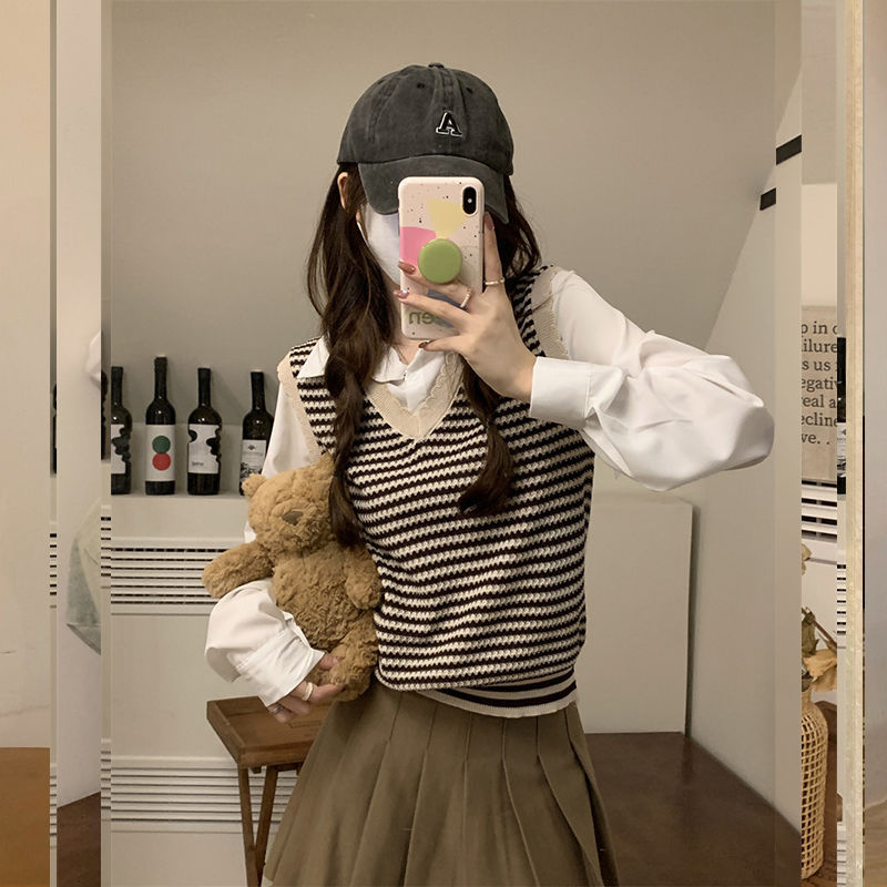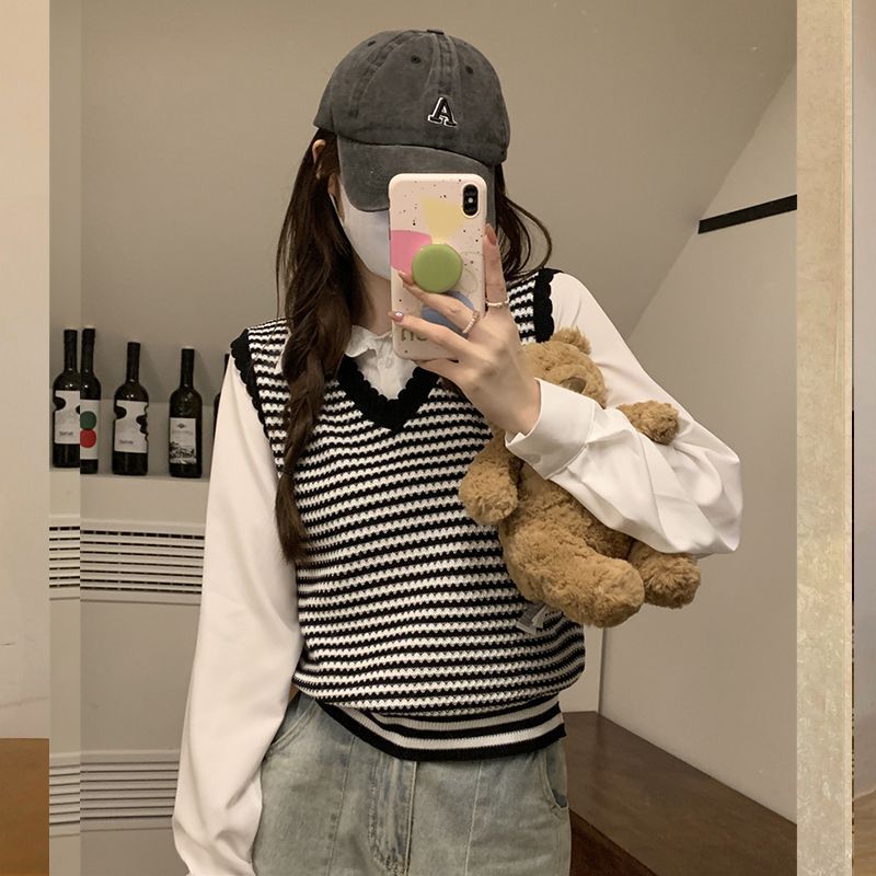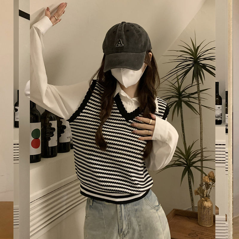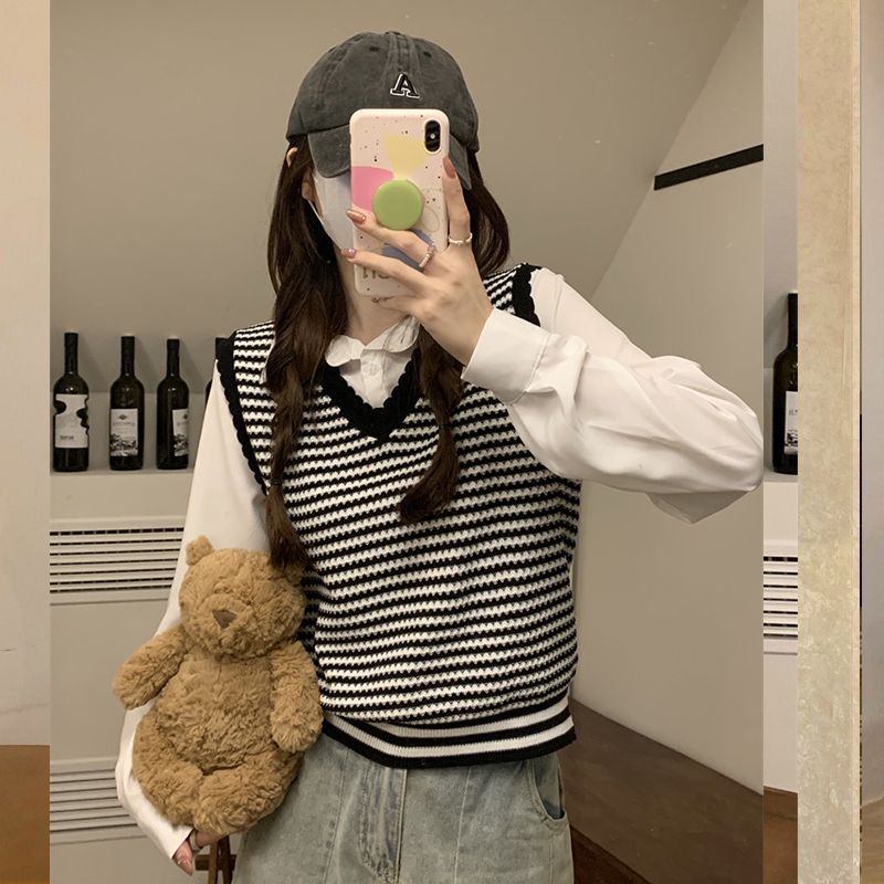 프랑스 스타일 나이를 줄이는 달콤한 디자인 스트라이프 페이크 투피스 니트 티셔츠 여성용 가을 스티칭 쉬폰 모든 매치 탑
