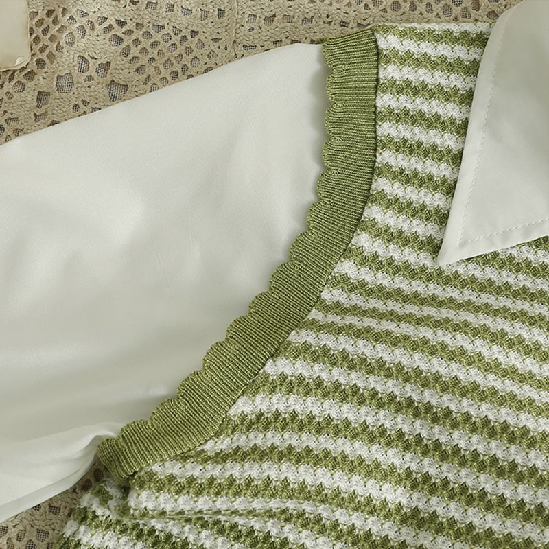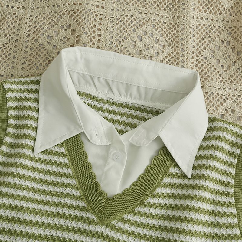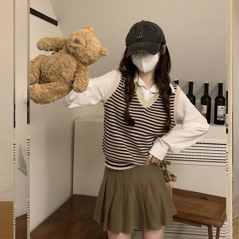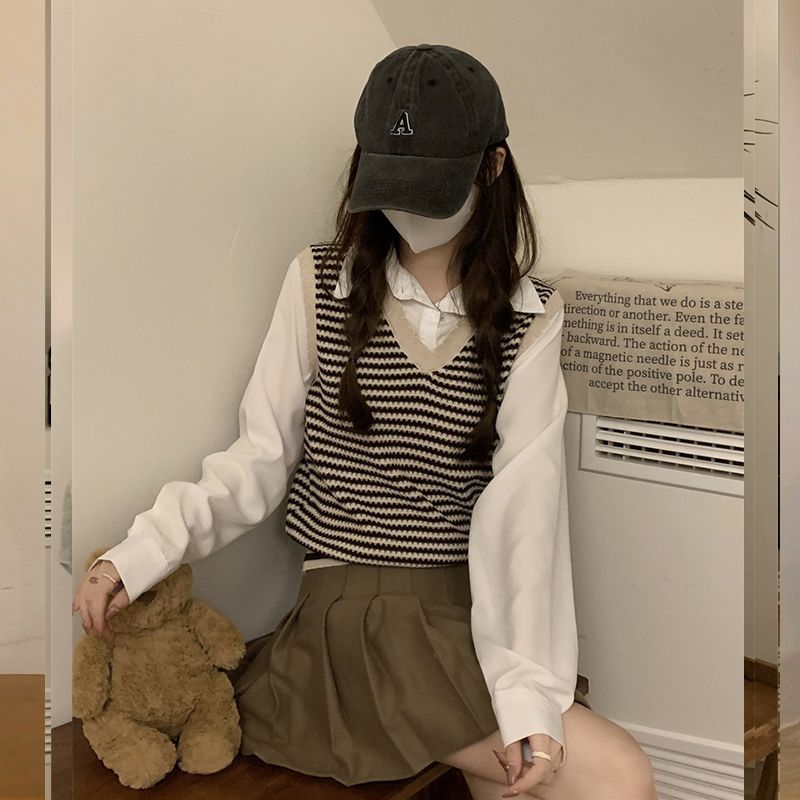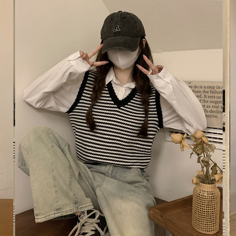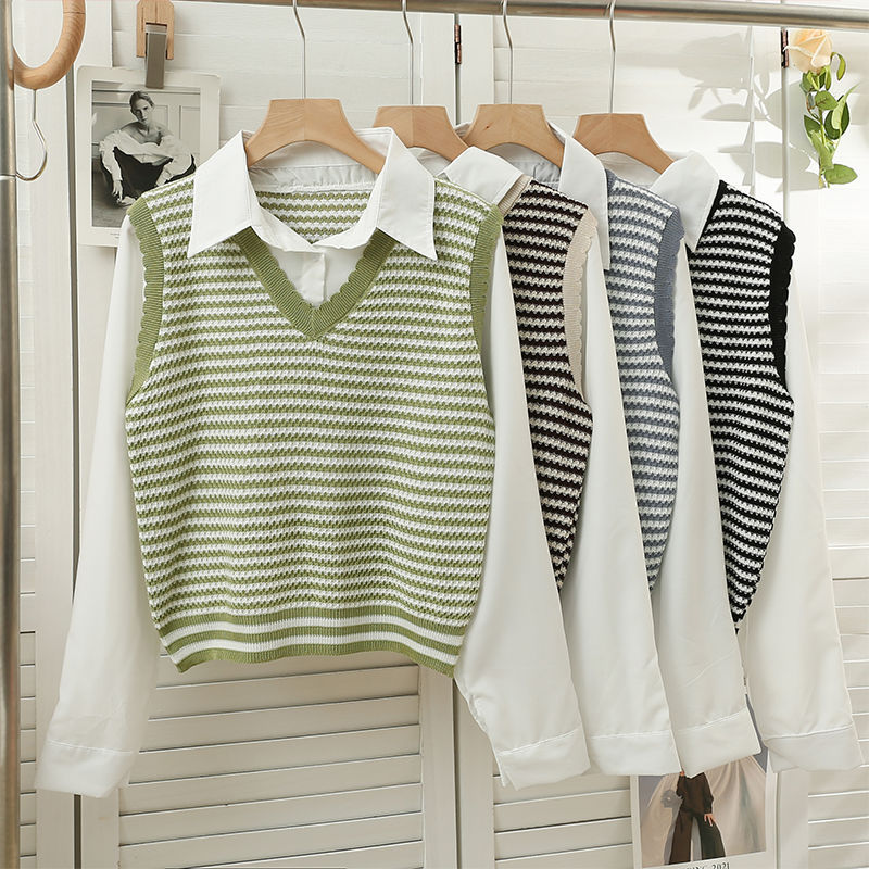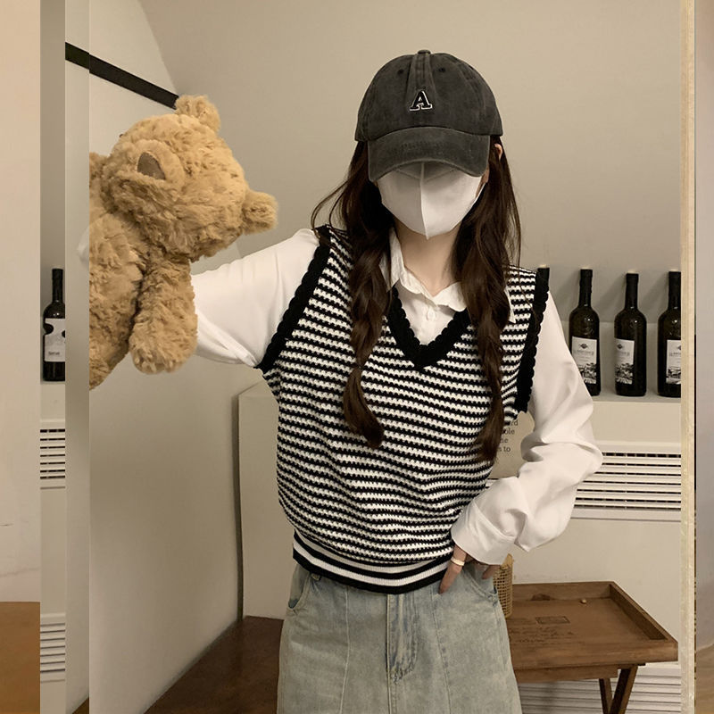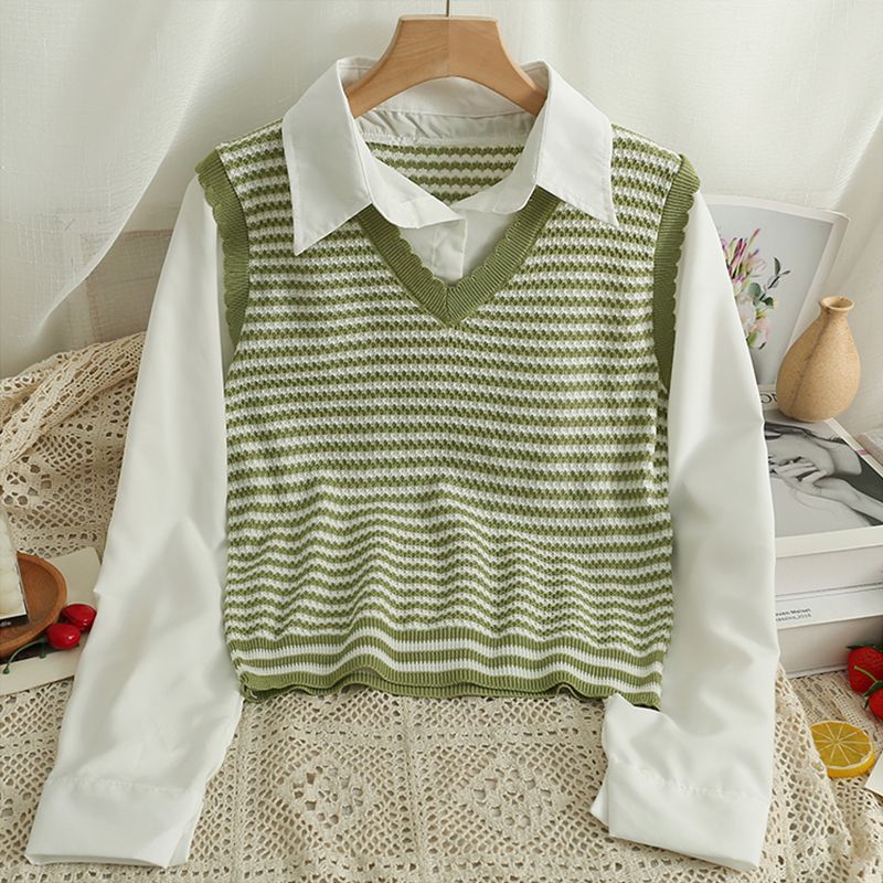 프랑스 스타일 나이를 줄이는 달콤한 디자인 스트라이프 페이크 투피스 니트 티셔츠 여성용 가을 스티칭 쉬폰 모든 매치 탑