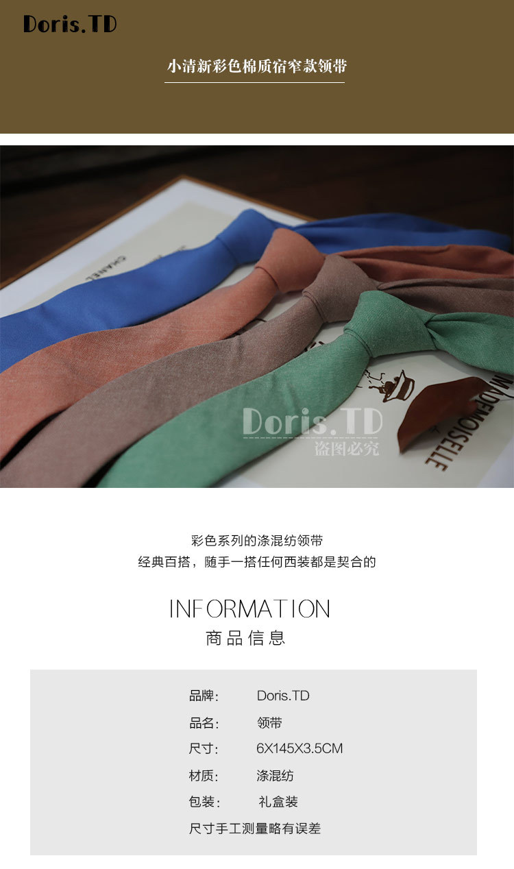 공장 재고 도매 도파민 스타일 작은 신선한 색상 면 롯지 좁은 넥타이 남자와 여자의 캐주얼 스타일 6cm스토어 가기