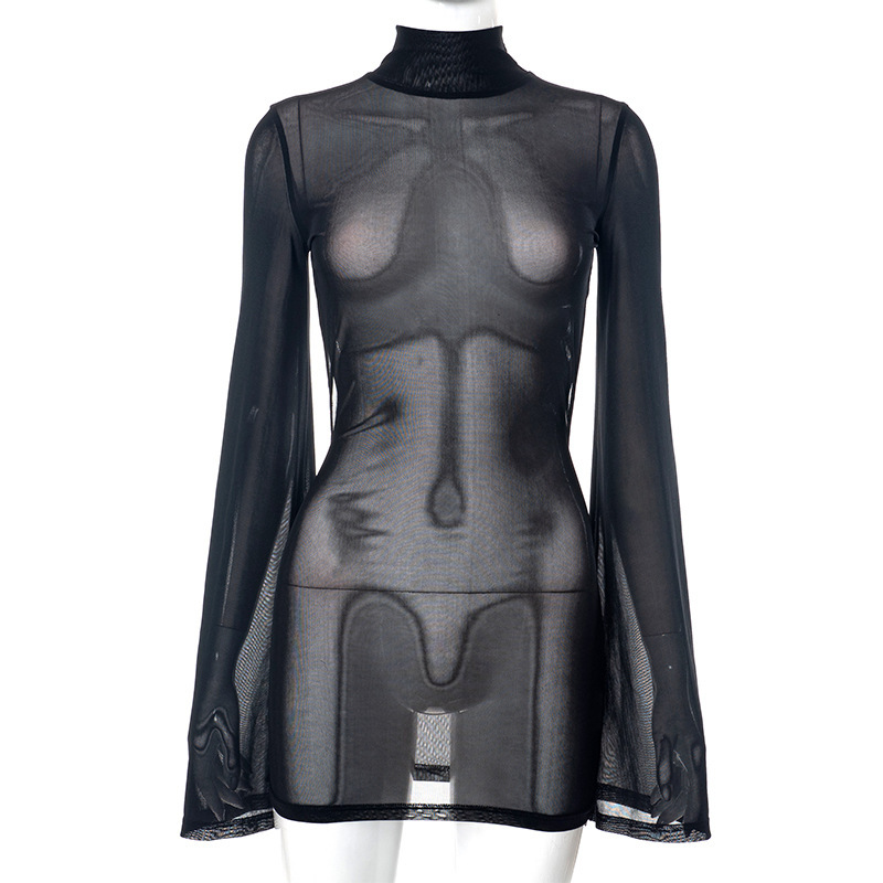 대외 무역 국경 패션 여름 새로운 여성의 등이없는 메쉬 혼 소매 짧은 섹시한 소녀 엉덩이 원피스