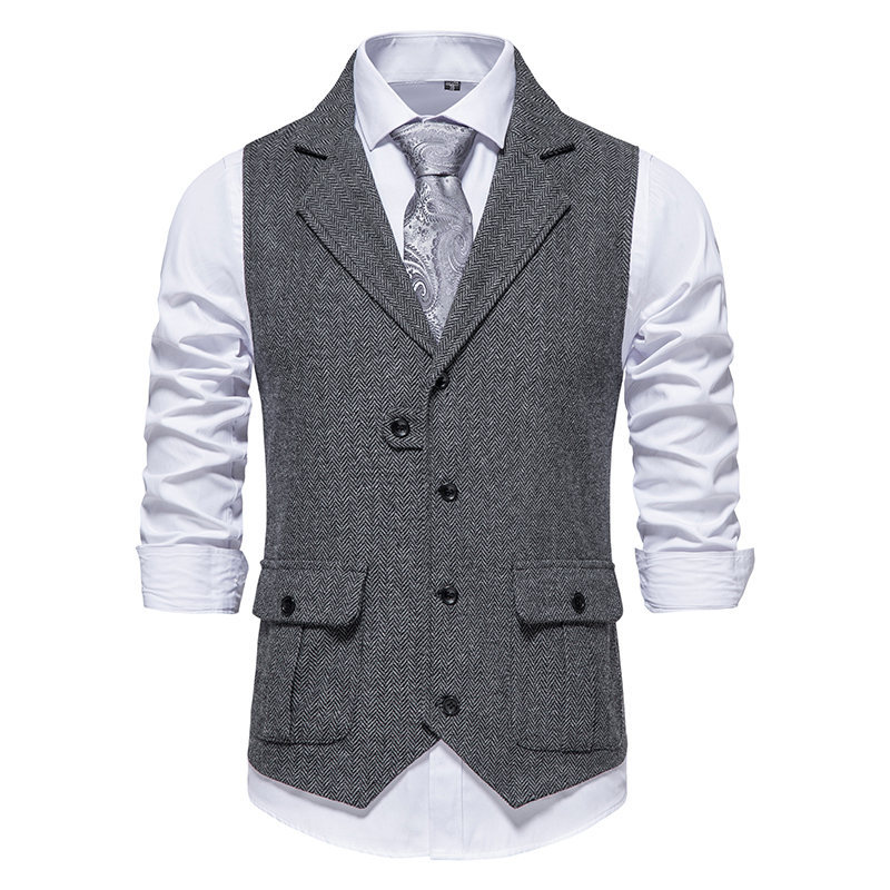 24 크로스보더 남성복 남성용 헤링본 트위드 슈트 베스트 레트로 라펠 조끼 슬림핏 숏 스타일