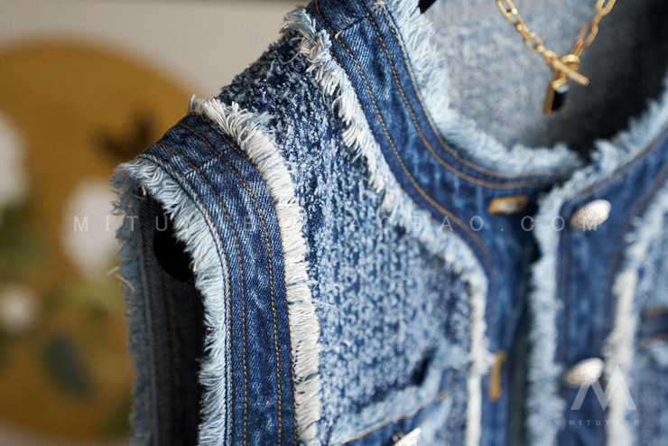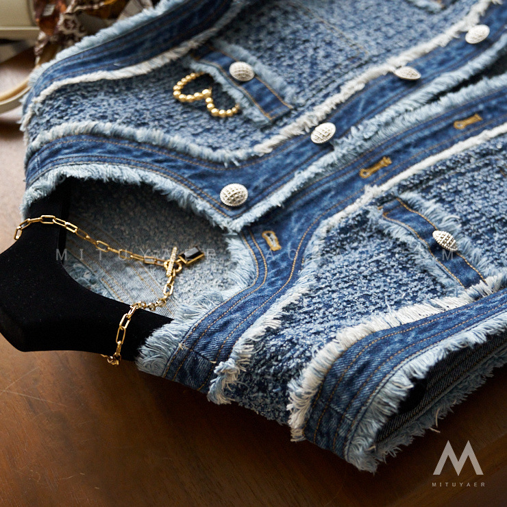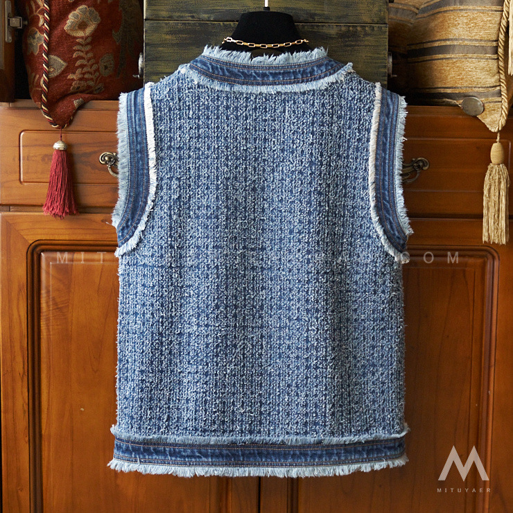 작은 샤넬 스타일 조끼 틈새 세련되고 섬세한 작은 샤넬 스타일 중공업 데님 조끼 여성 패션 여성 조끼