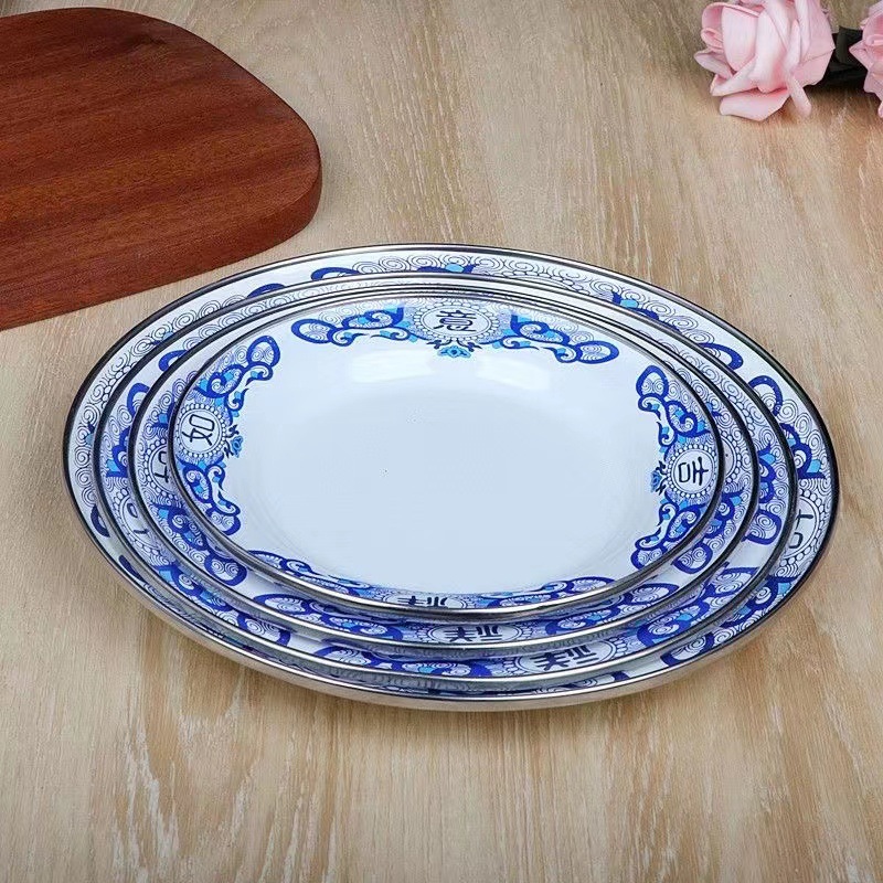 향수 복고풍 두꺼운 에나멜 플레이트 스테인레스 스틸 가장자리 레드 길조 Ruyi 접시 접시 냄비 딥 플레이트 스낵 플레이트스토어 가기