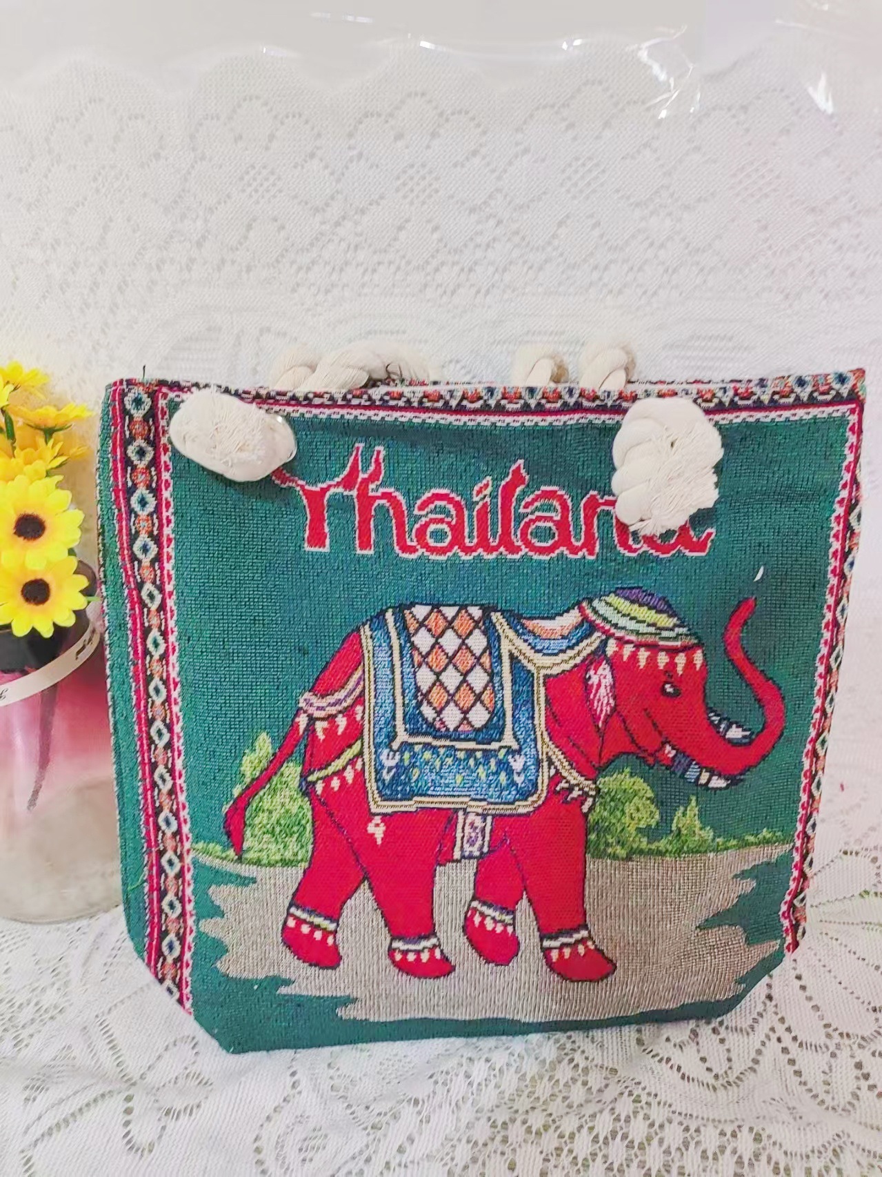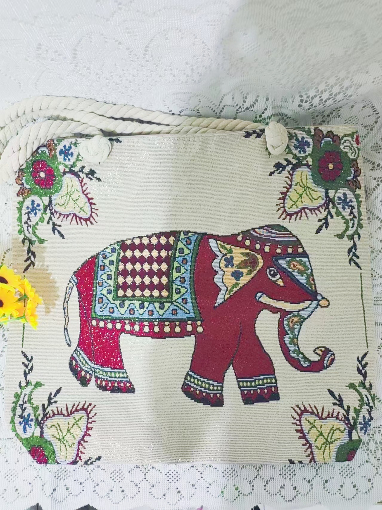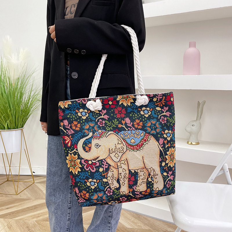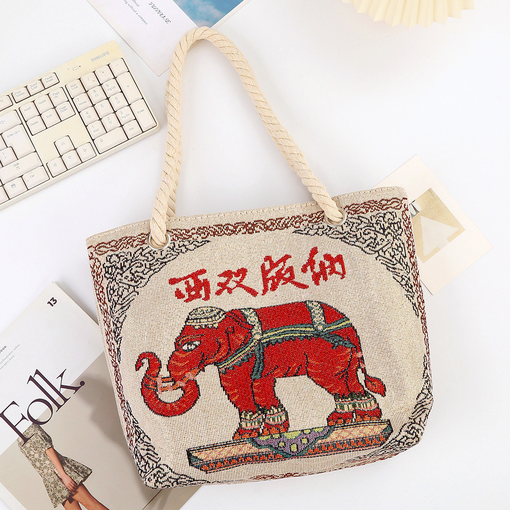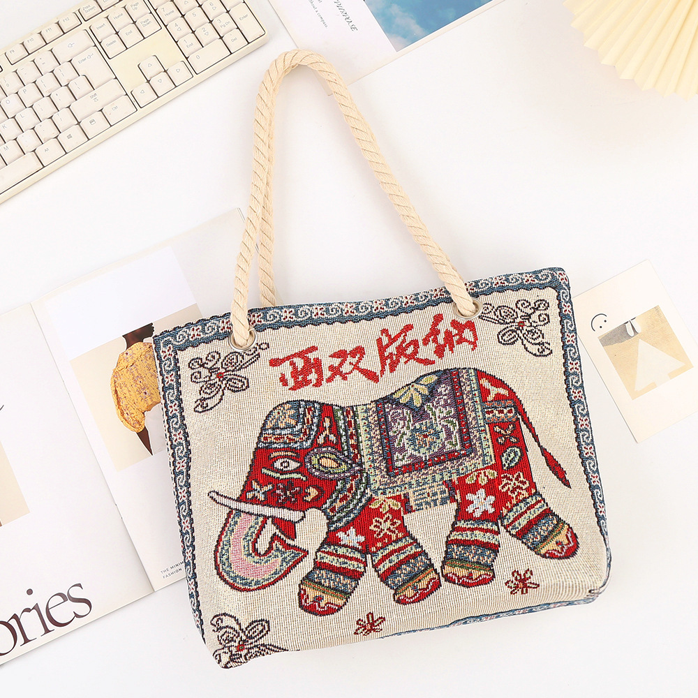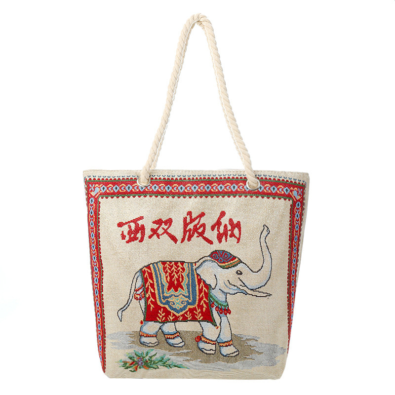 민족 스타일 중간 캔버스 가방 태국 양면 자수 코끼리 어깨 가방 여성 대용량 관광 명소 가방