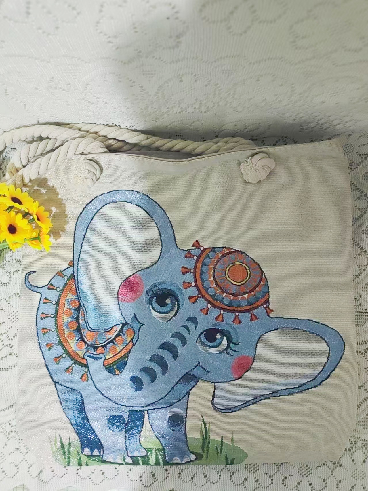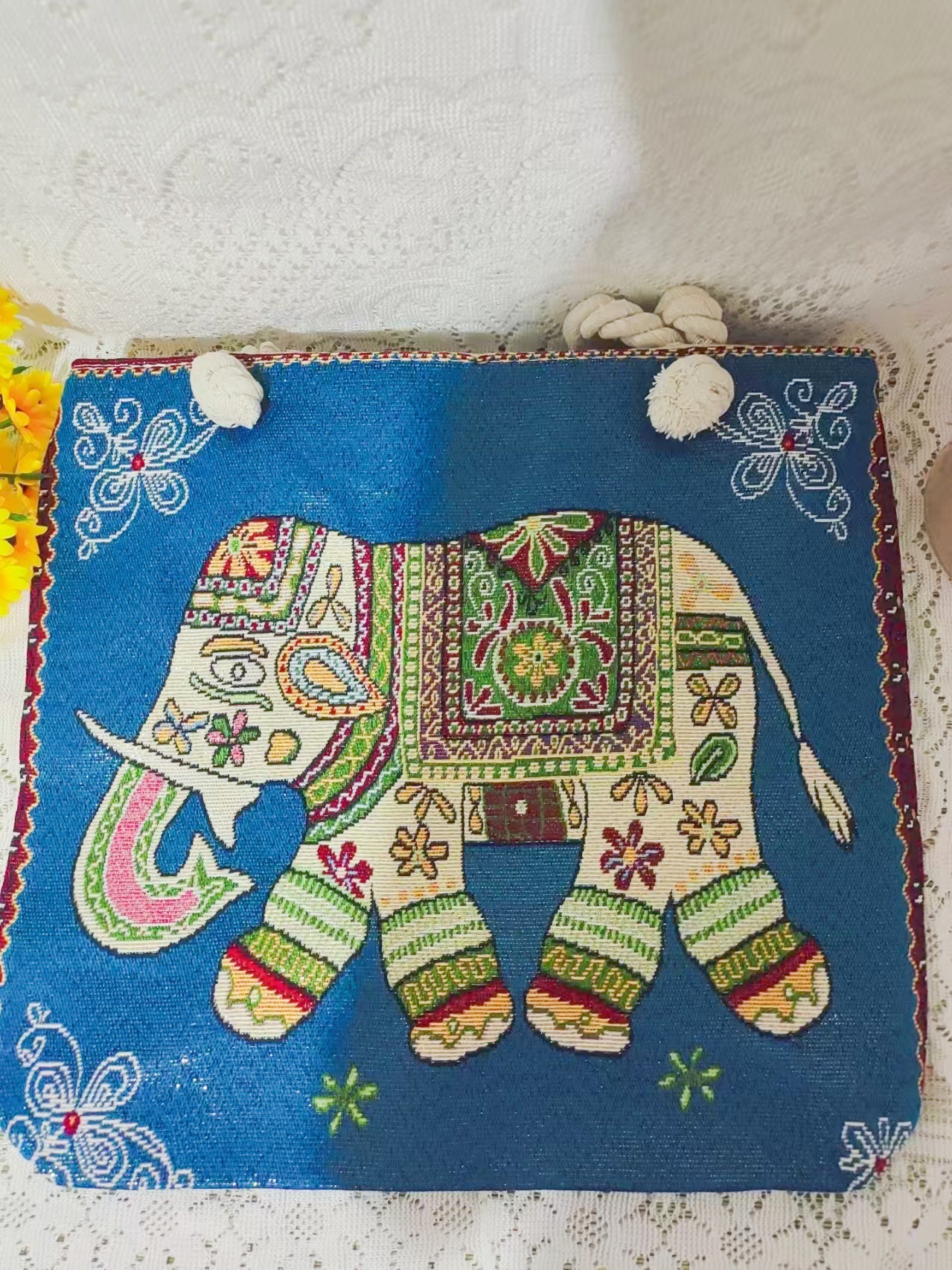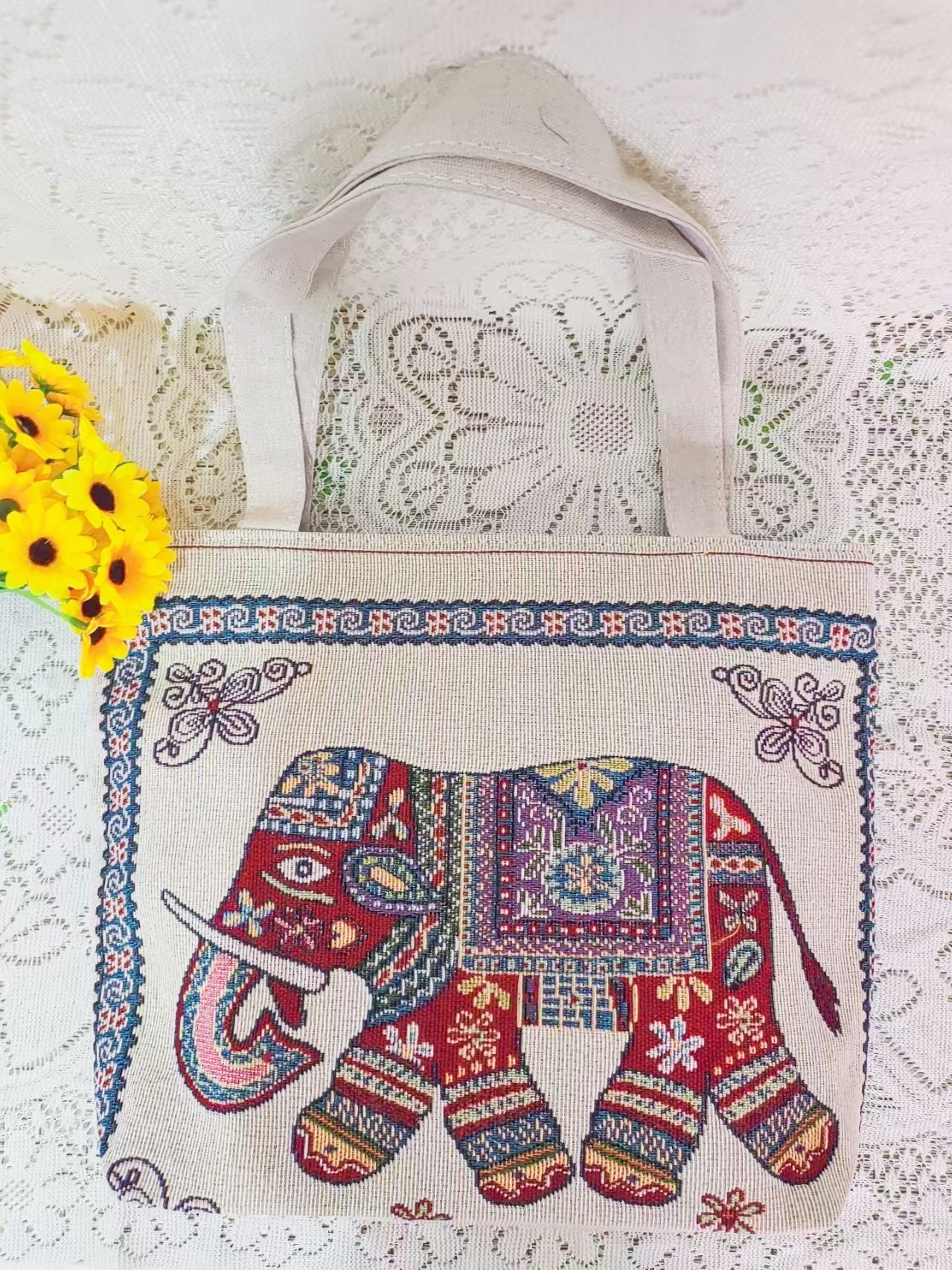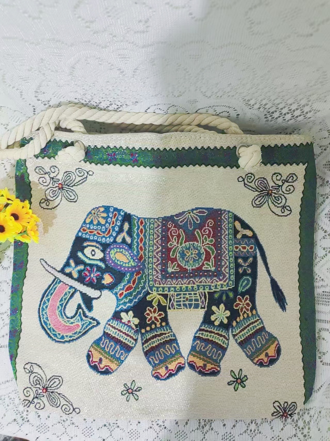 민족 스타일 중간 캔버스 가방 태국 양면 자수 코끼리 어깨 가방 여성 대용량 관광 명소 가방