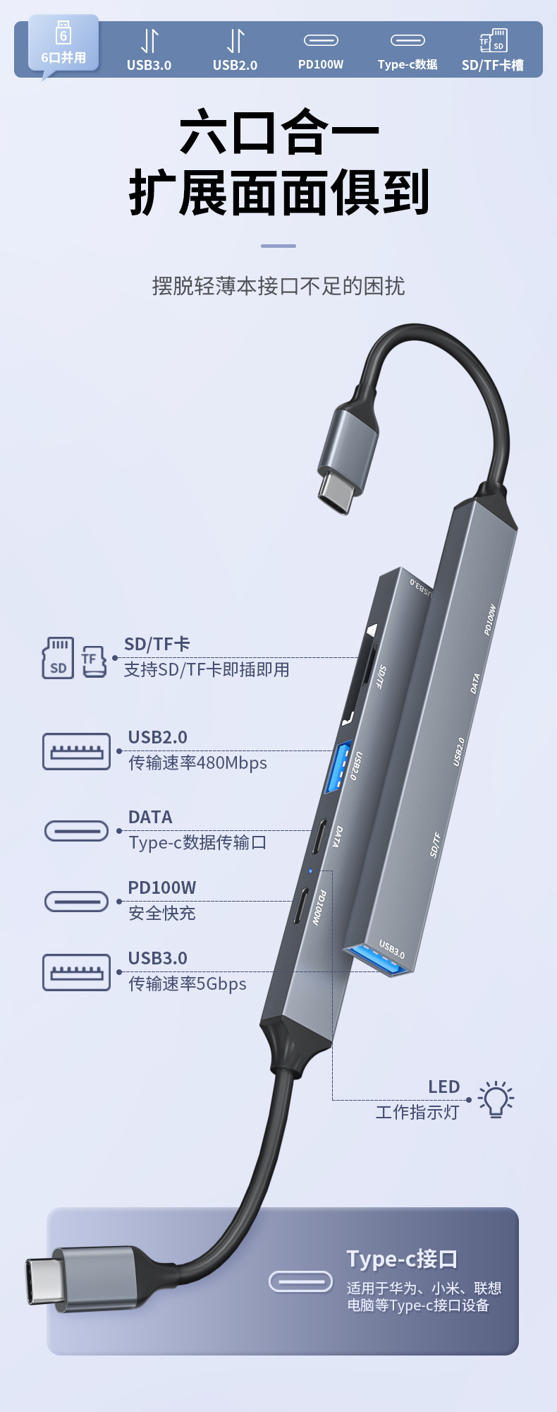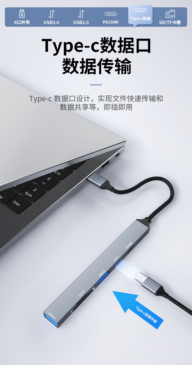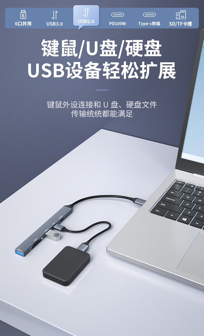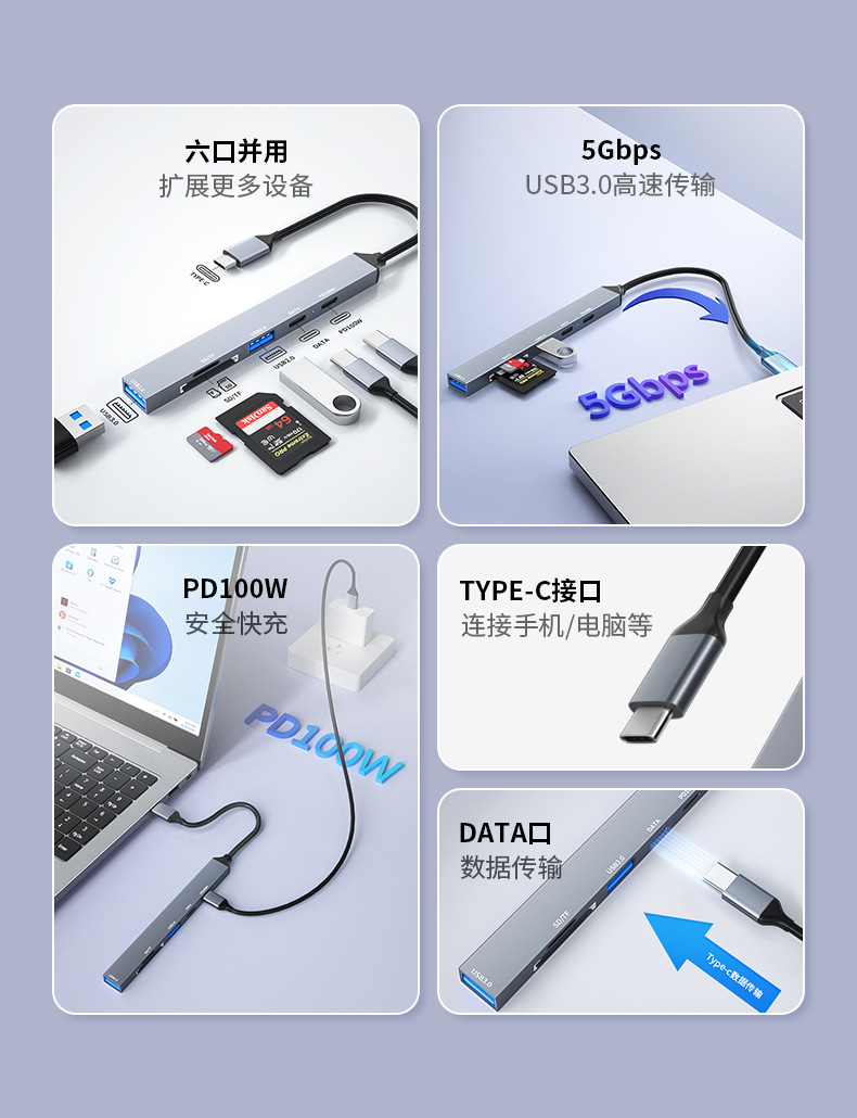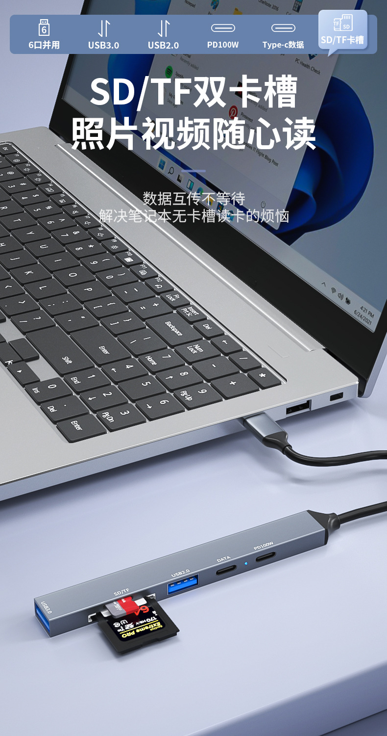 • USB2.0 + USB3.0 + Type-c 포트 + PD 고속 충전 + SD + TF [TYPE-C 식스 인 원]