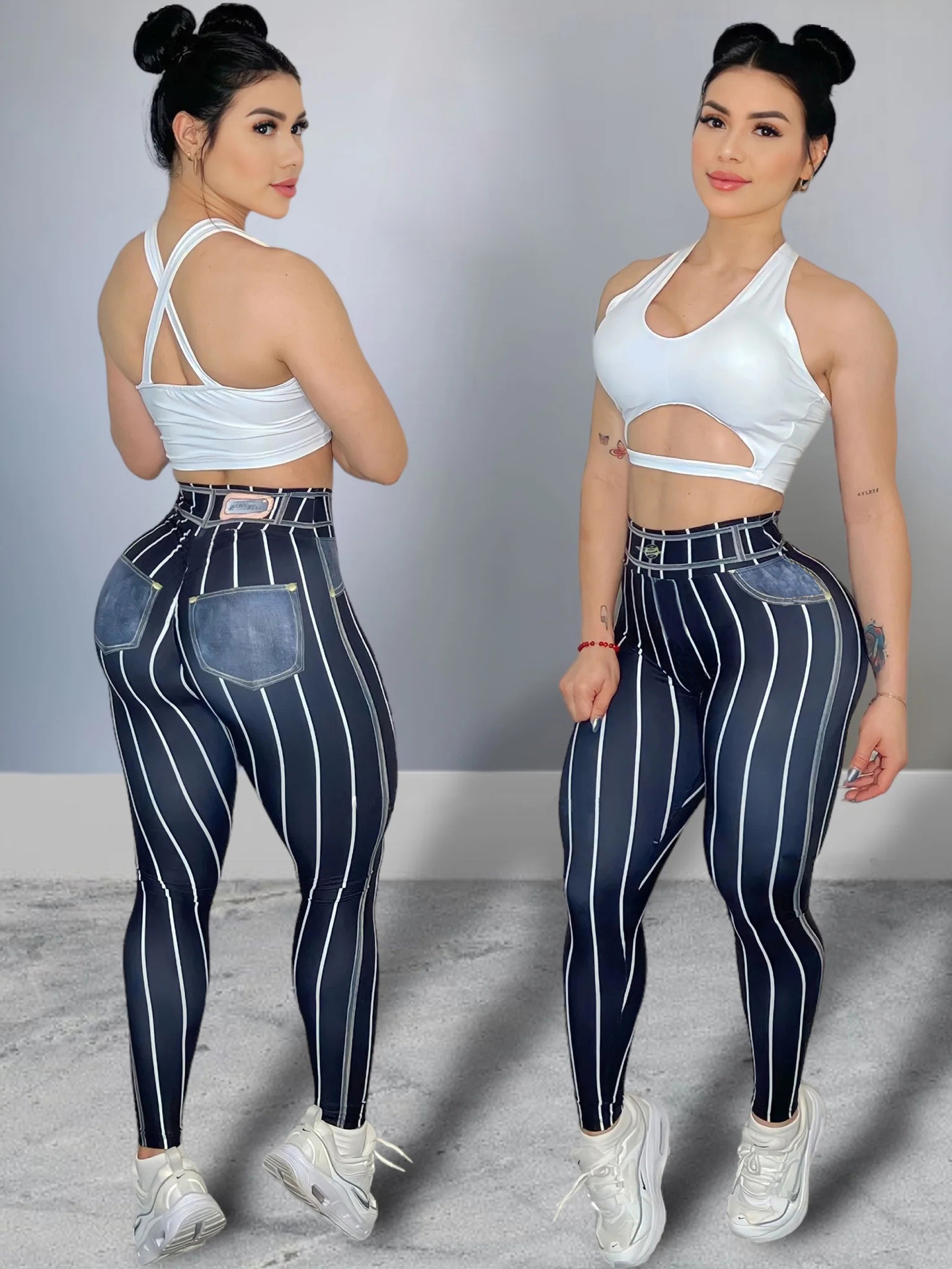 Temu 유럽과 미국 크로스 보더 폭발 모조 데님 라인 인쇄 요가 바지 높은 허리 섹시 유행 스포츠 피트니스 바지