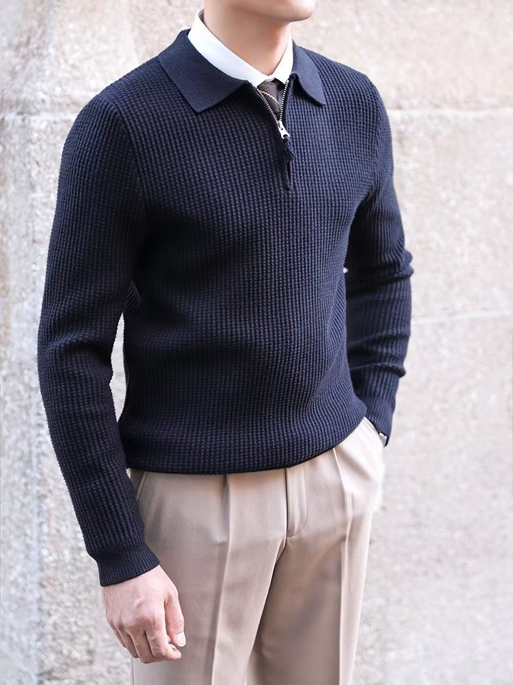 캐주얼 2023 스웨터 남자의 가을과 겨울 모든 경기 레트로 비즈니스 라펠베이스 스웨터 단색 슬림핏 지퍼 스웨터