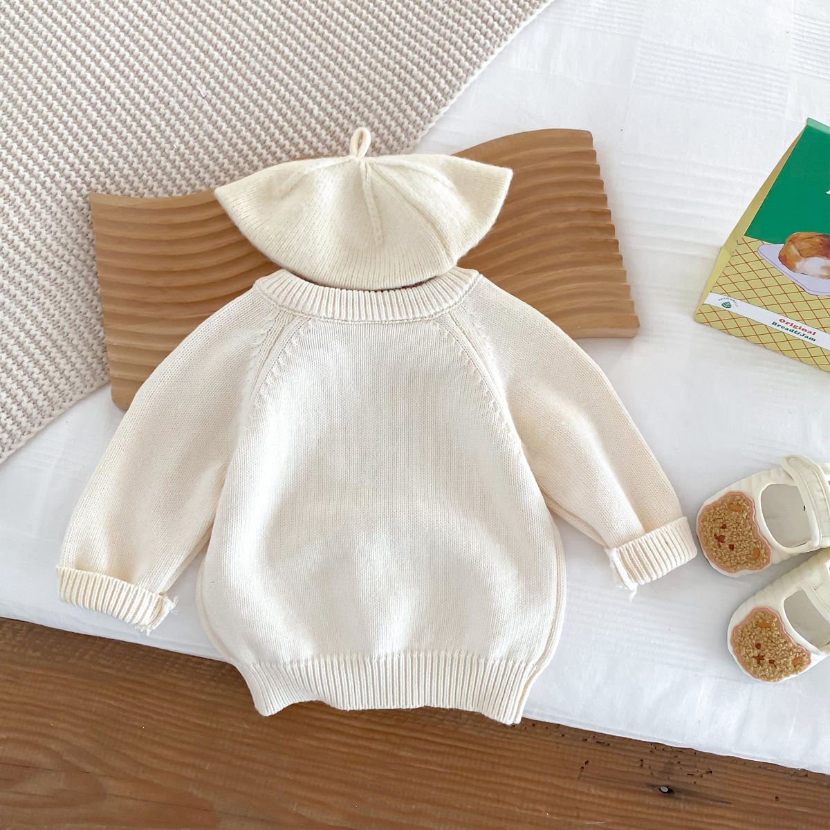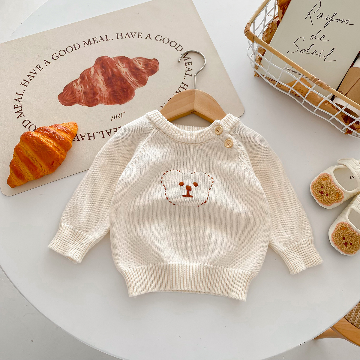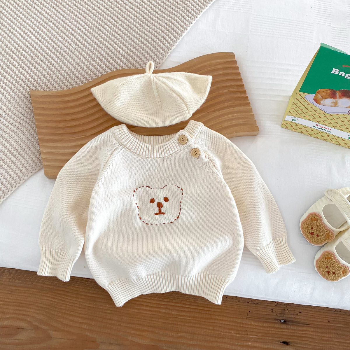 한국 스타일 인스풍 아기 긴팔 라운드넥 니트 어깨 버튼형 곰돌이 보온 스웨터 아기 가을 겨울옷
