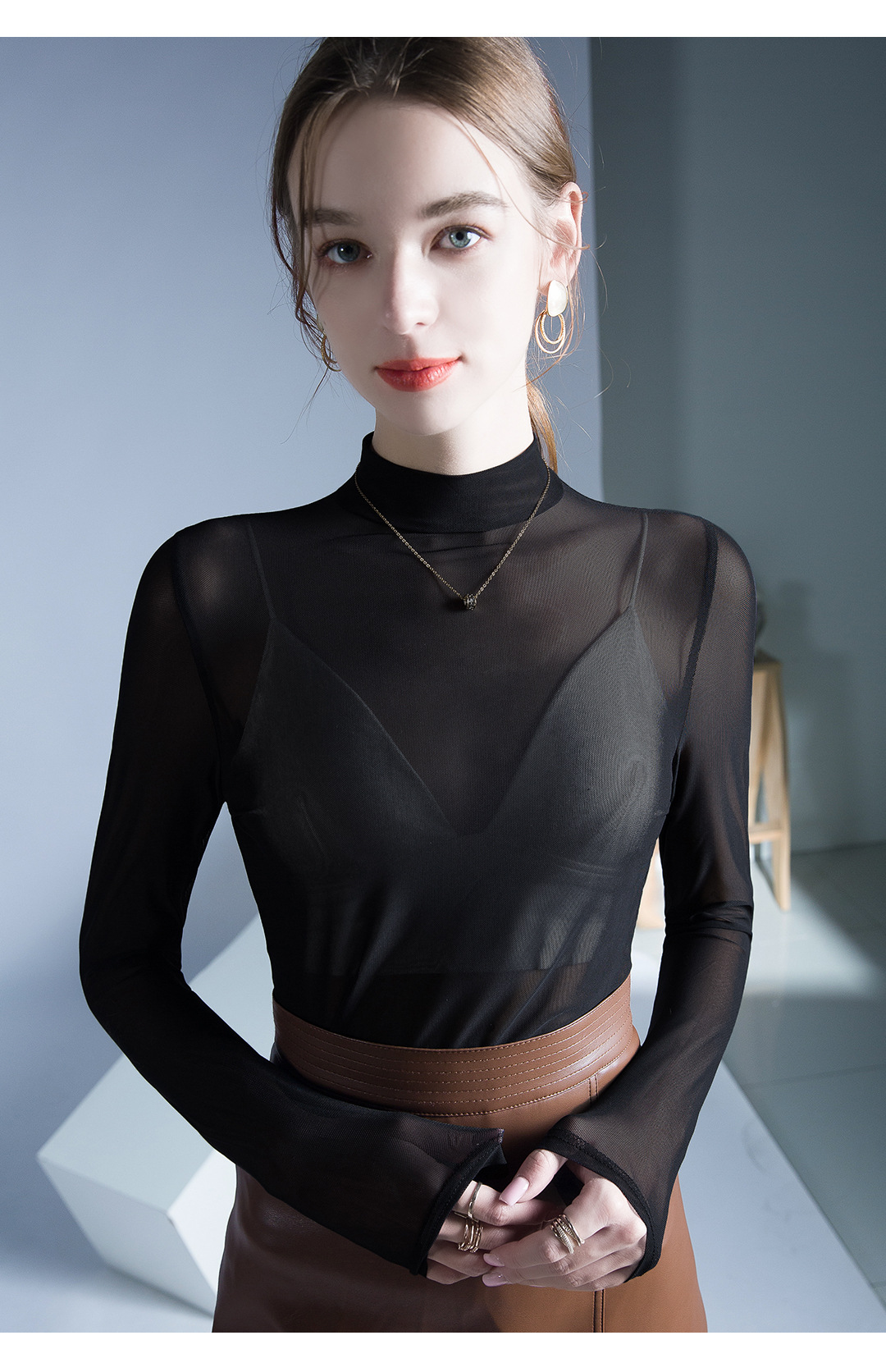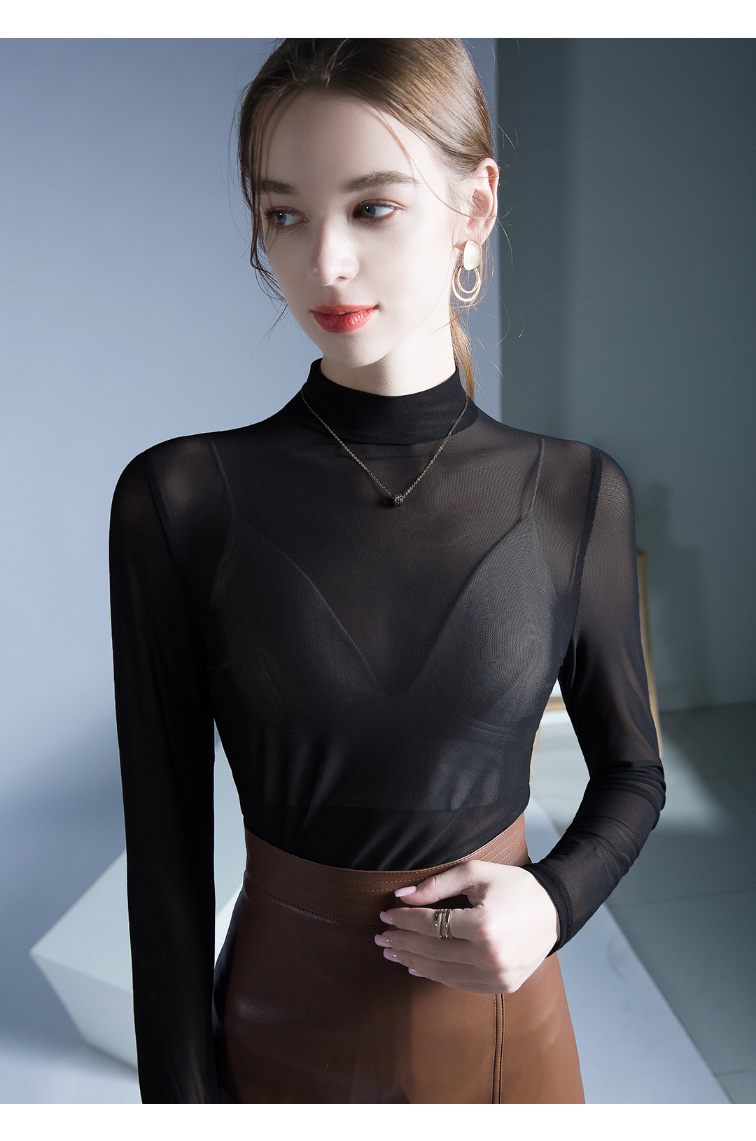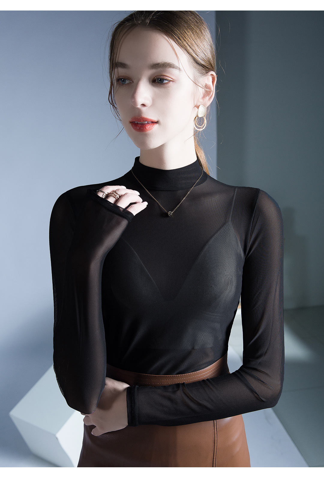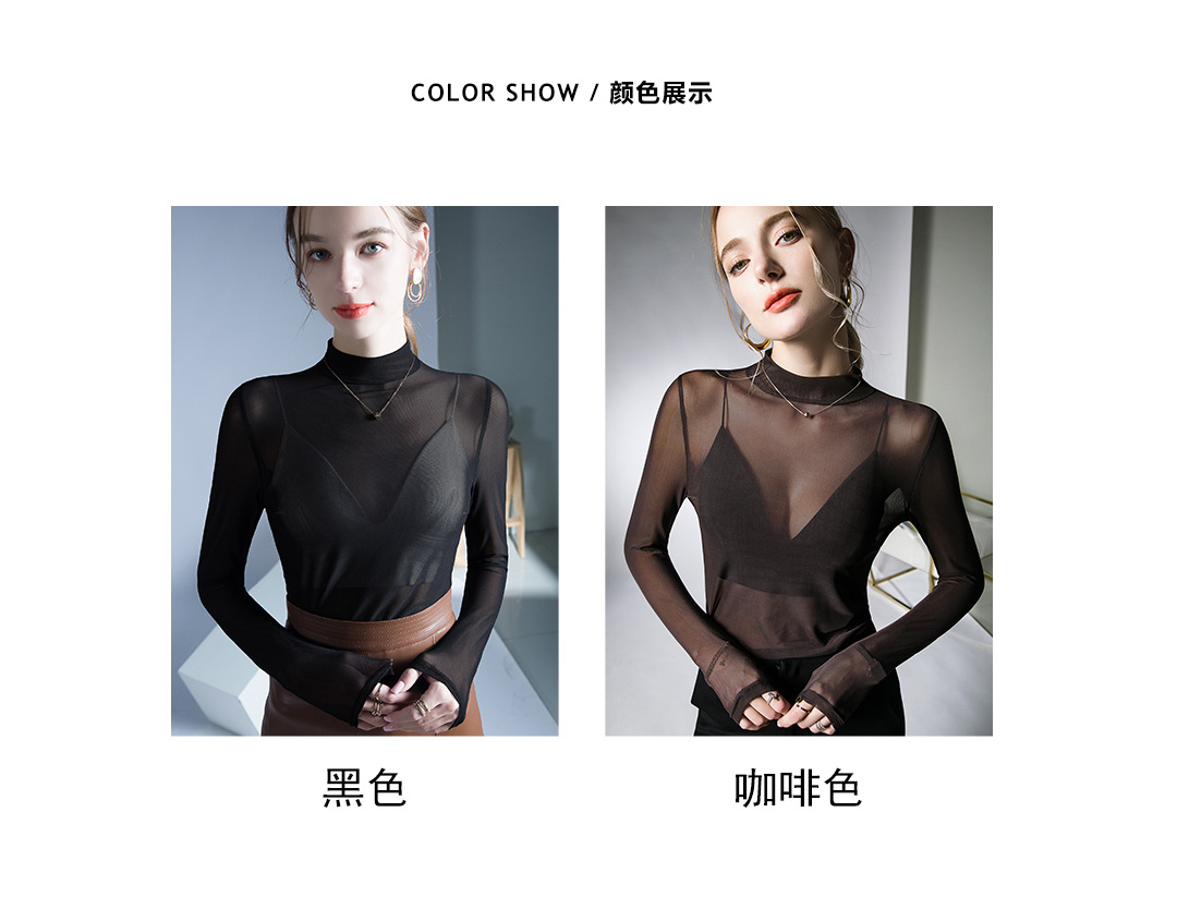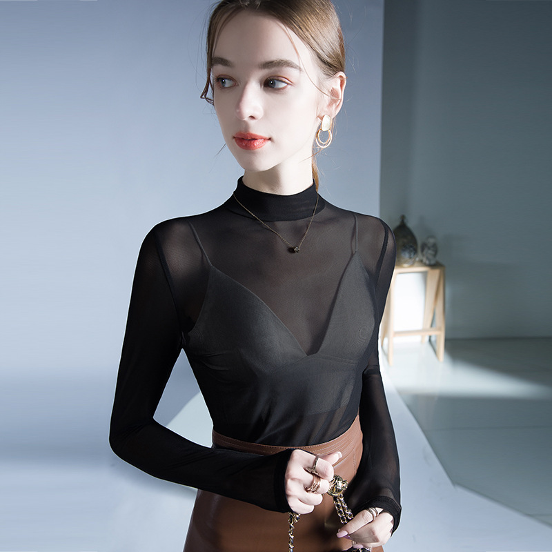 원근법을위한 트렌드 시계 탑 가을 새로운 유행 단색 메쉬 기본 셔츠 슬림 스트레치 티셔츠 작은 셔츠