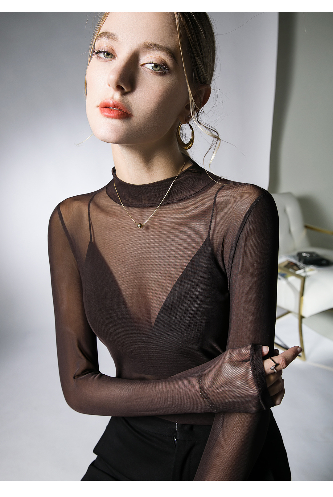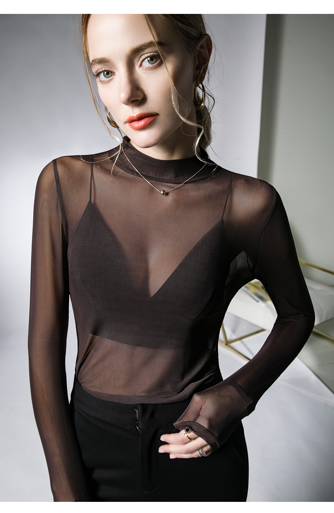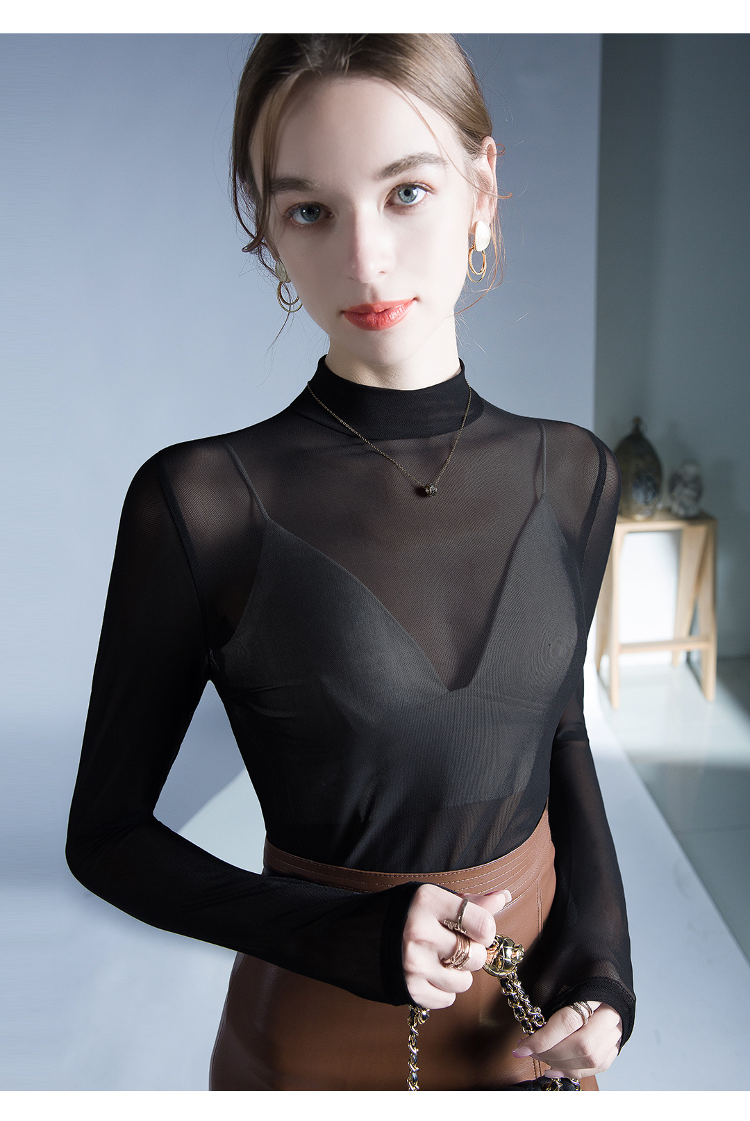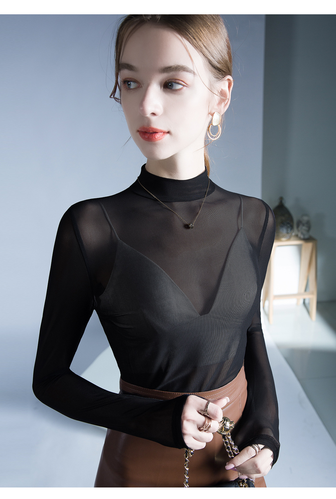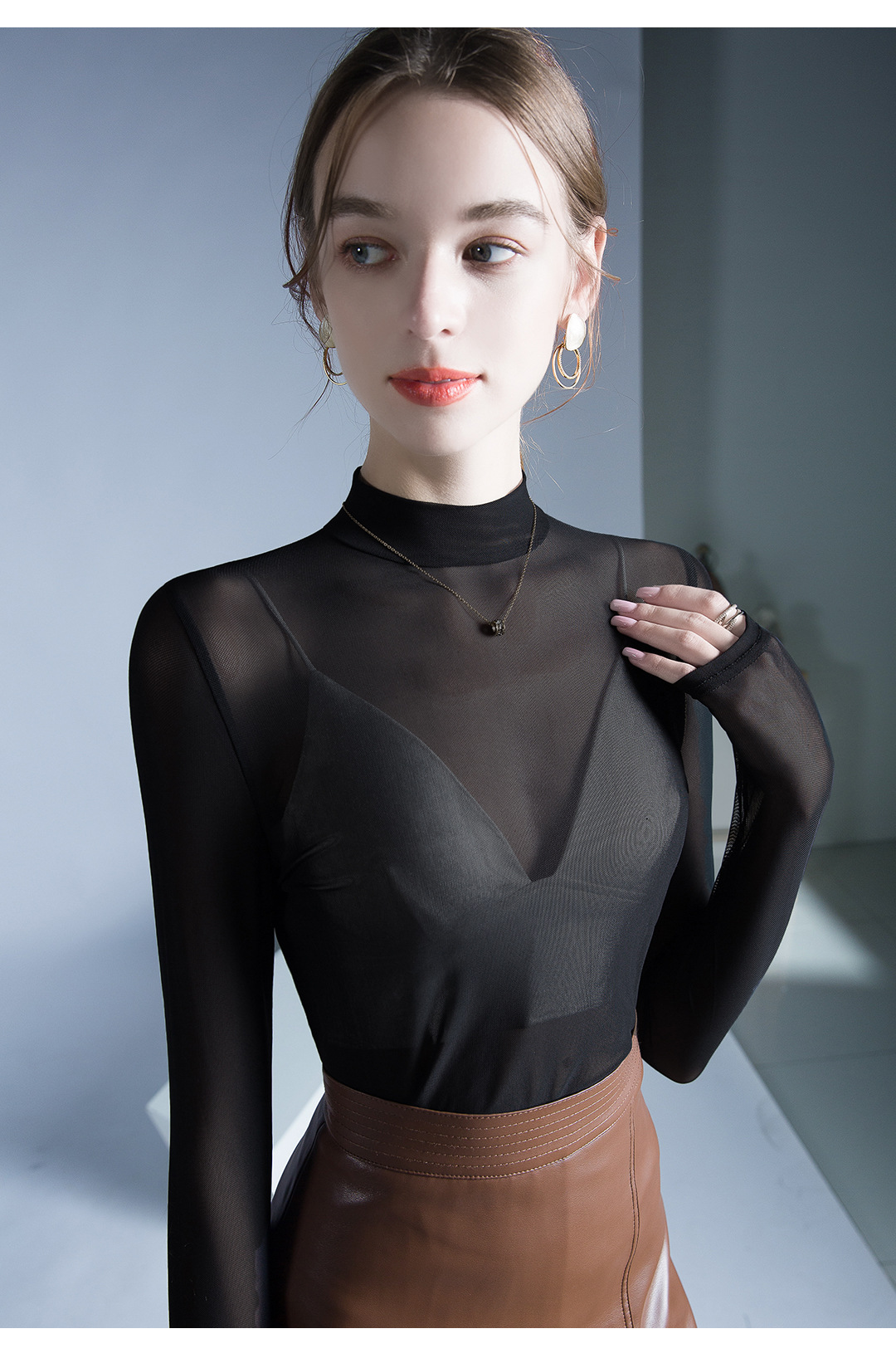 원근법을위한 트렌드 시계 탑 가을 새로운 유행 단색 메쉬 기본 셔츠 슬림 스트레치 티셔츠 작은 셔츠