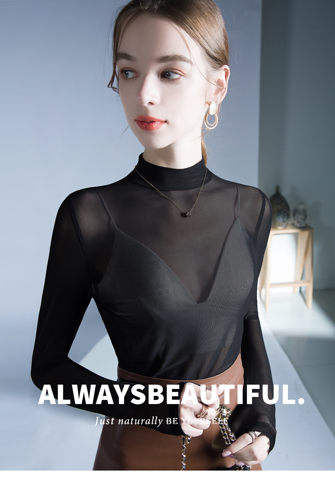 원근법을위한 트렌드 시계 탑 가을 새로운 유행 단색 메쉬 기본 셔츠 슬림 스트레치 티셔츠 작은 셔츠스토어 가기