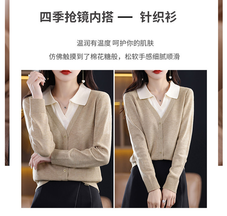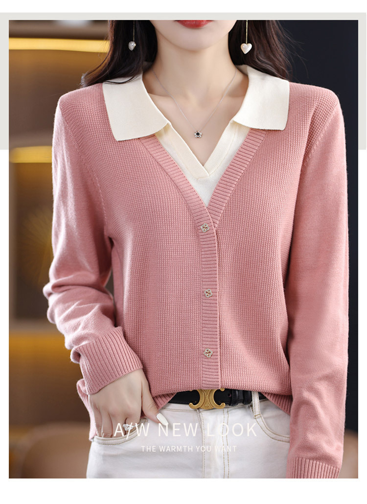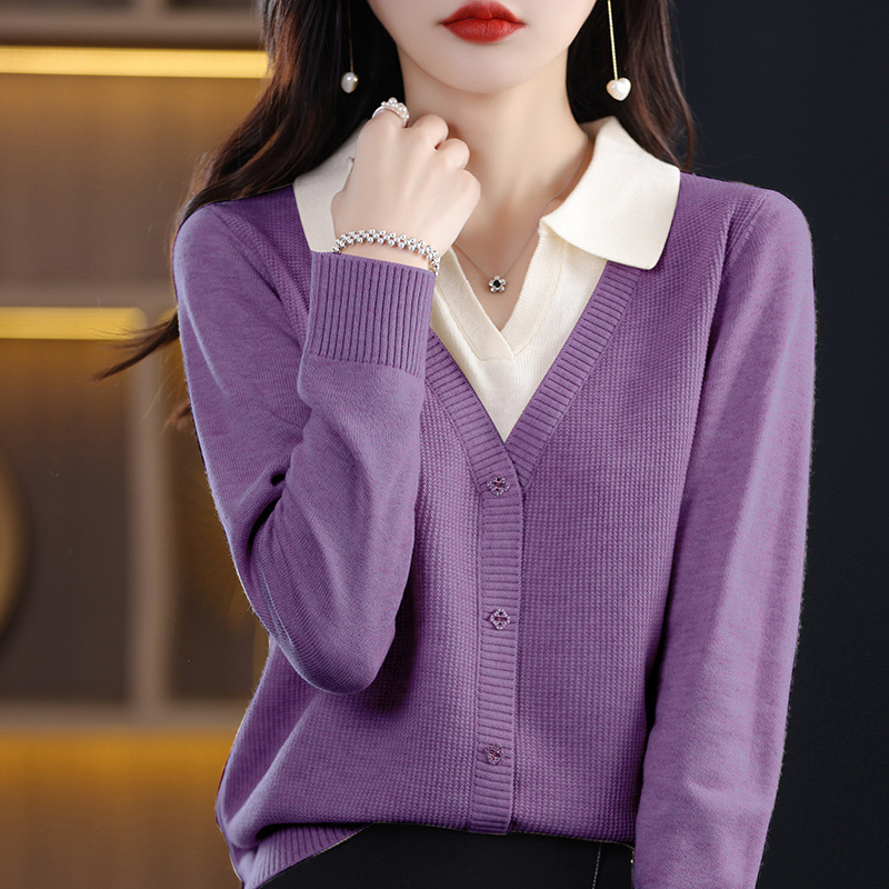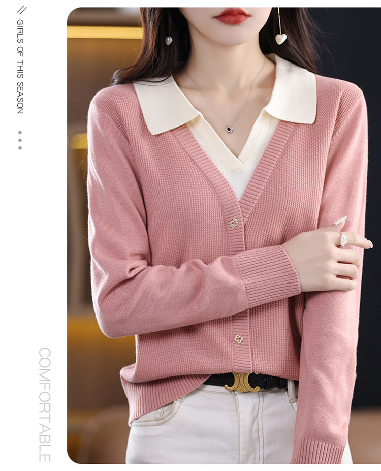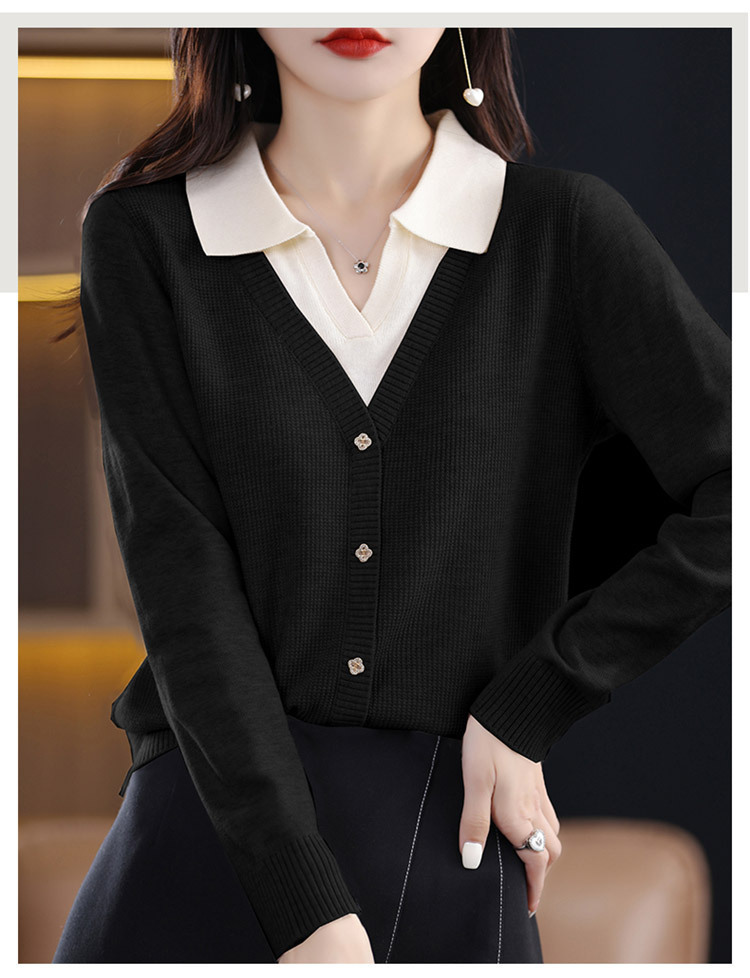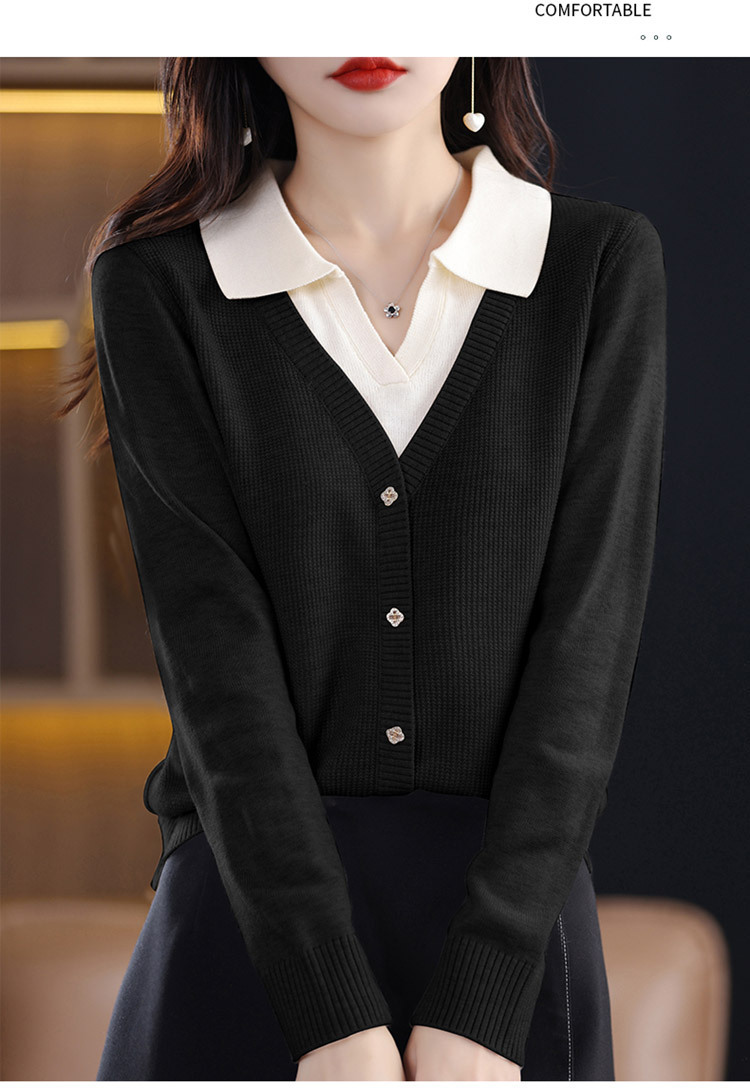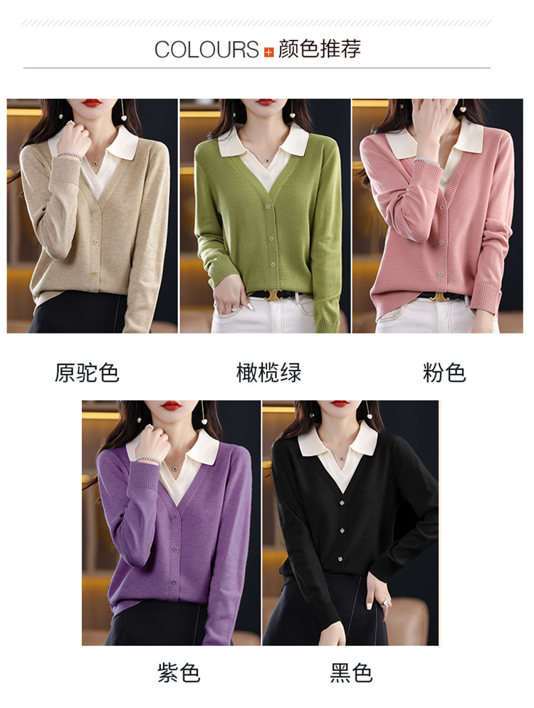 25년 봄 가을 여성 니트웨어 신상품 라펠 디자인 페이크 투피스 이너웨어 배색 아우터 여성 스웨터 도매스토어 가기