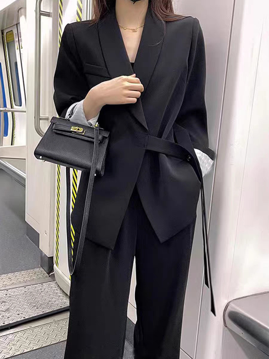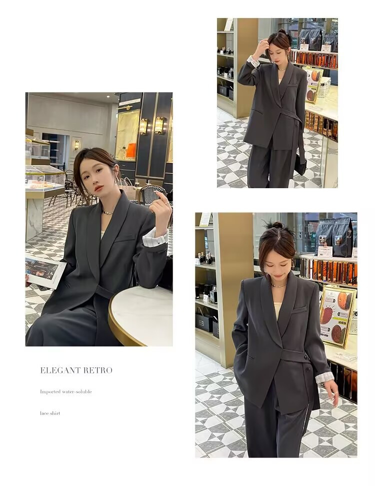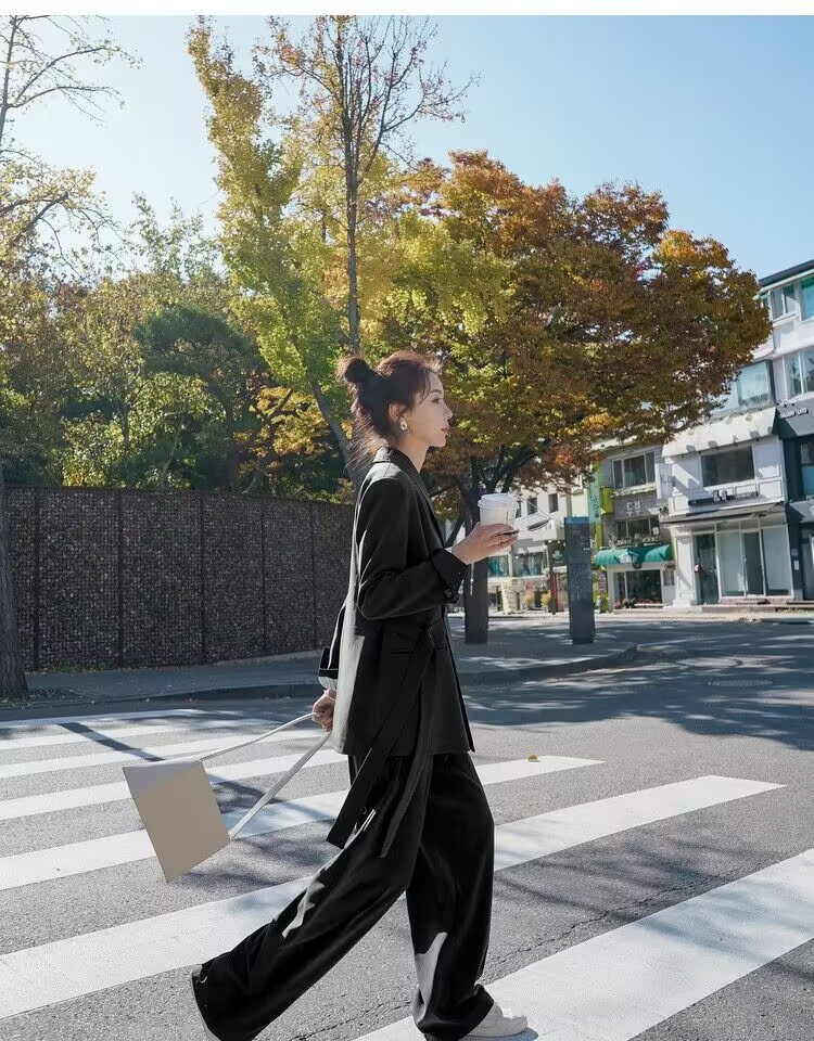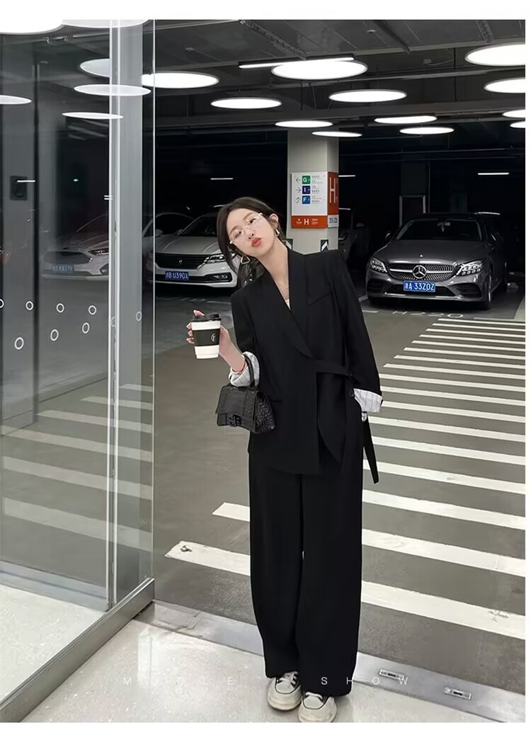 디자인감 있는 스트랩 수트 재킷과 와이드 팬츠 투피스 세트 여성용 봄 가을 신상 루즈핏 캐주얼 슈트 트렌디한 출퇴근룩스토어 가기