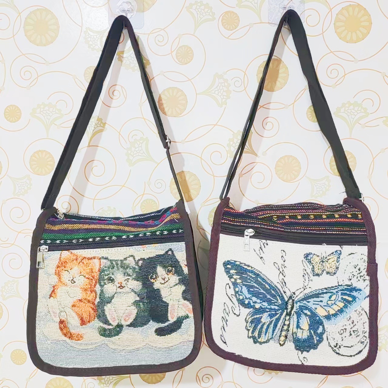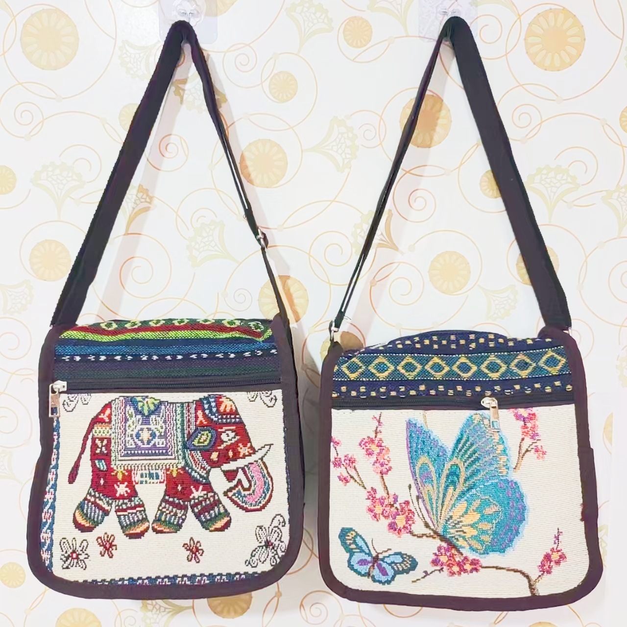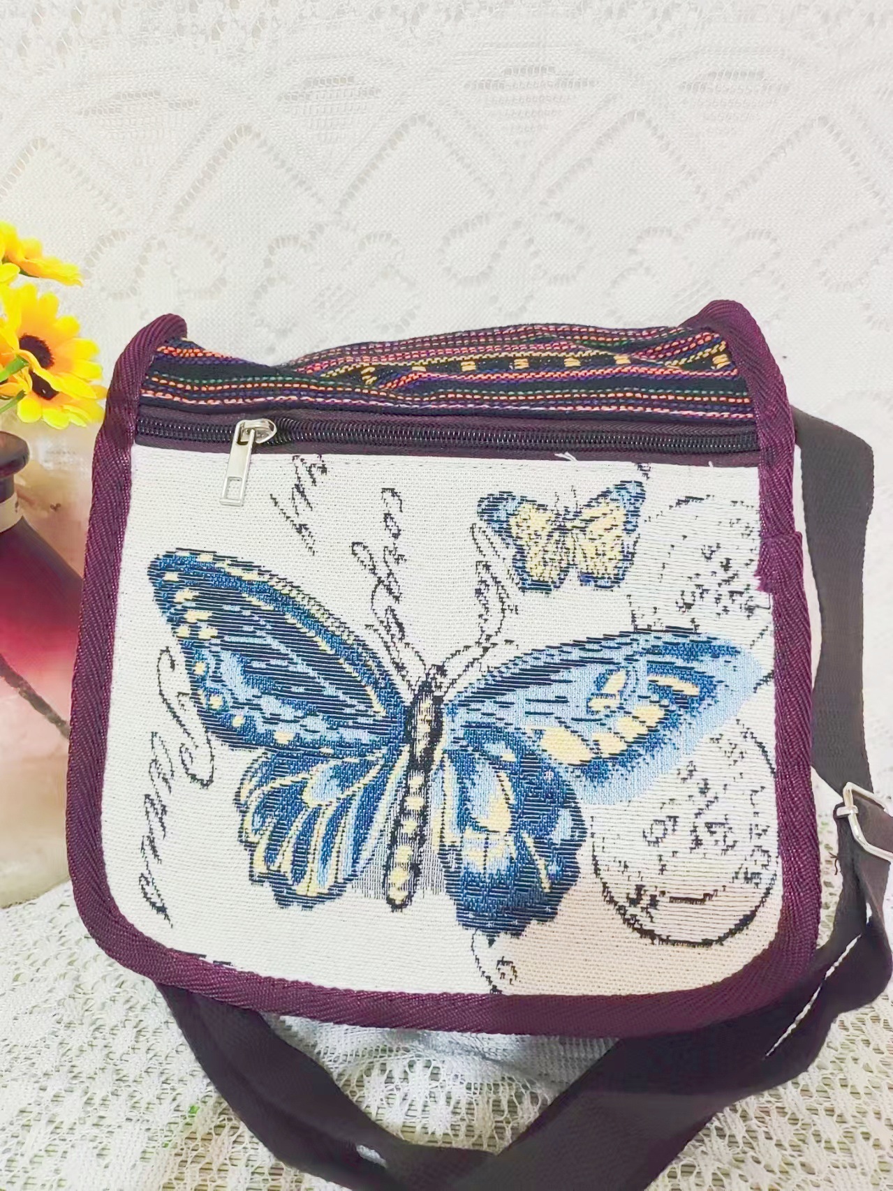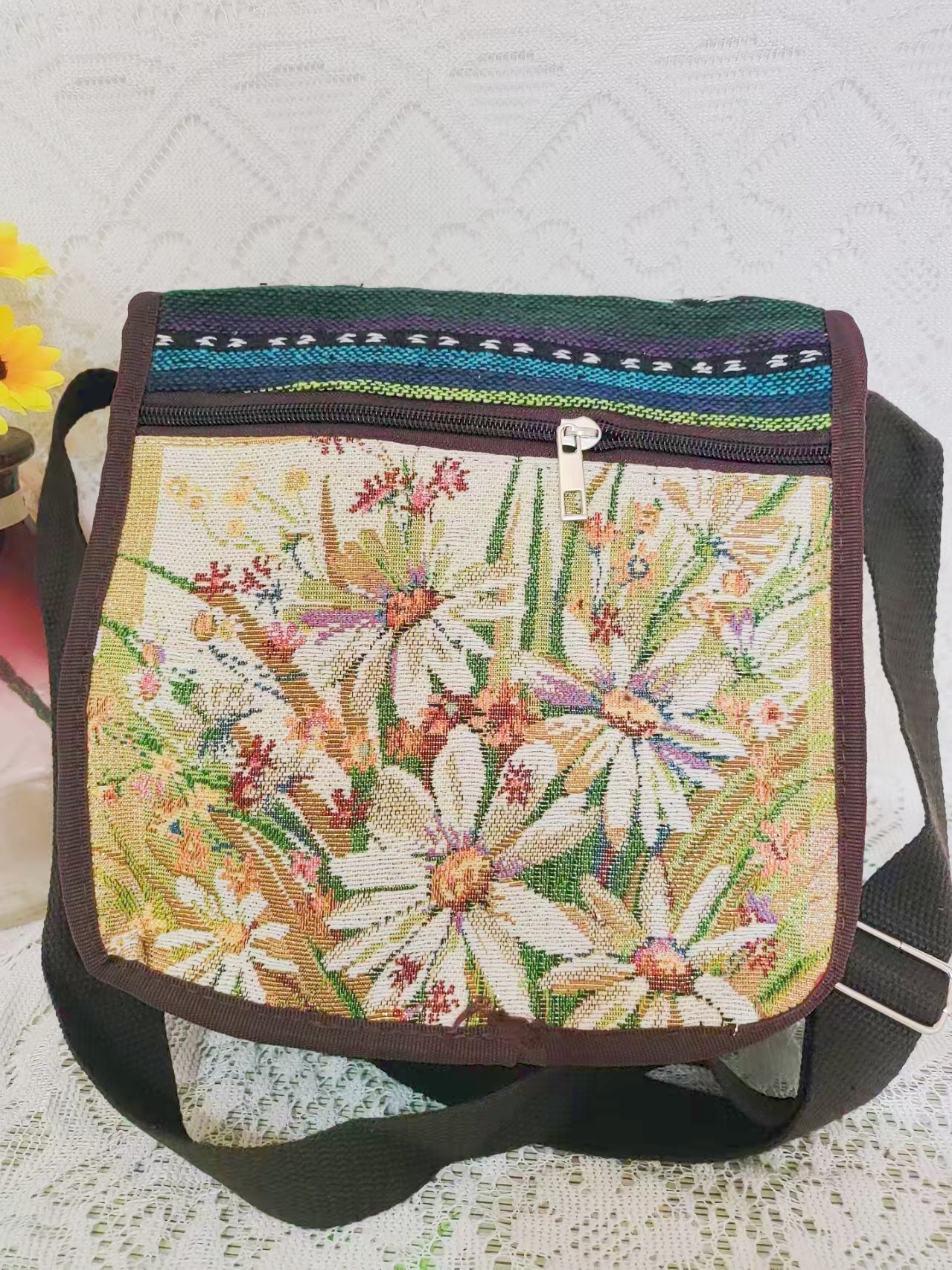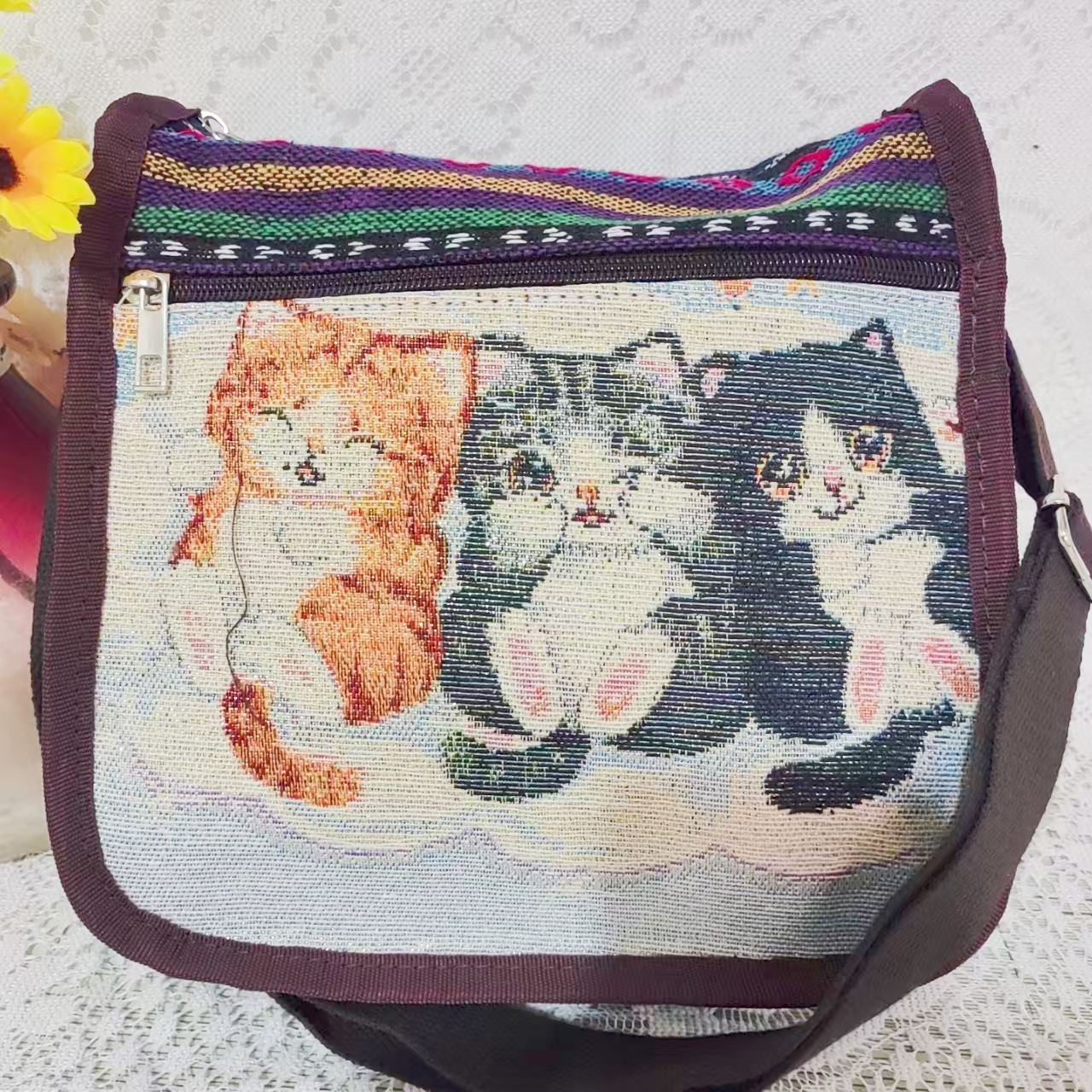 에스닉 스타일 3 지퍼 크로스 바디 백 양면 자수 조절 가능한 숄더 백 대외 무역 국경 간 캔버스 여성용 가방스토어 가기