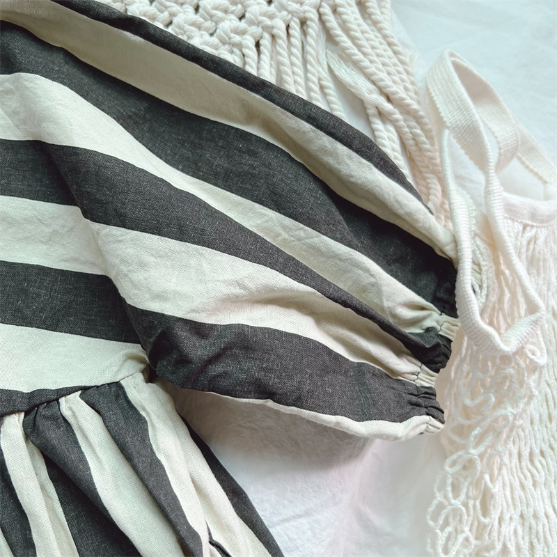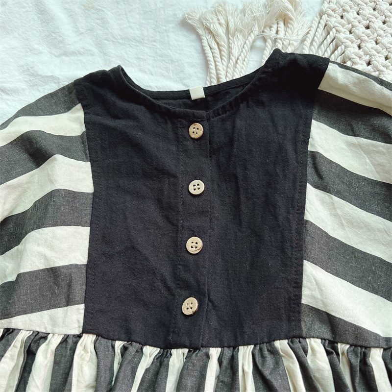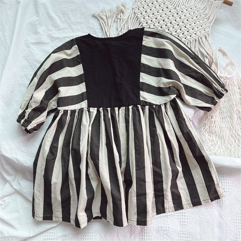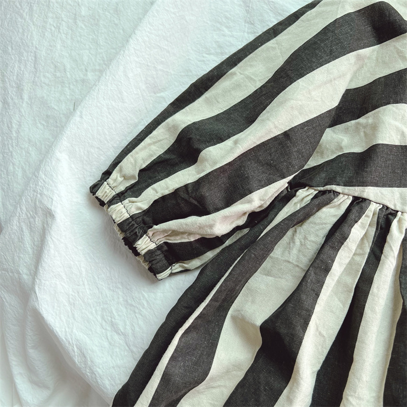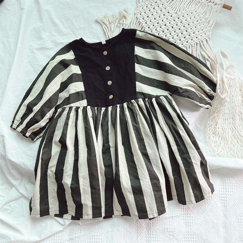 가을 2023 새로운 어린이 원피스 일본식 빈티지 스트라이프 롱 원피스 작은 신선한 면과 린넨 스티치 스트라이프 원피스