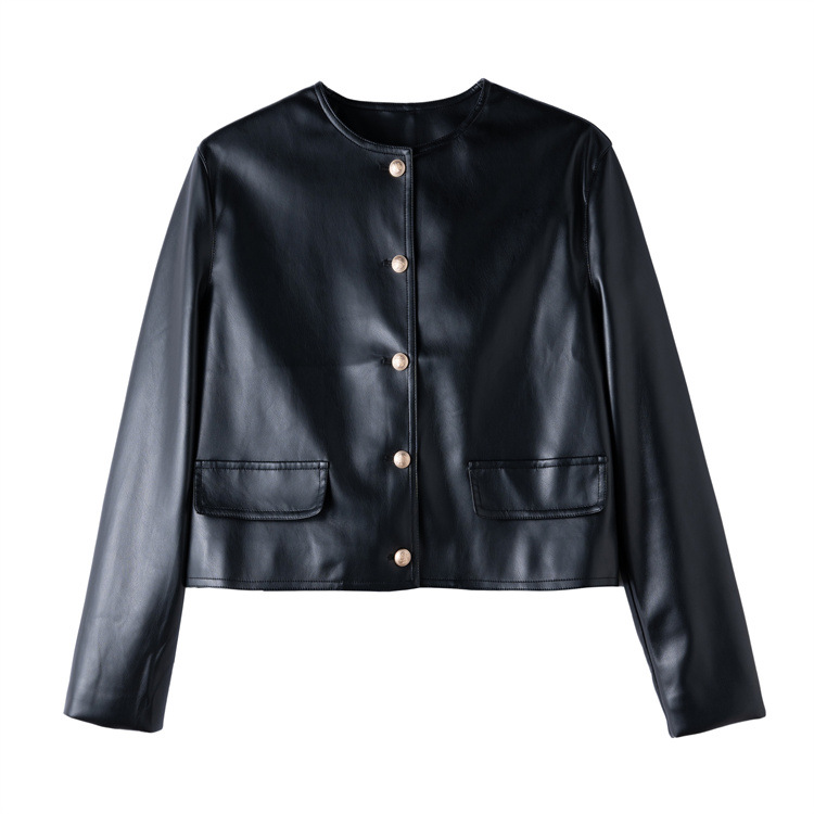 메탈 브레스트 블랙 PU 가죽 여성 가을 새로운 우아한 짧은 코트 작은 재킷 탑스토어 가기