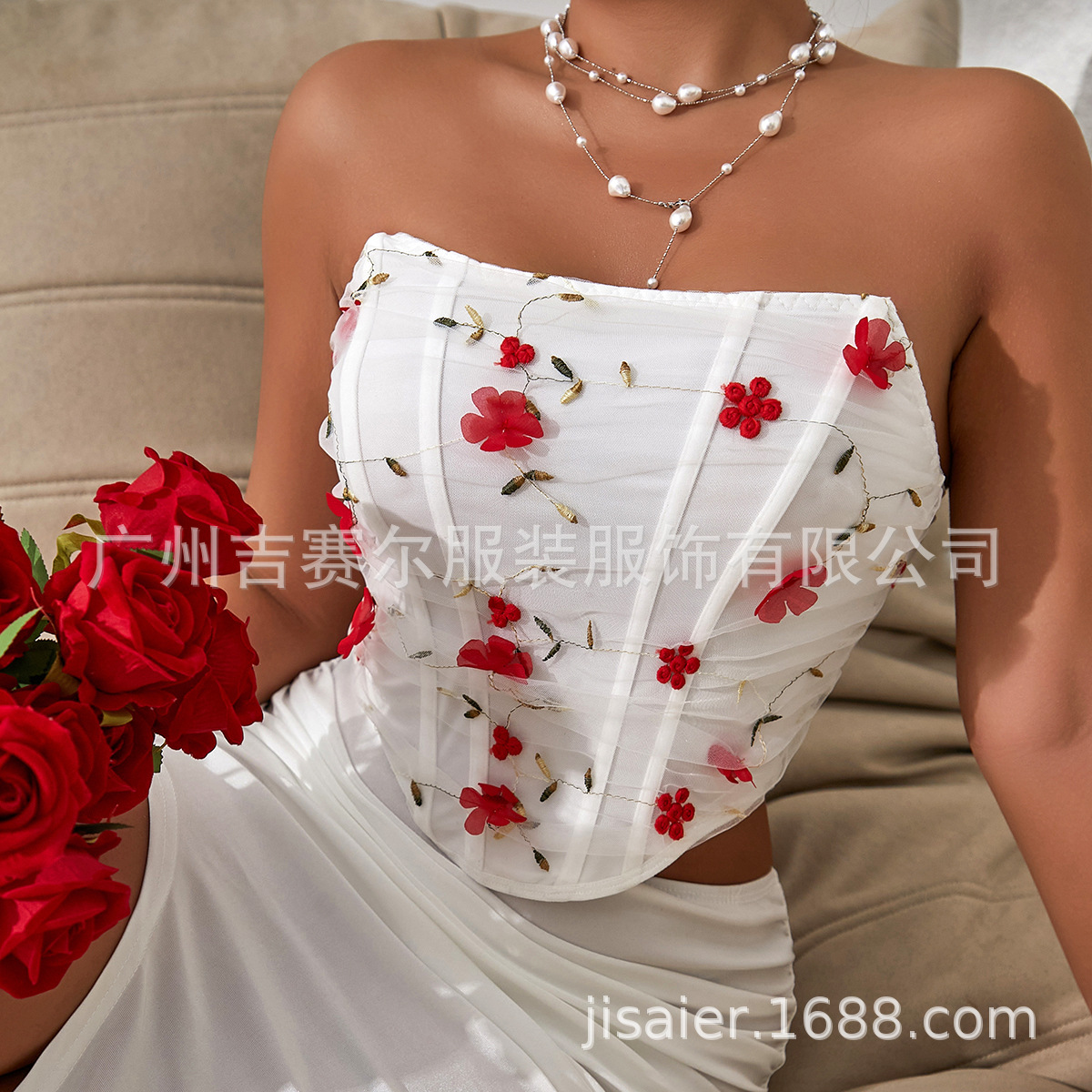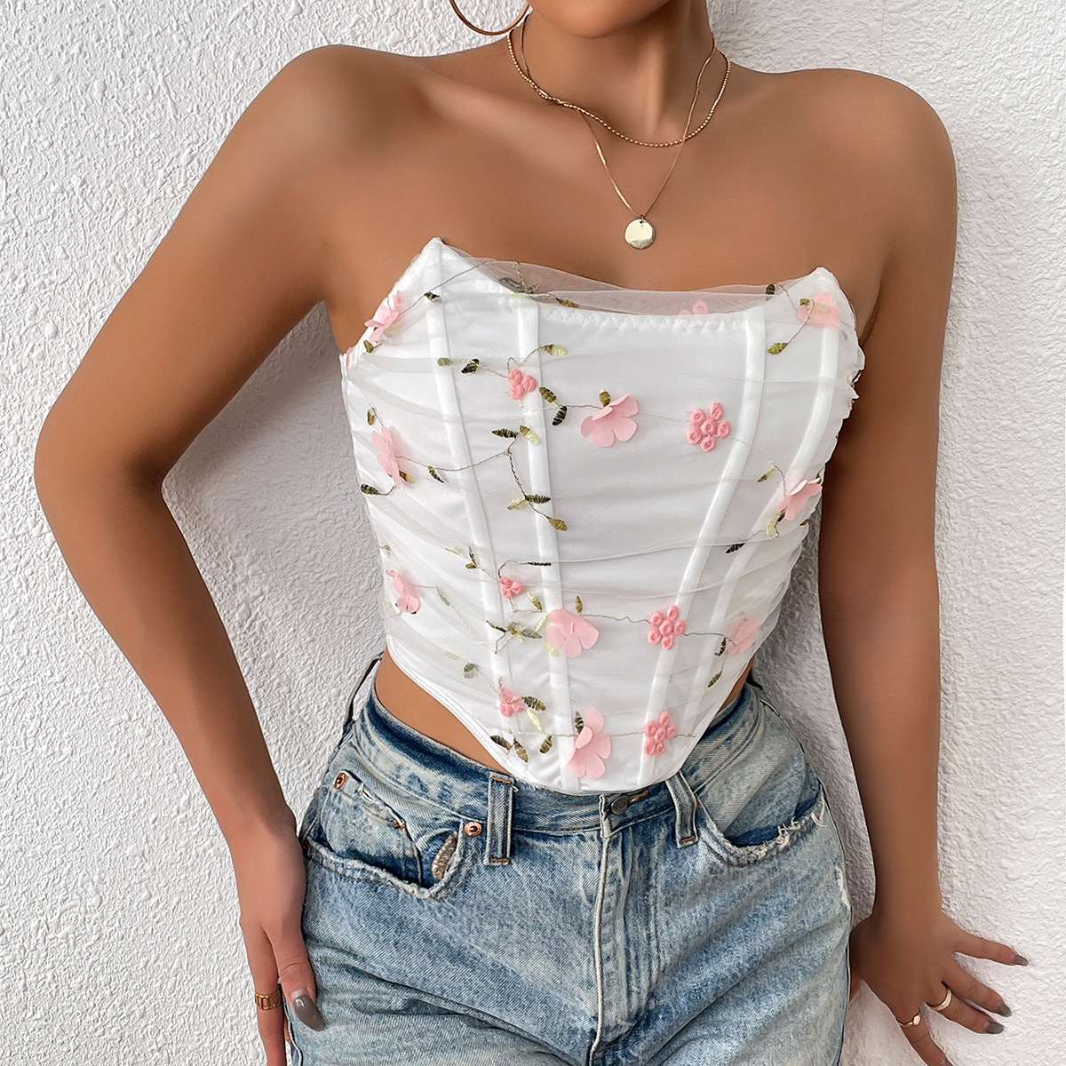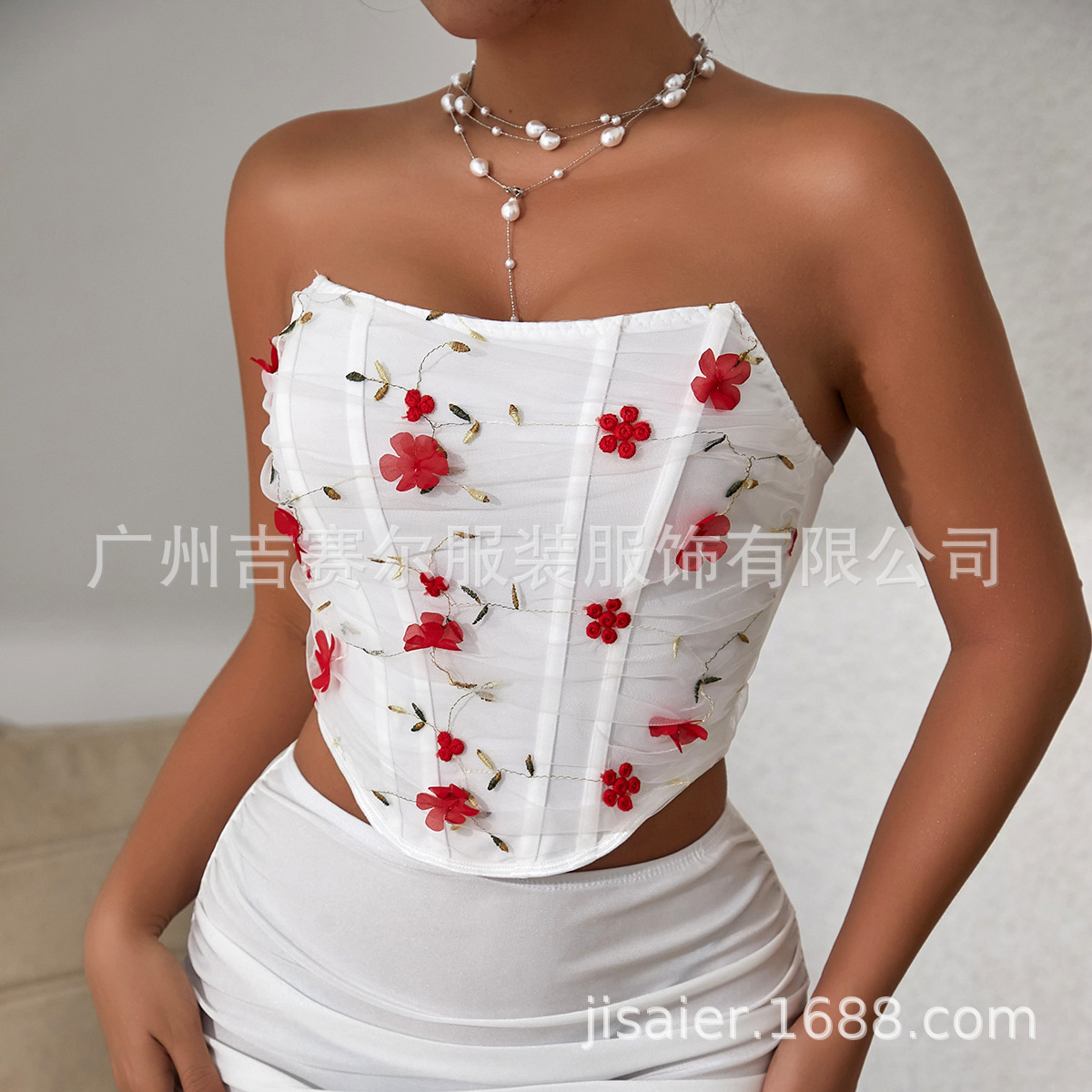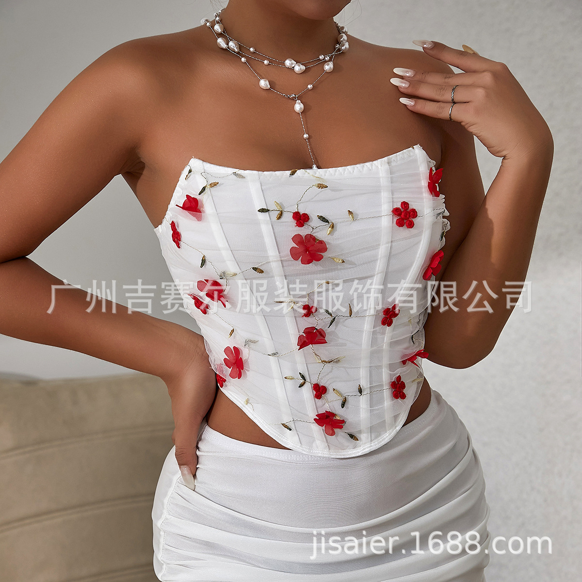 새로운 유럽과 미국의 스트리트 패션 스타일 폭발 꽃 수 놓은 물고기 뼈 메쉬 짧은 겉옷 튜브 탑 60650스토어 가기