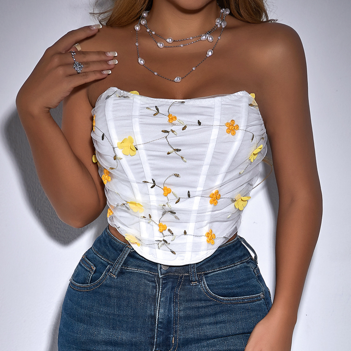 새로운 유럽과 미국의 스트리트 패션 스타일 폭발 꽃 수 놓은 물고기 뼈 메쉬 짧은 겉옷 튜브 탑 60650