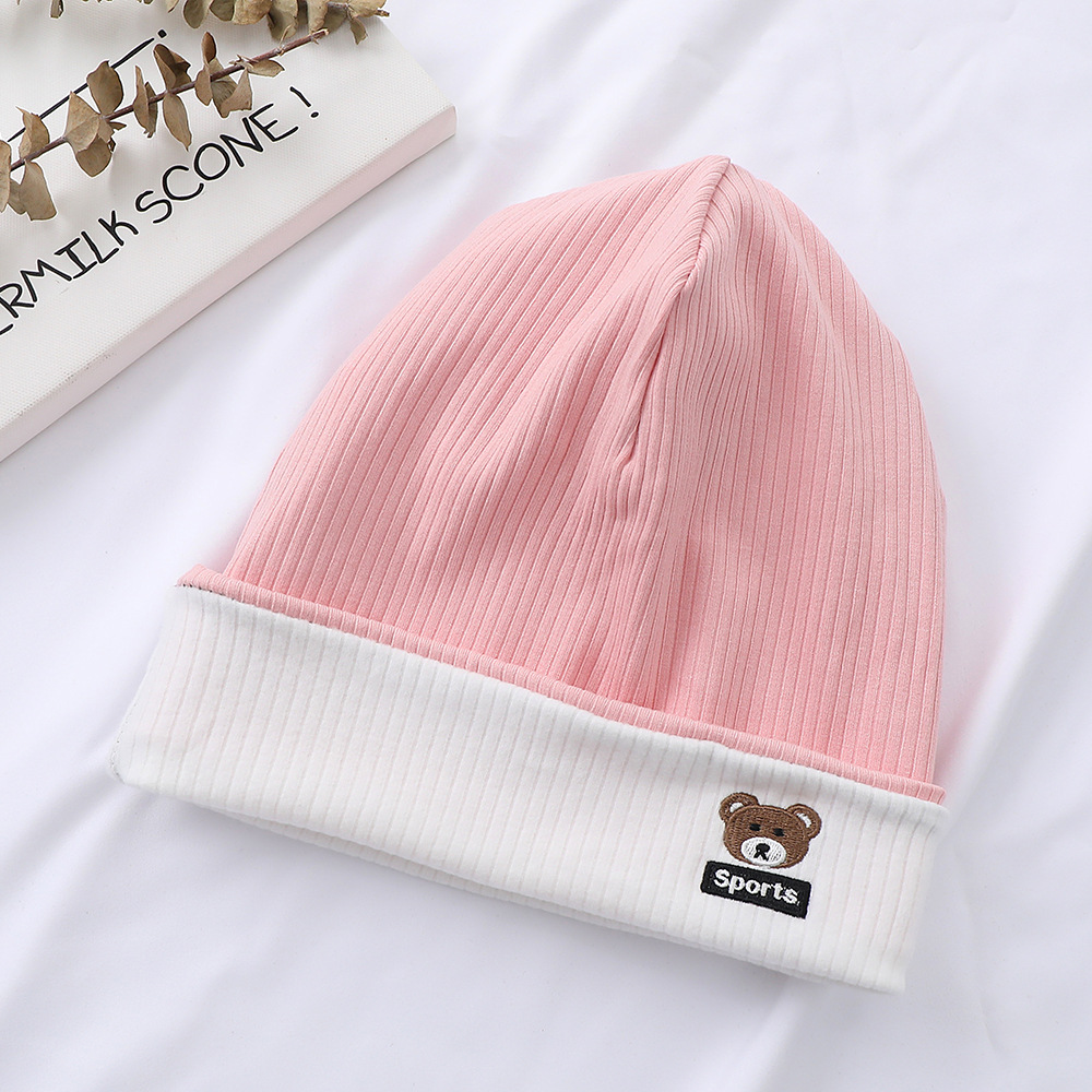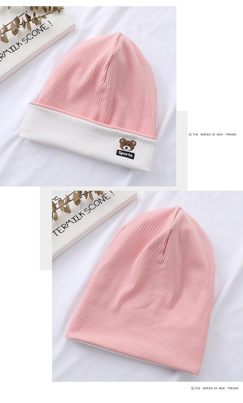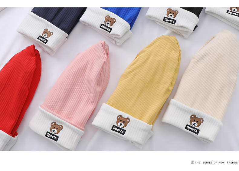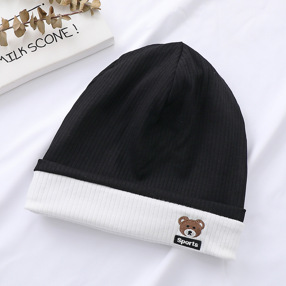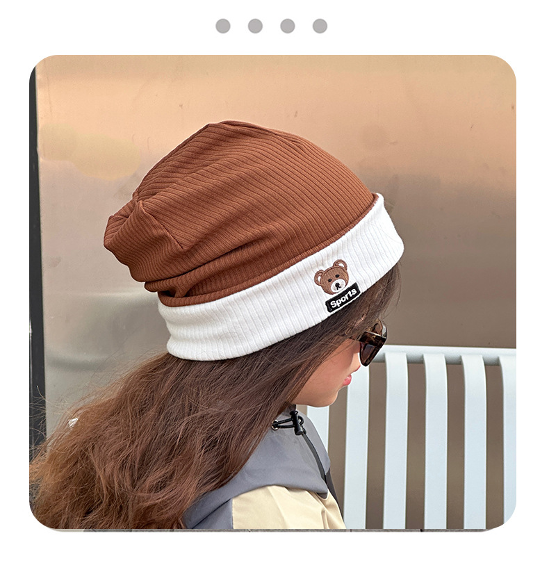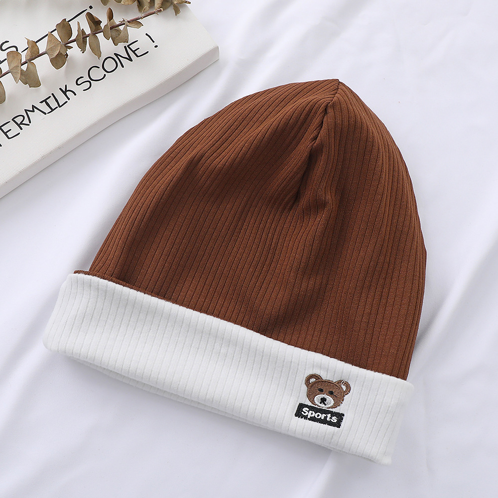 가을과 겨울 대비 색상 플랜지 핏 스트립 자수 곰 한국식 캔디 컬러 니트 모자 따뜻한 풀오버 모자 어린이 모자