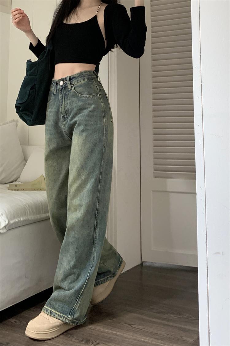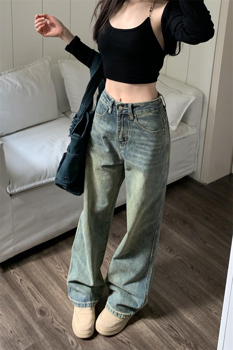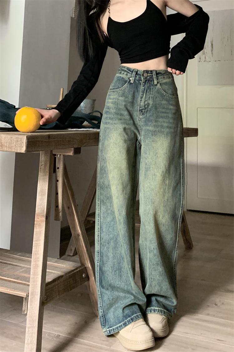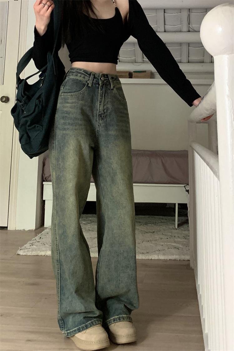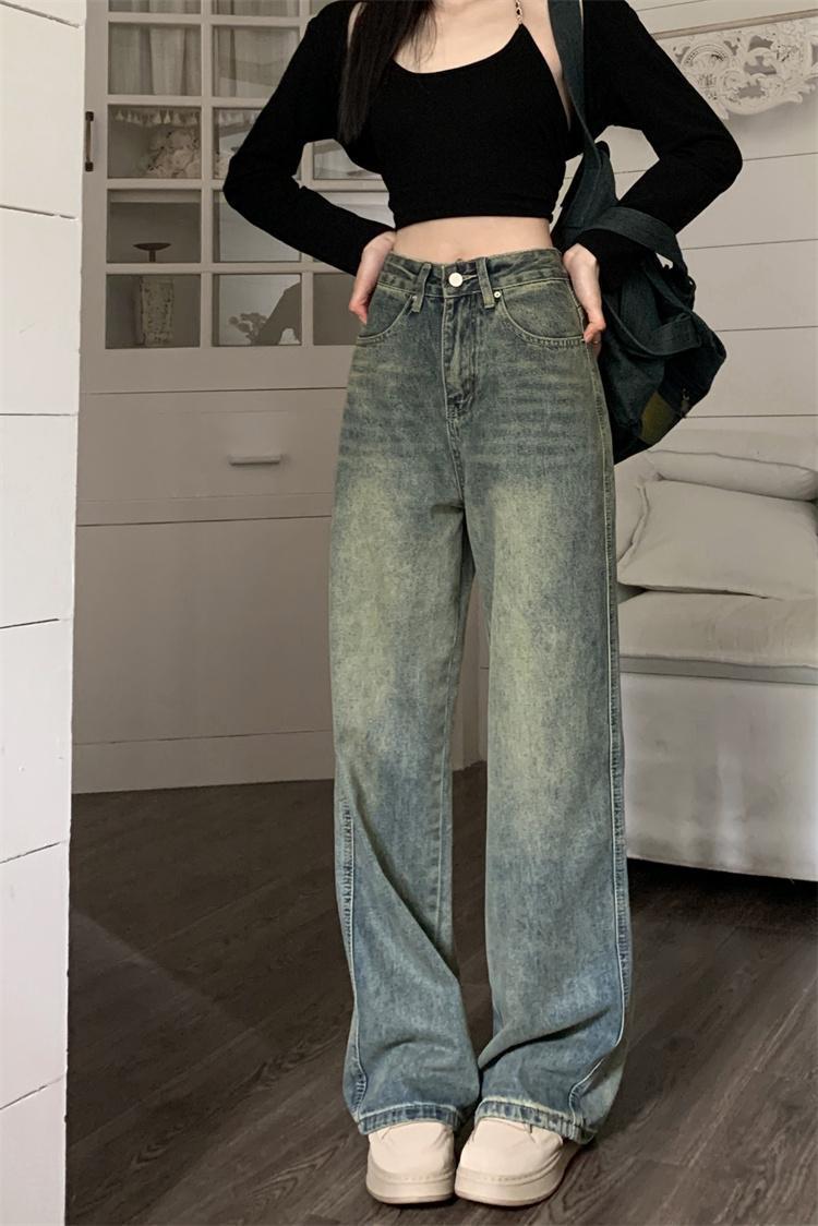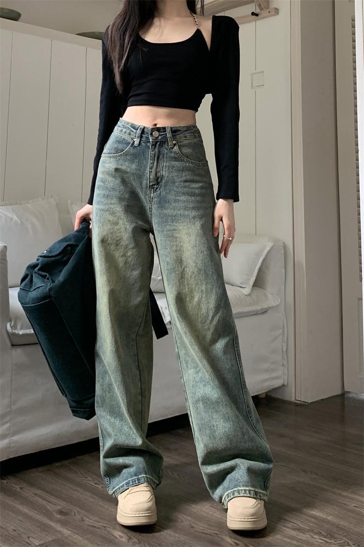 한국식 스트레이트 레그 진 여성용 봄과 가을 야외 배 모양 캐주얼 복고풍 바닥 길이 느슨한 미국식 와이드 레그 팬츠