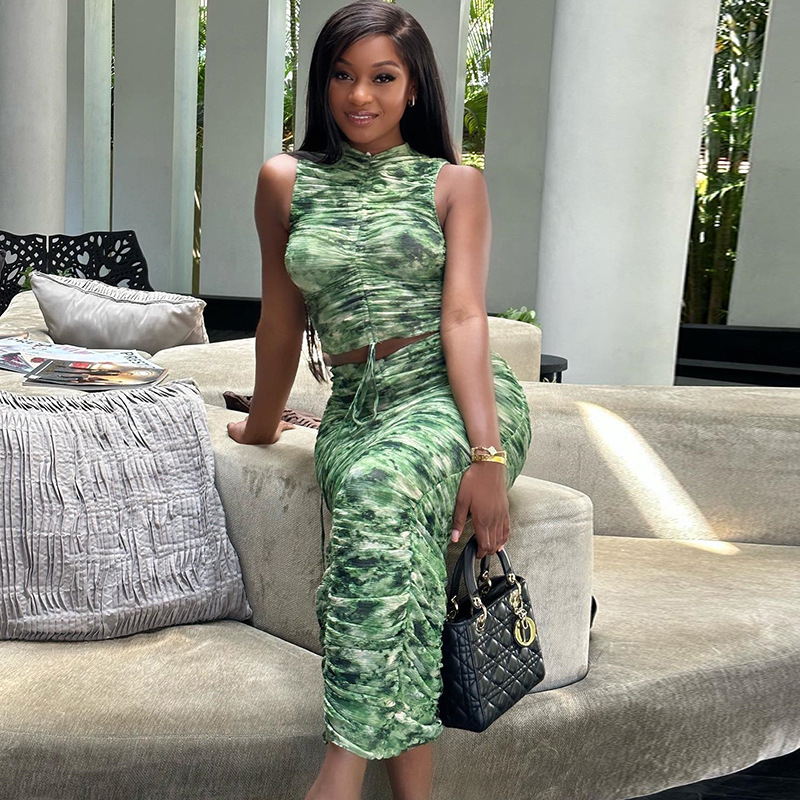유럽과 미국 스타일의 대외 무역 인쇄 민소매 풀오버 드로스트링 탑 스커트 여성용 투피스 슈트 트렌디한 드롭 배송