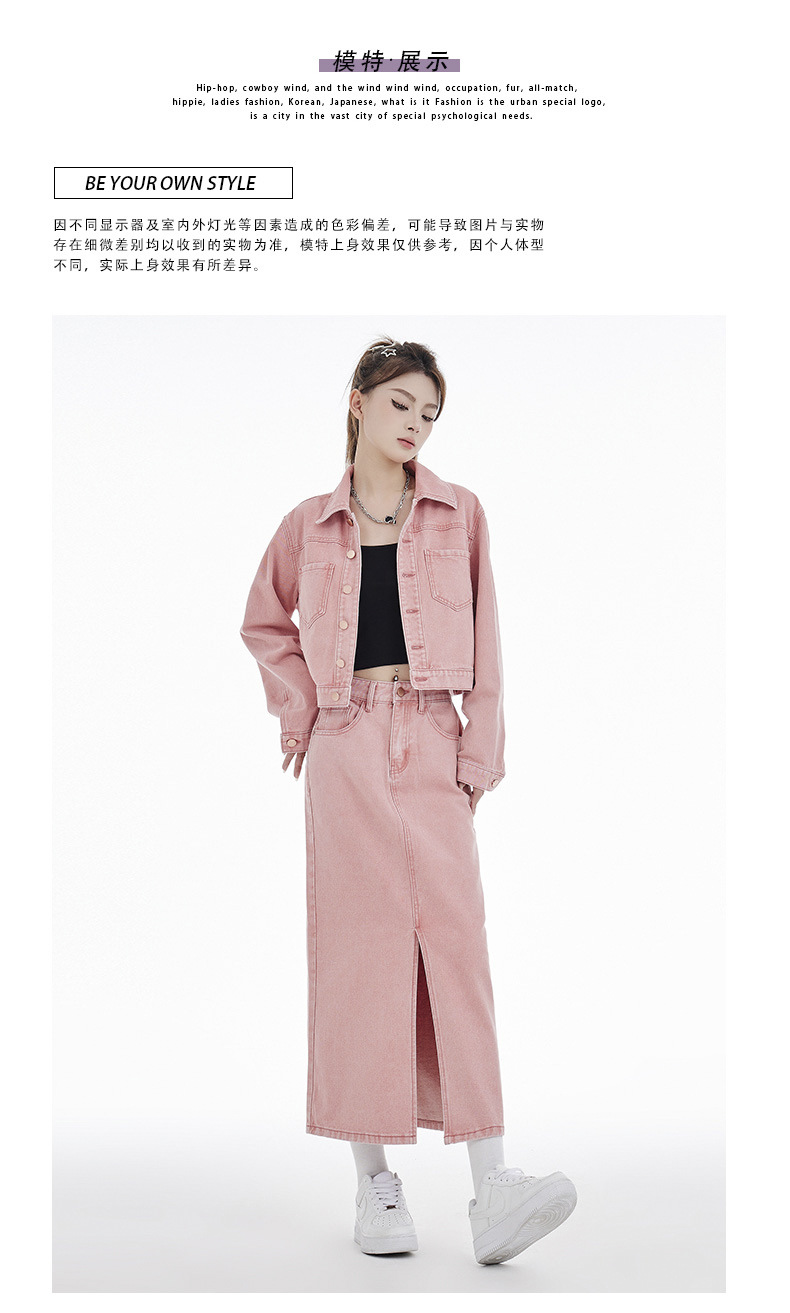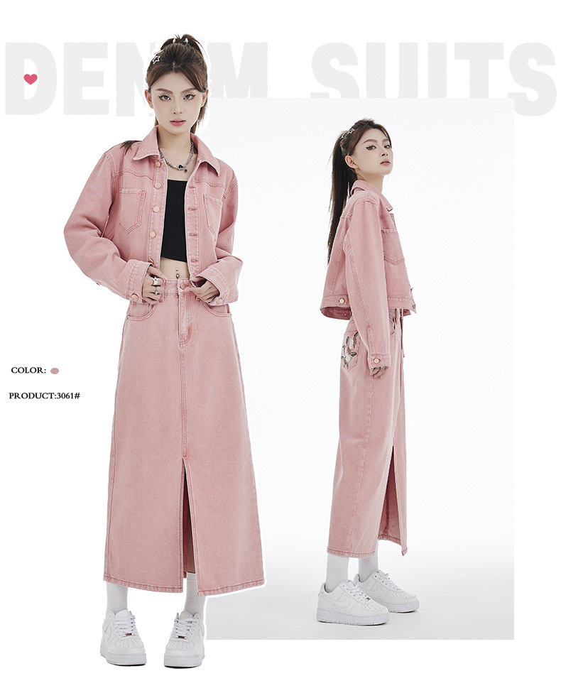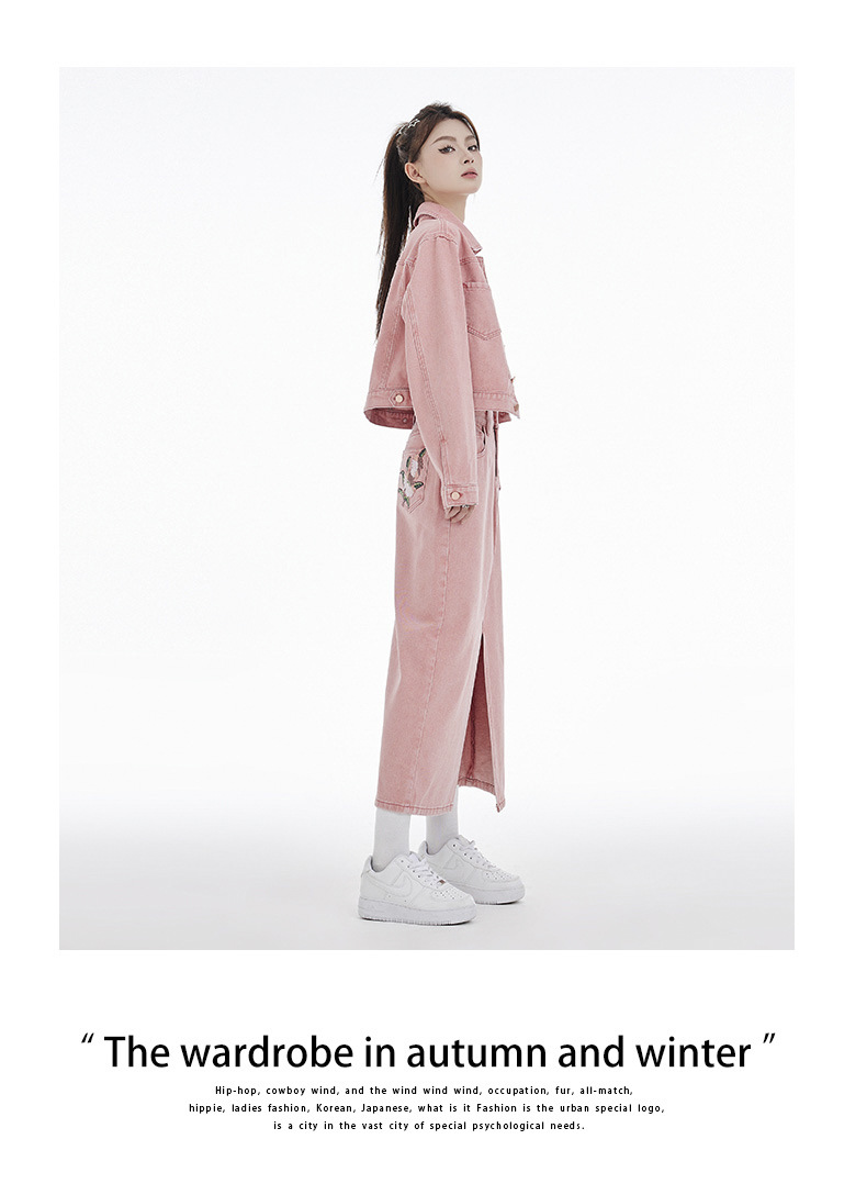 핑크 데님 원피스 여자의 2023 가을 착용 복고풍 스플릿 스커트 투피스 가을과 겨울 패션 모든 매치스토어 가기