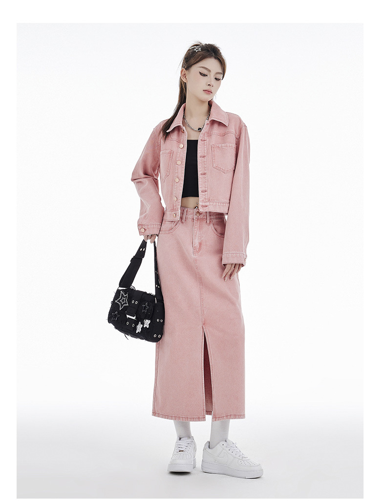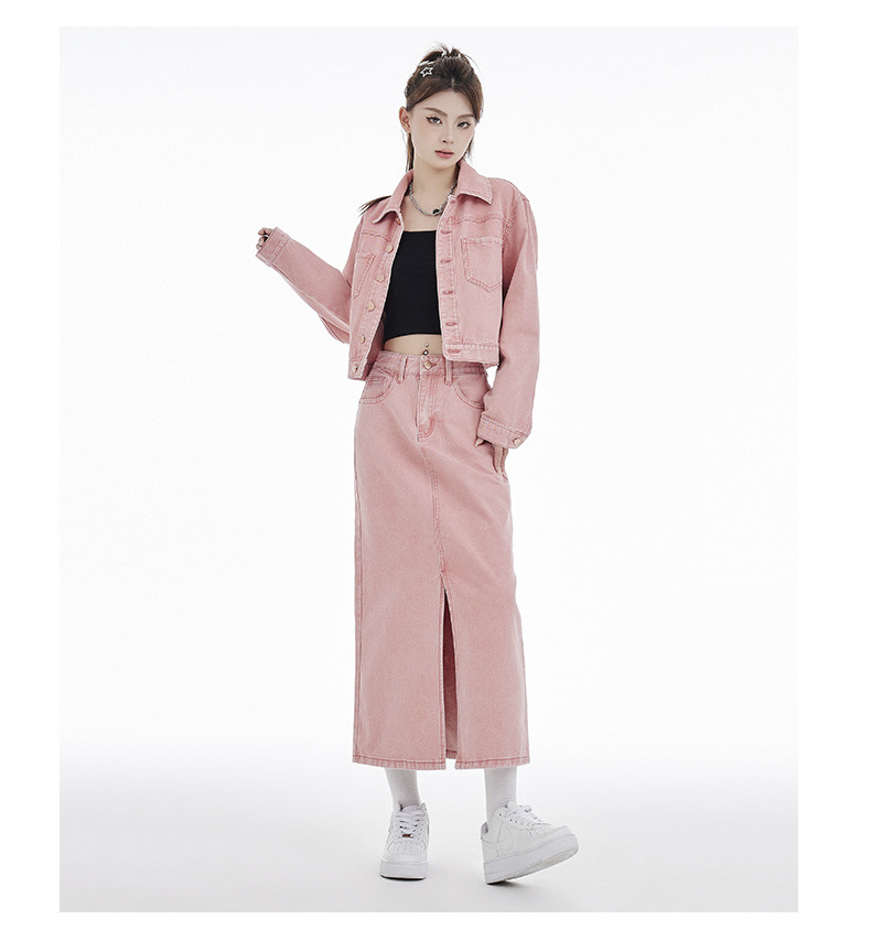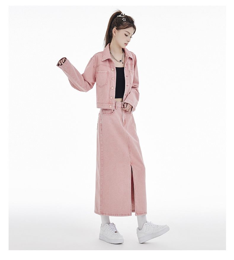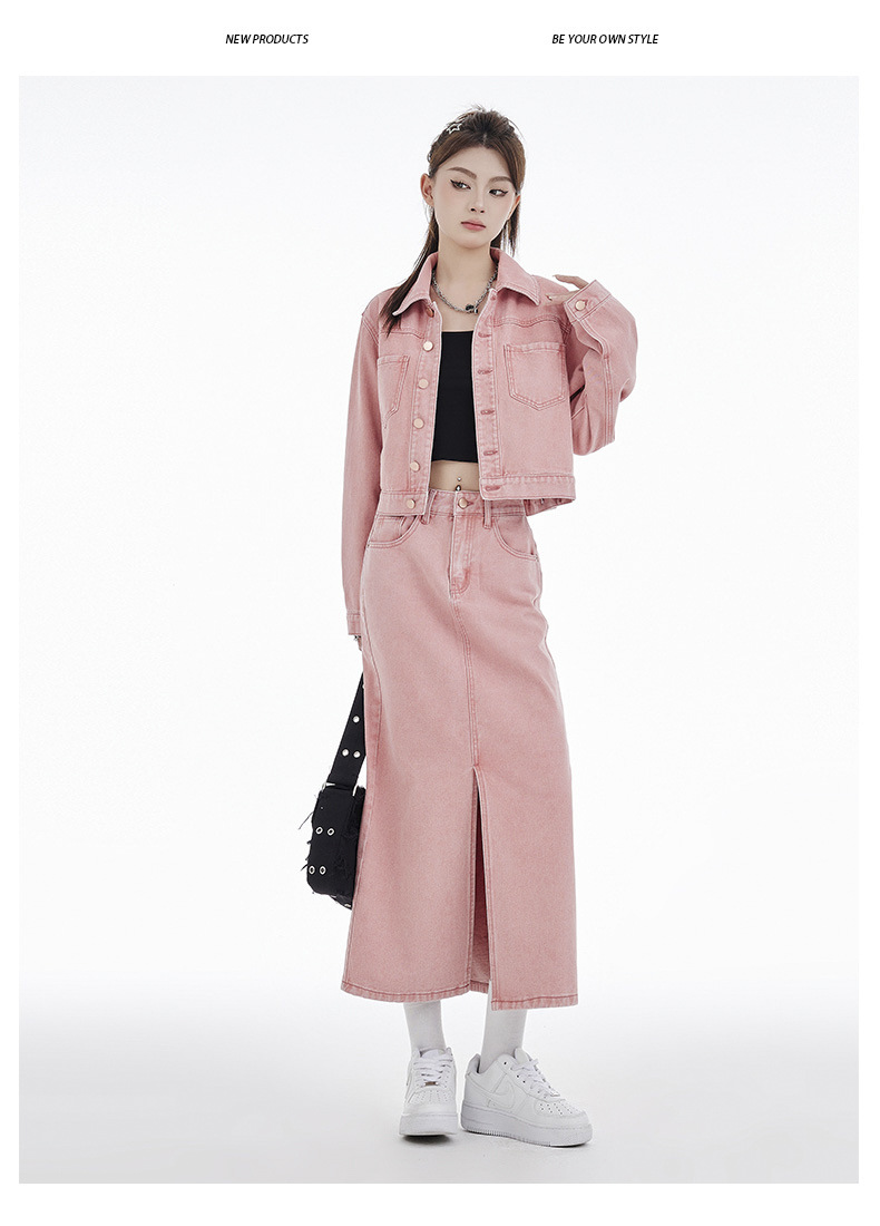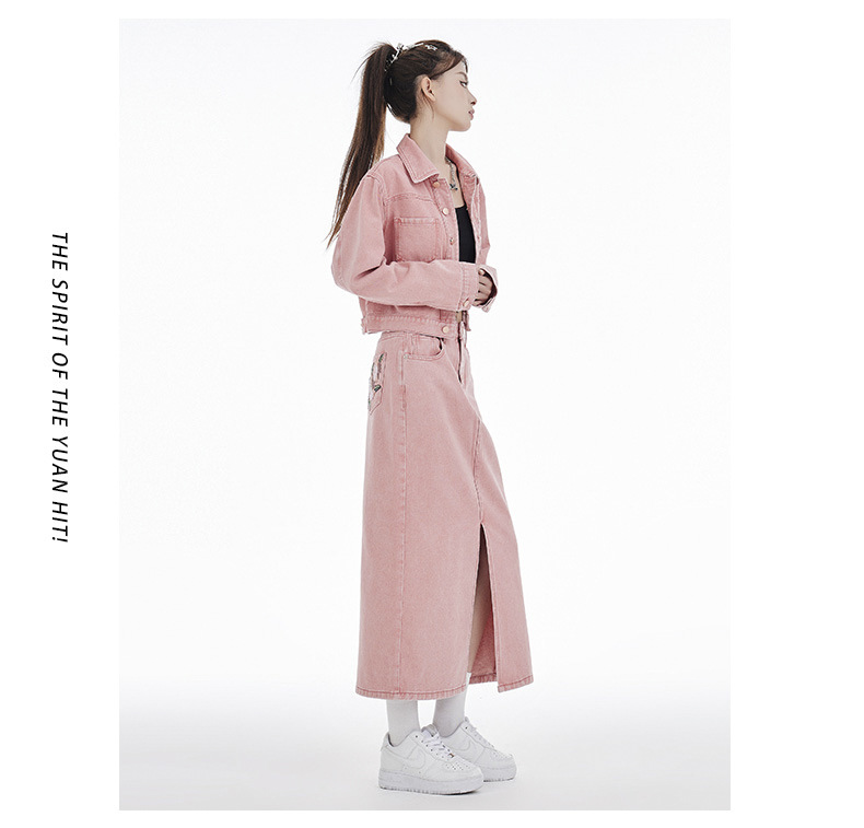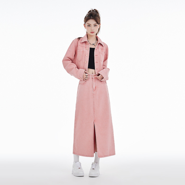 핑크 데님 원피스 여자의 2023 가을 착용 복고풍 스플릿 스커트 투피스 가을과 겨울 패션 모든 매치