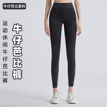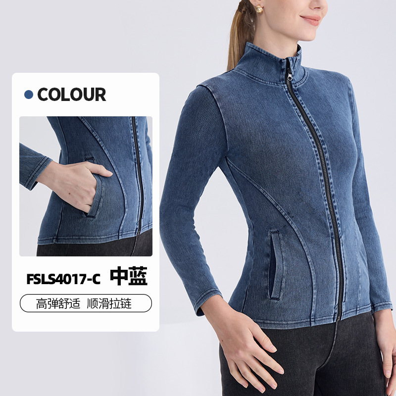 새로운 하이 넥 데님 요가 재킷 여자의 고탄력 슬림 타이트 캐주얼 겉옷 지퍼 포켓 스포츠 탑
