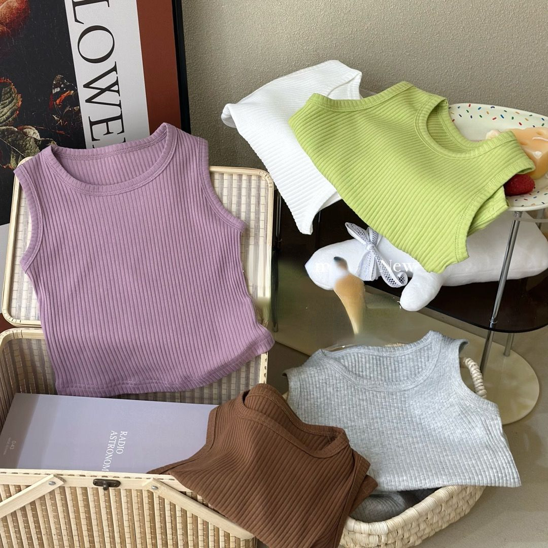어린이 2023 여름 새로운 심플 캐주얼 모든 매치 조끼 아기 소녀의 라운드 넥 핏 코튼 탑 0187스토어 가기
