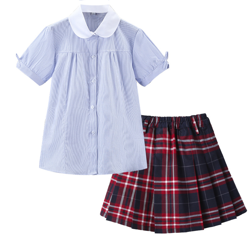 • 새로운 빨간 체크 무늬 스커트 + 블루 스트라이프 반팔 셔츠