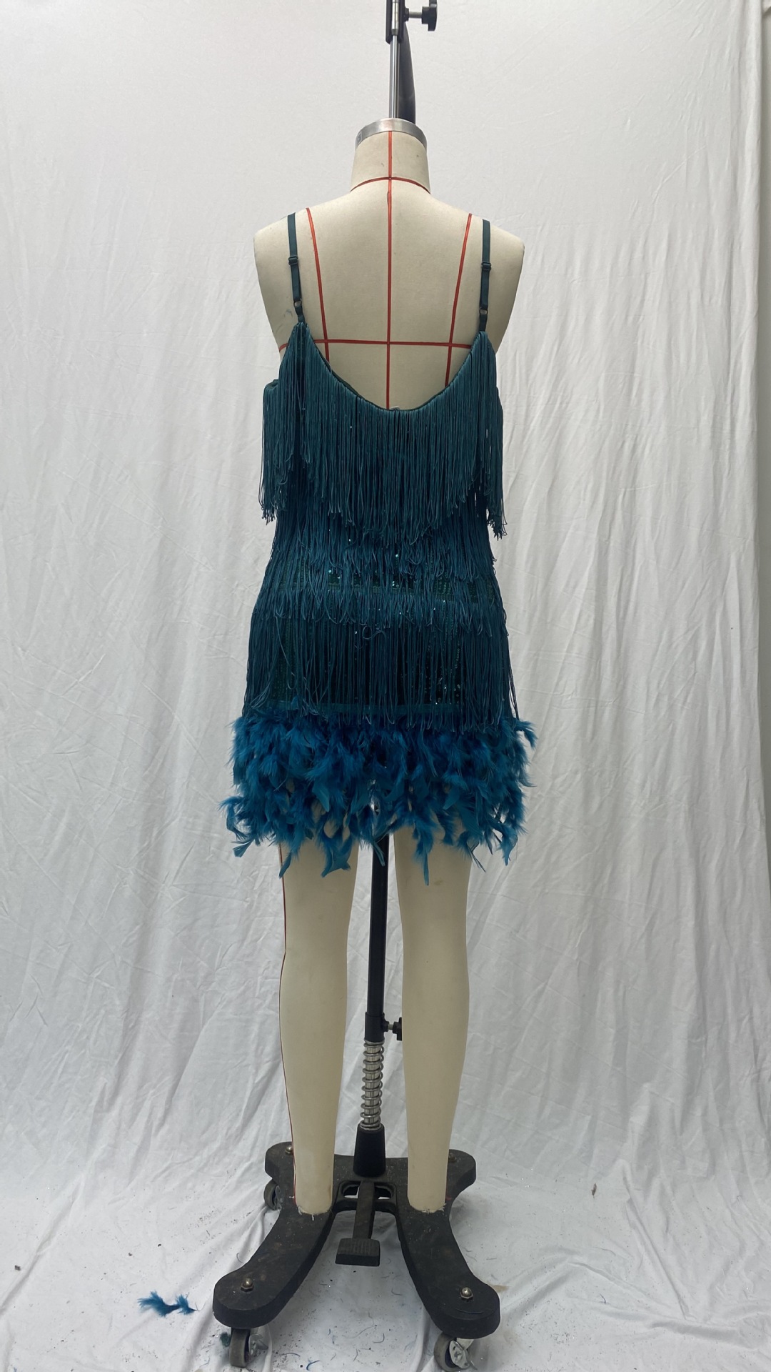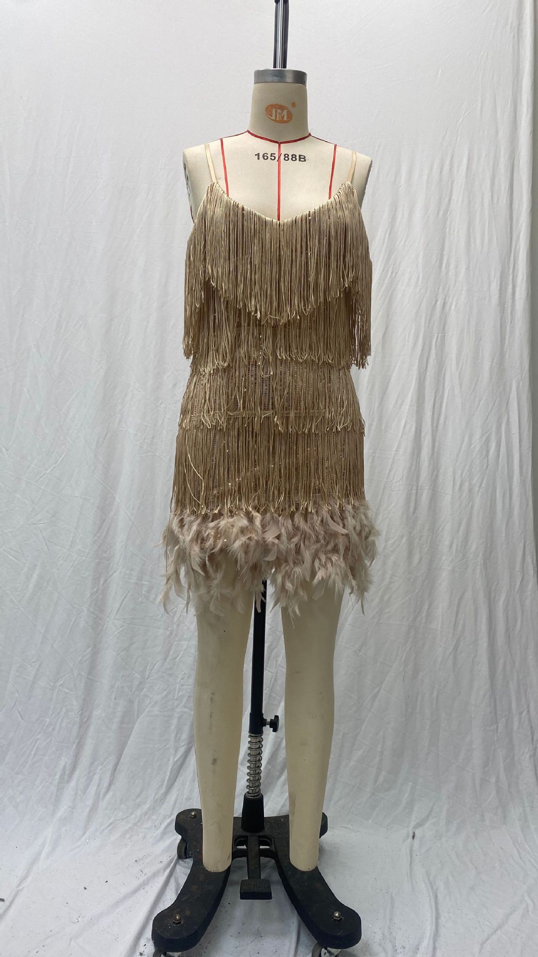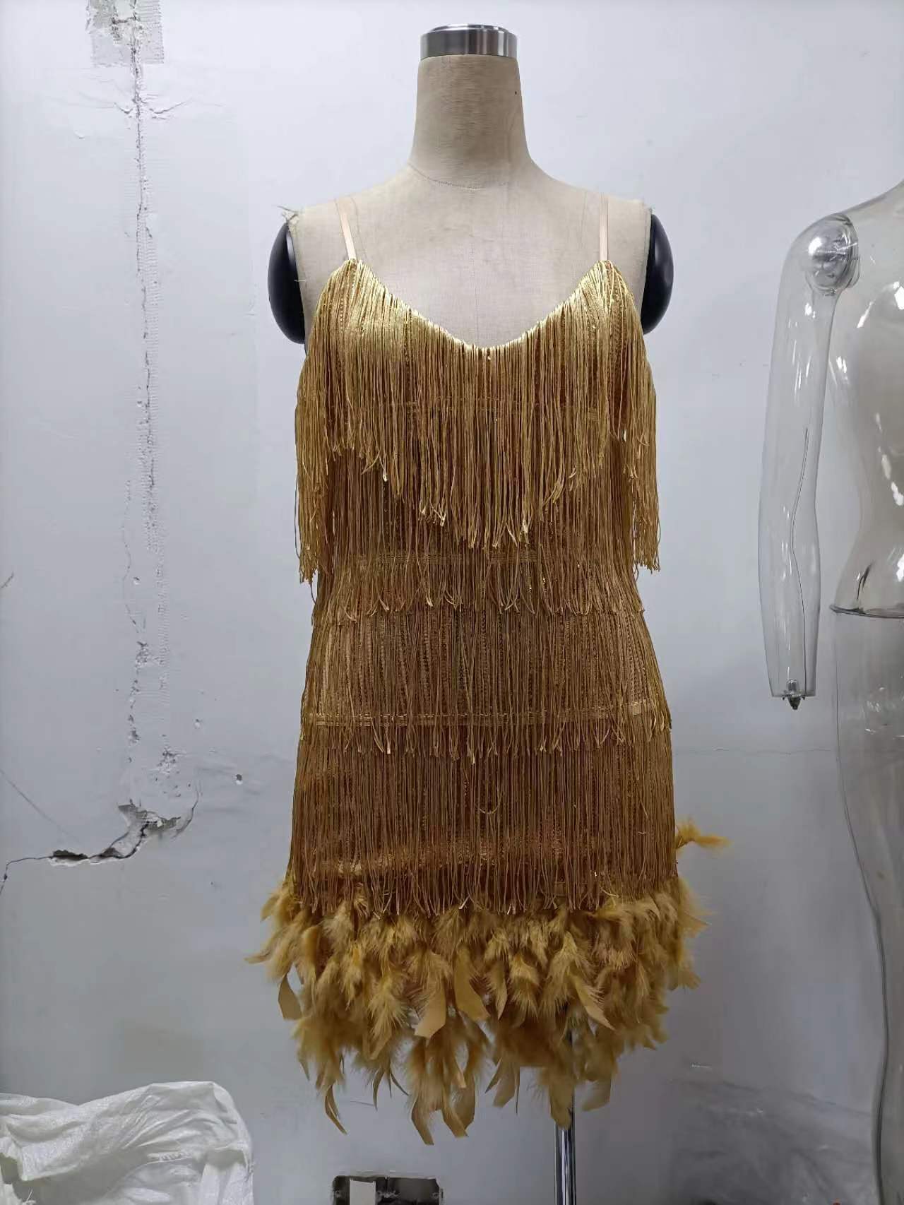 2025 년 여름 새로운 패션 술 sequins 깃털 스티칭 원피스 색상 원피스 아마존 여성 폭발 재고