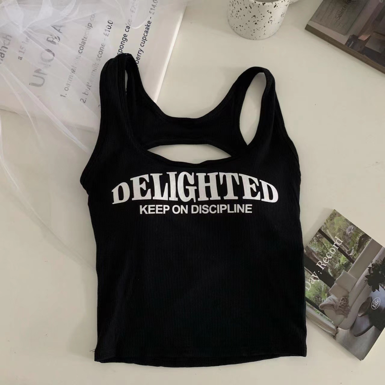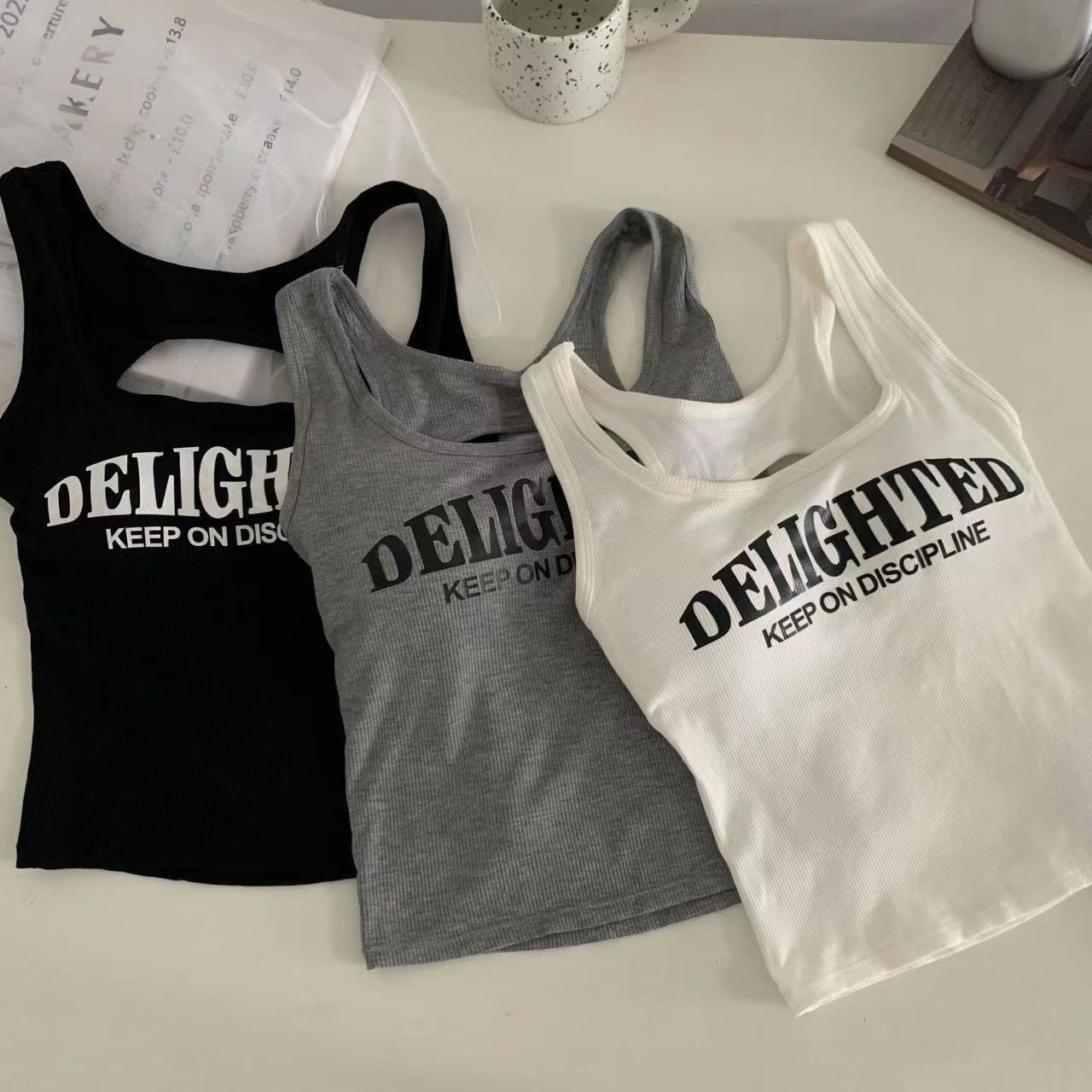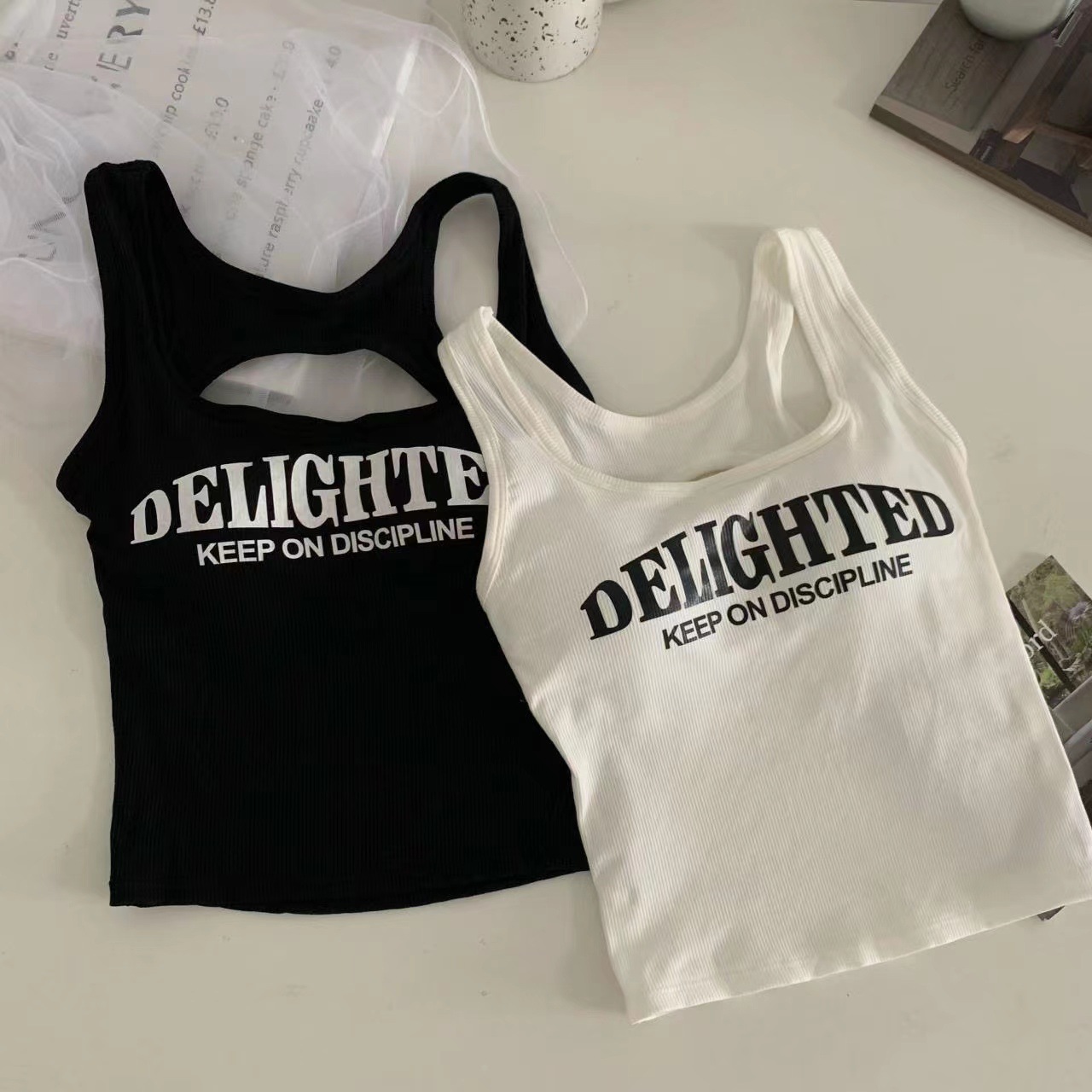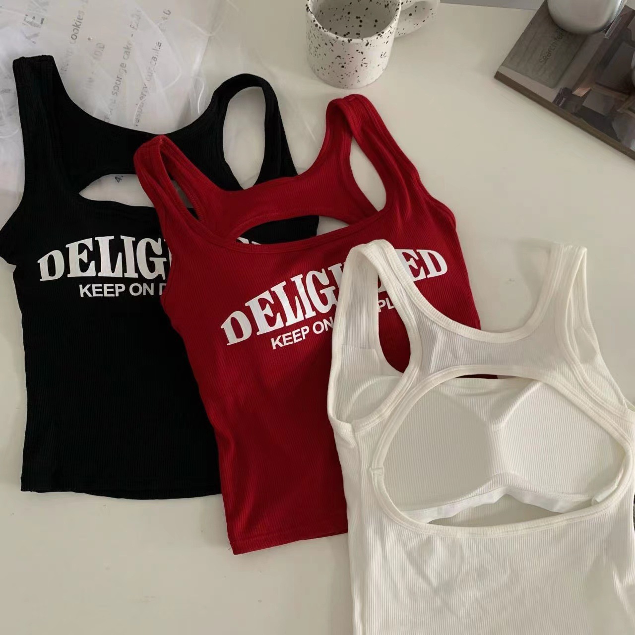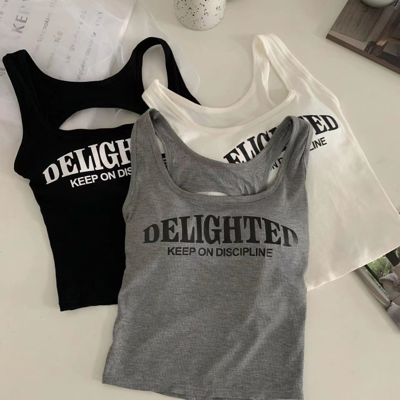 새로운 한국식 백 중공 스파이스 걸 패션 조끼 여성용 편안한 내부 슬링 슬림 레터 프린트 탑 트렌디스토어 가기