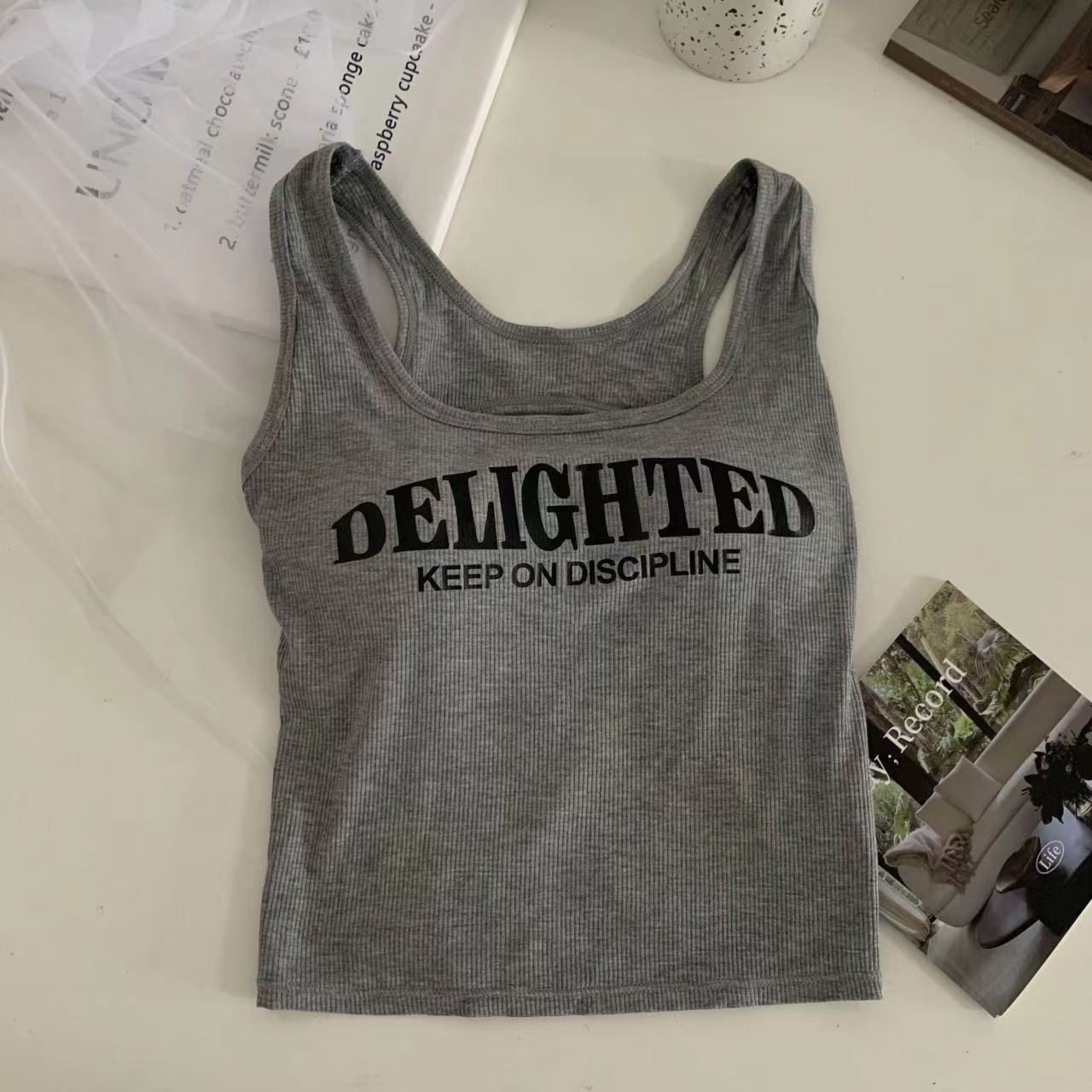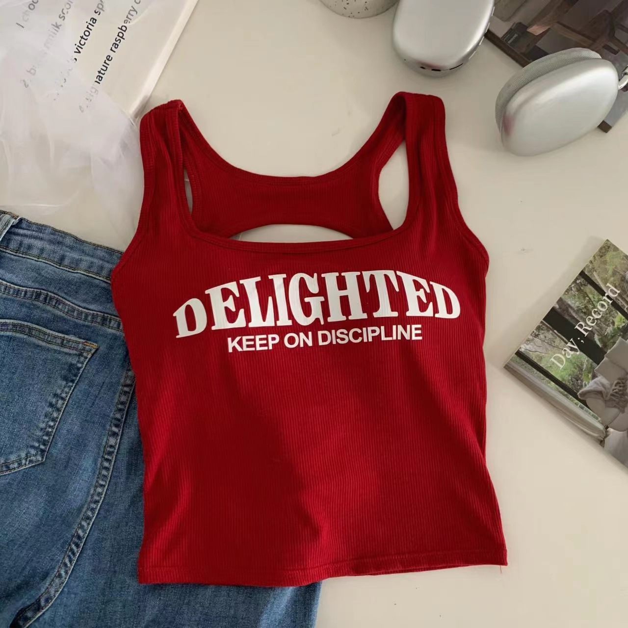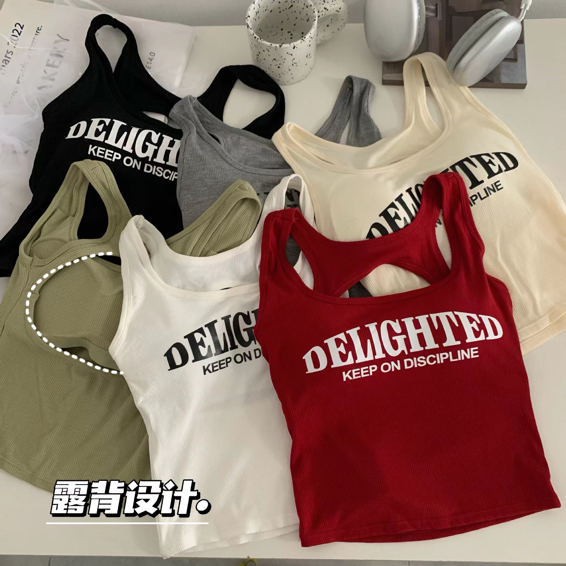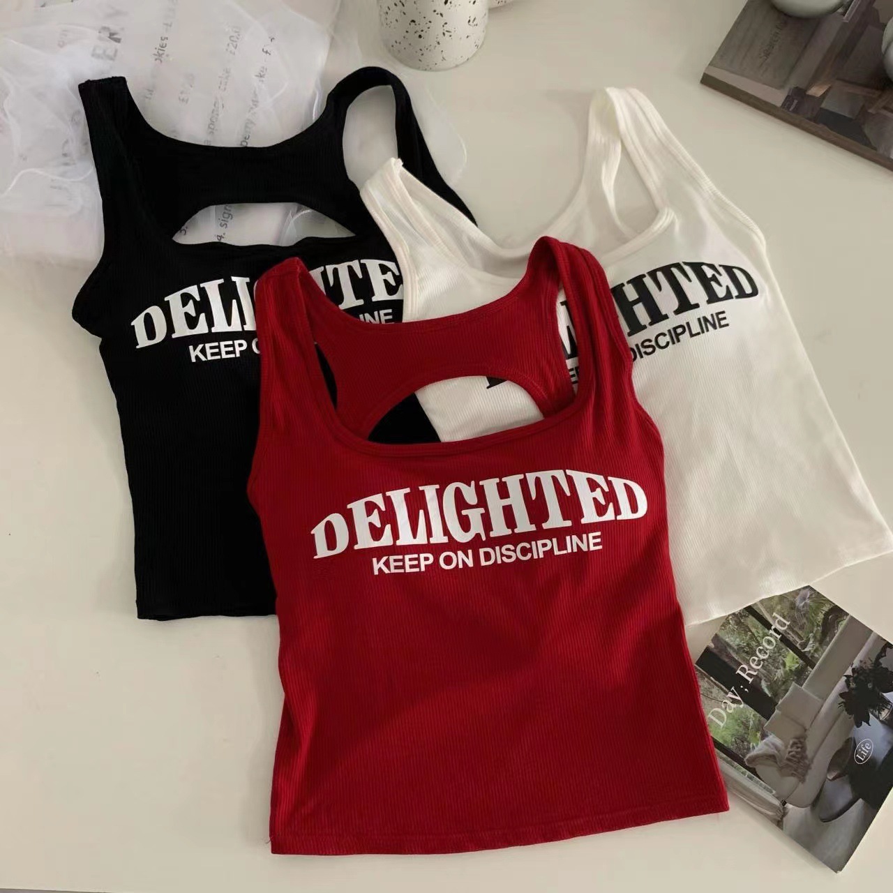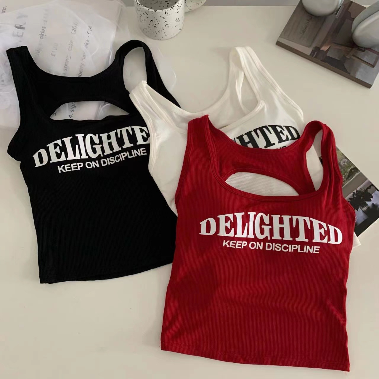 새로운 한국식 백 중공 스파이스 걸 패션 조끼 여성용 편안한 내부 슬링 슬림 레터 프린트 탑 트렌디스토어 가기