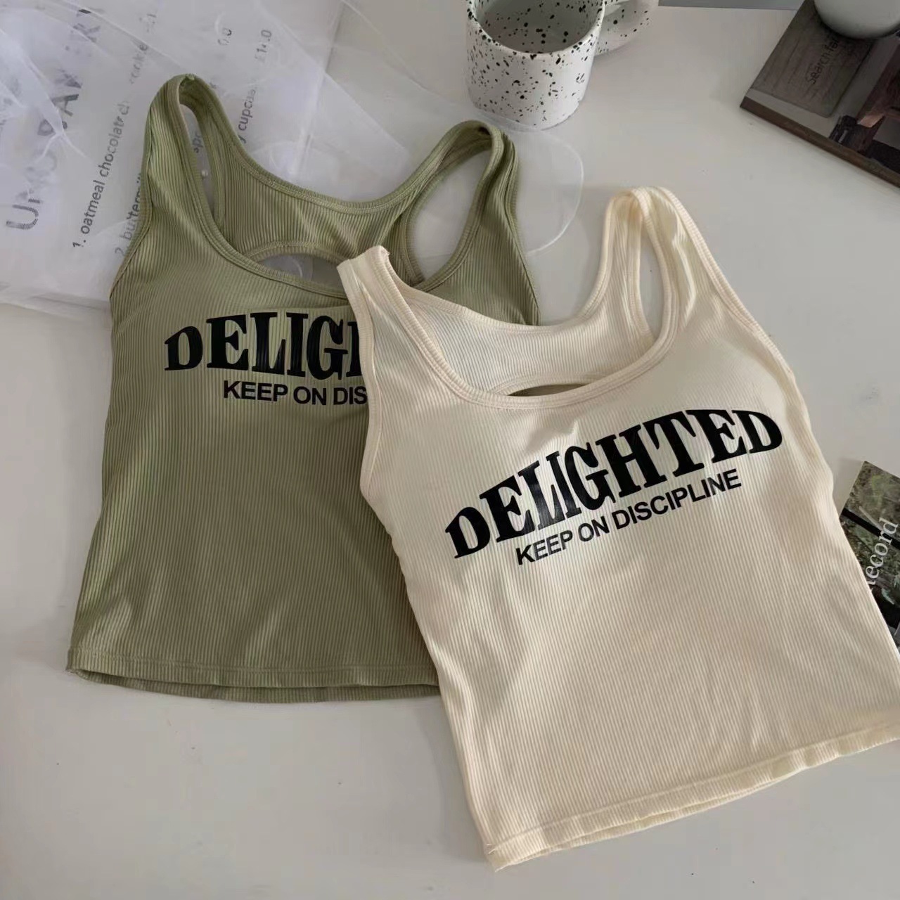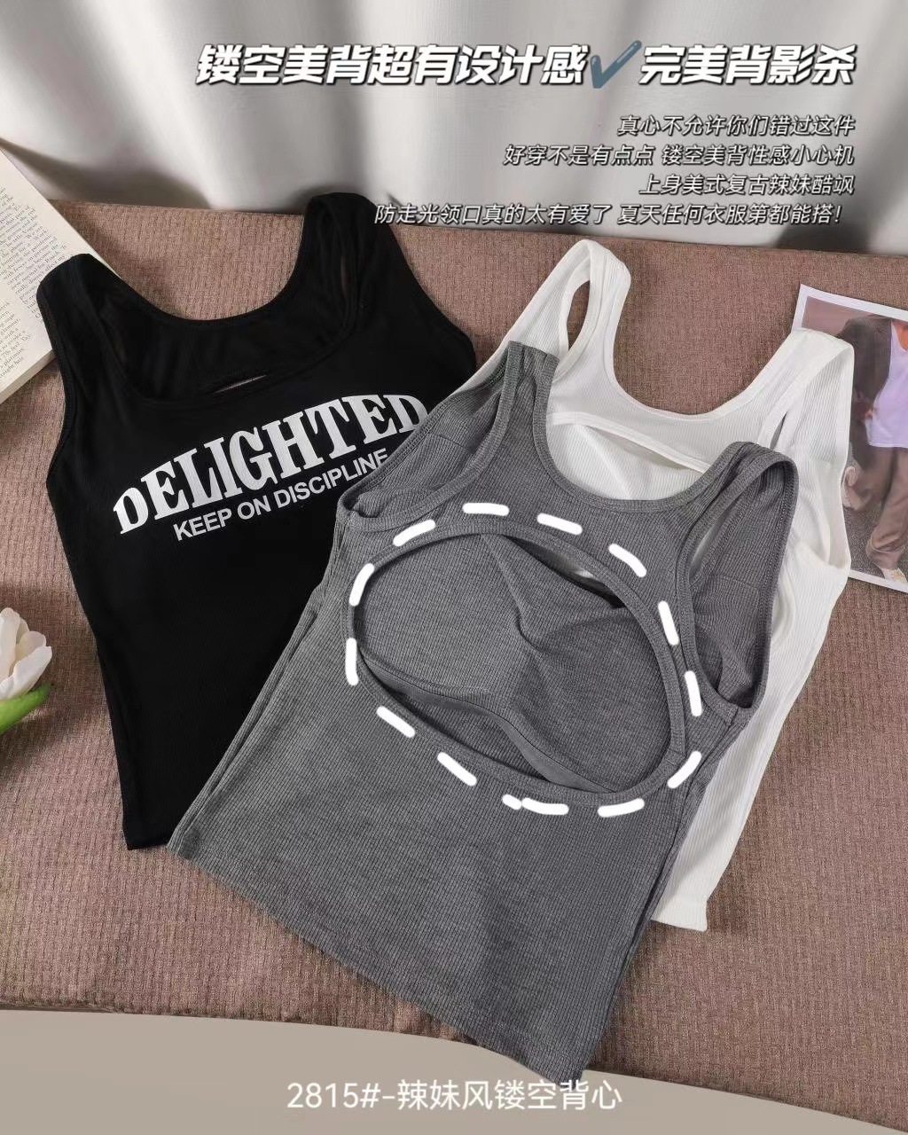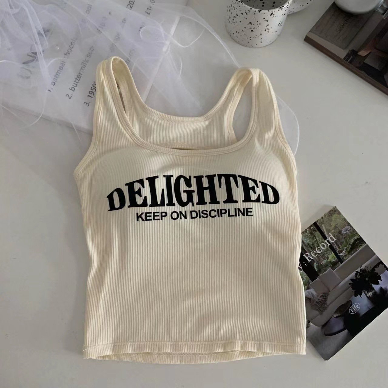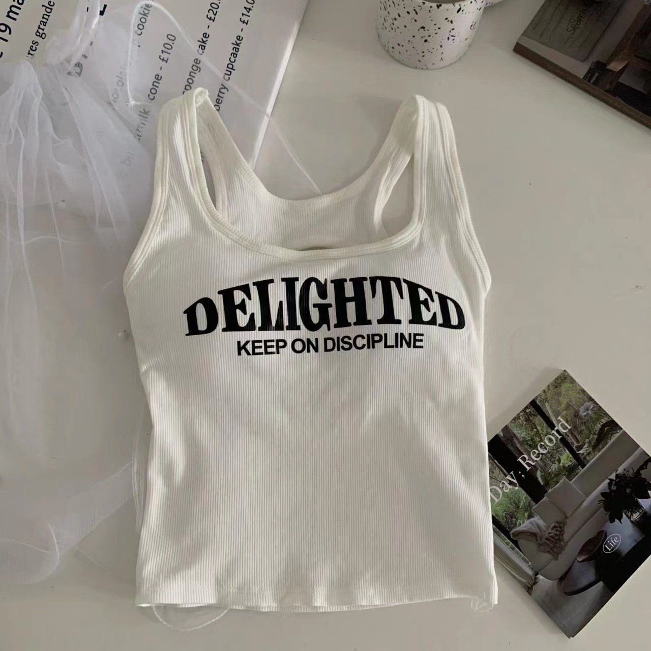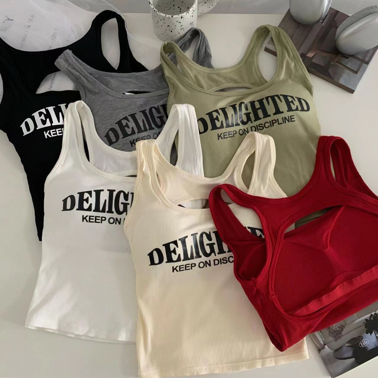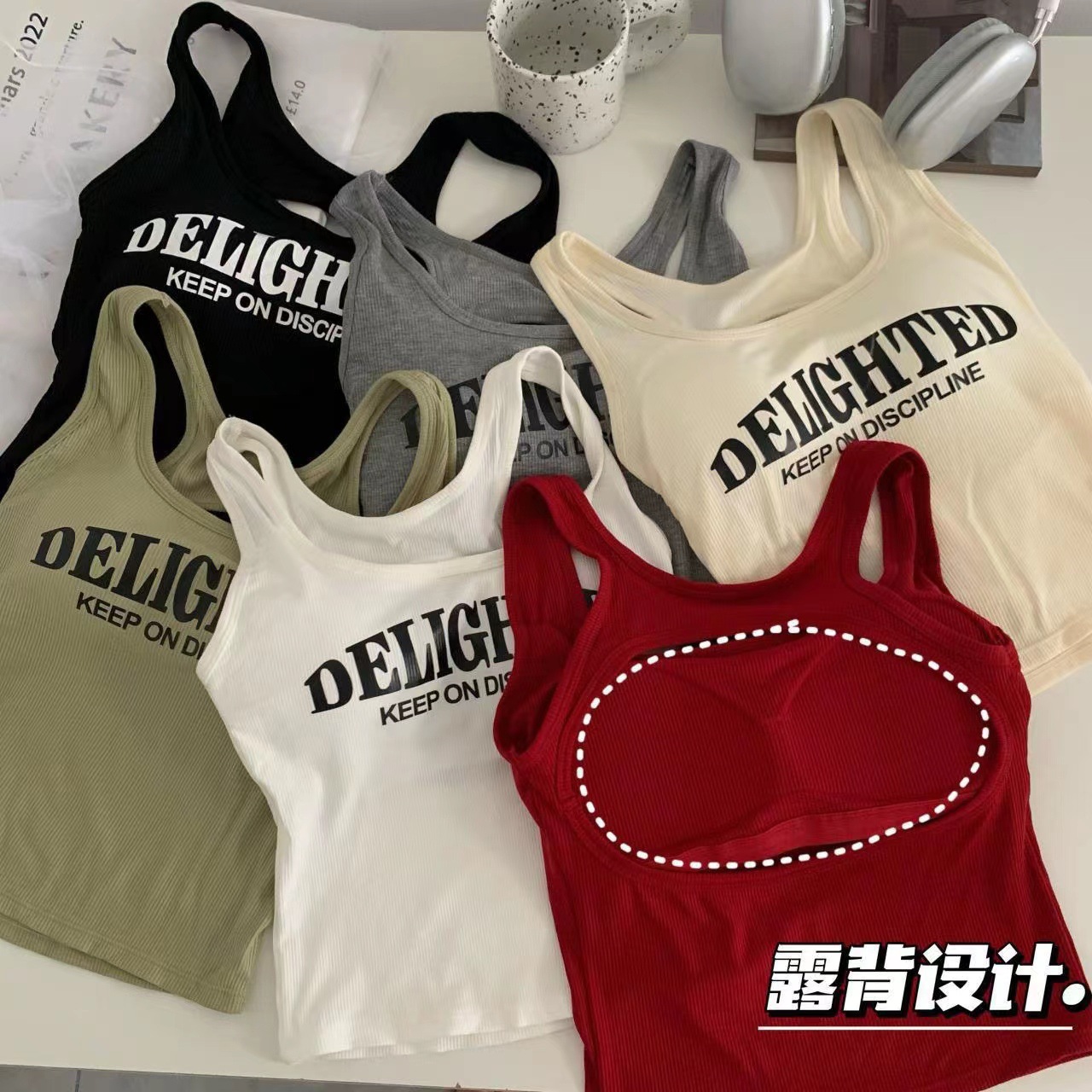 새로운 한국식 백 중공 스파이스 걸 패션 조끼 여성용 편안한 내부 슬링 슬림 레터 프린트 탑 트렌디스토어 가기