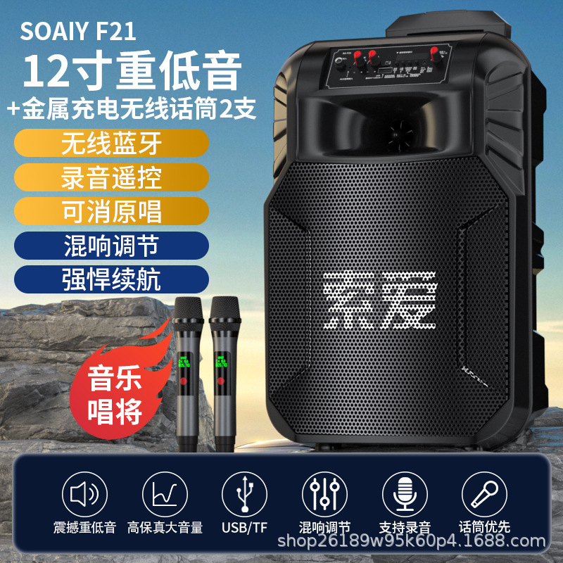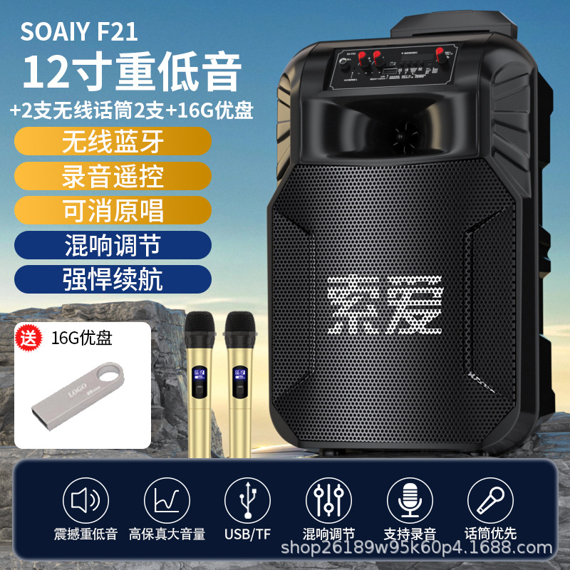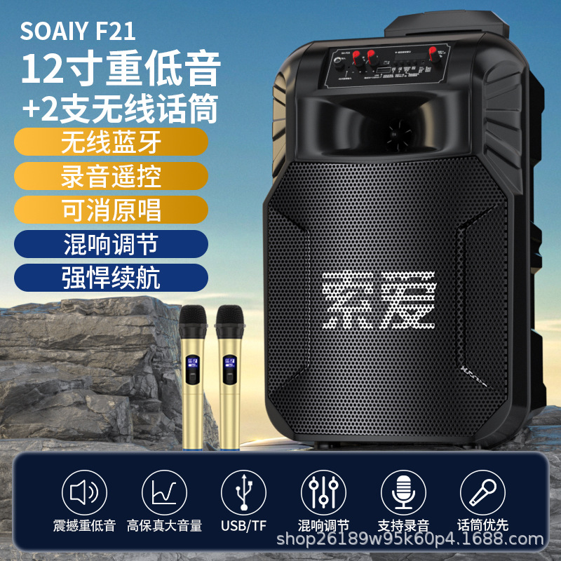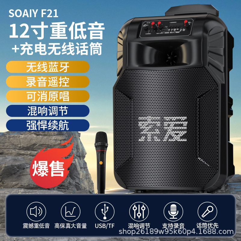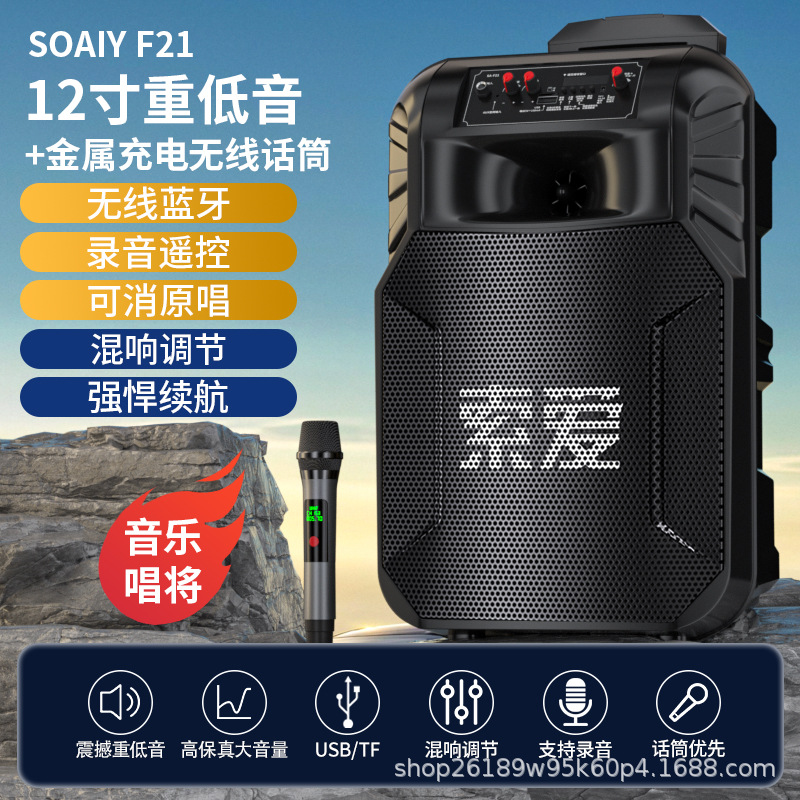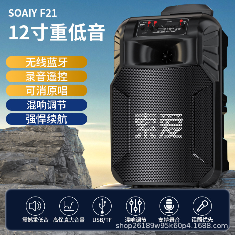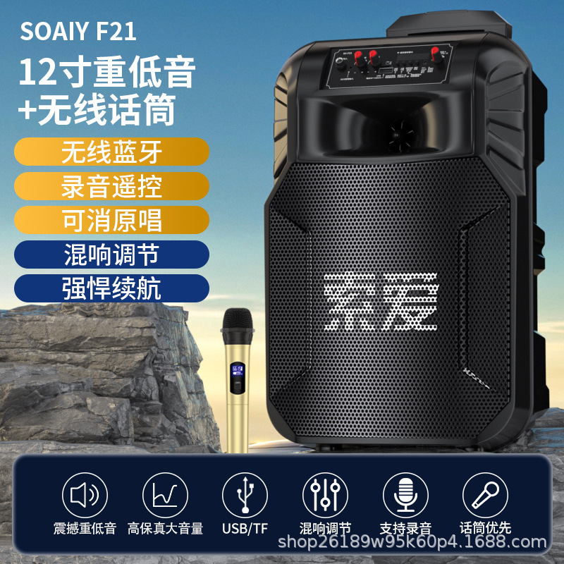 SOAIY F21 블루투스 스피커 모바일 트롤리 12inch 휴대용 스퀘어 댄스 스피커(무선 마이크 포함)