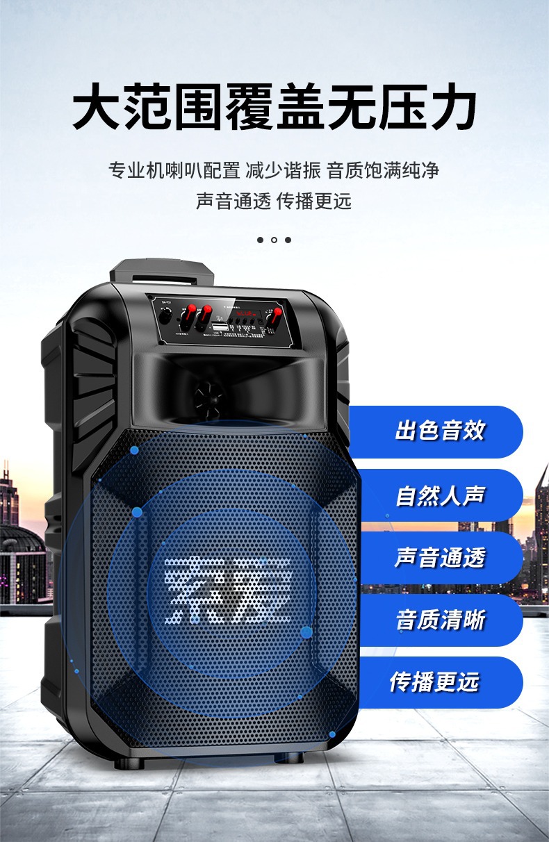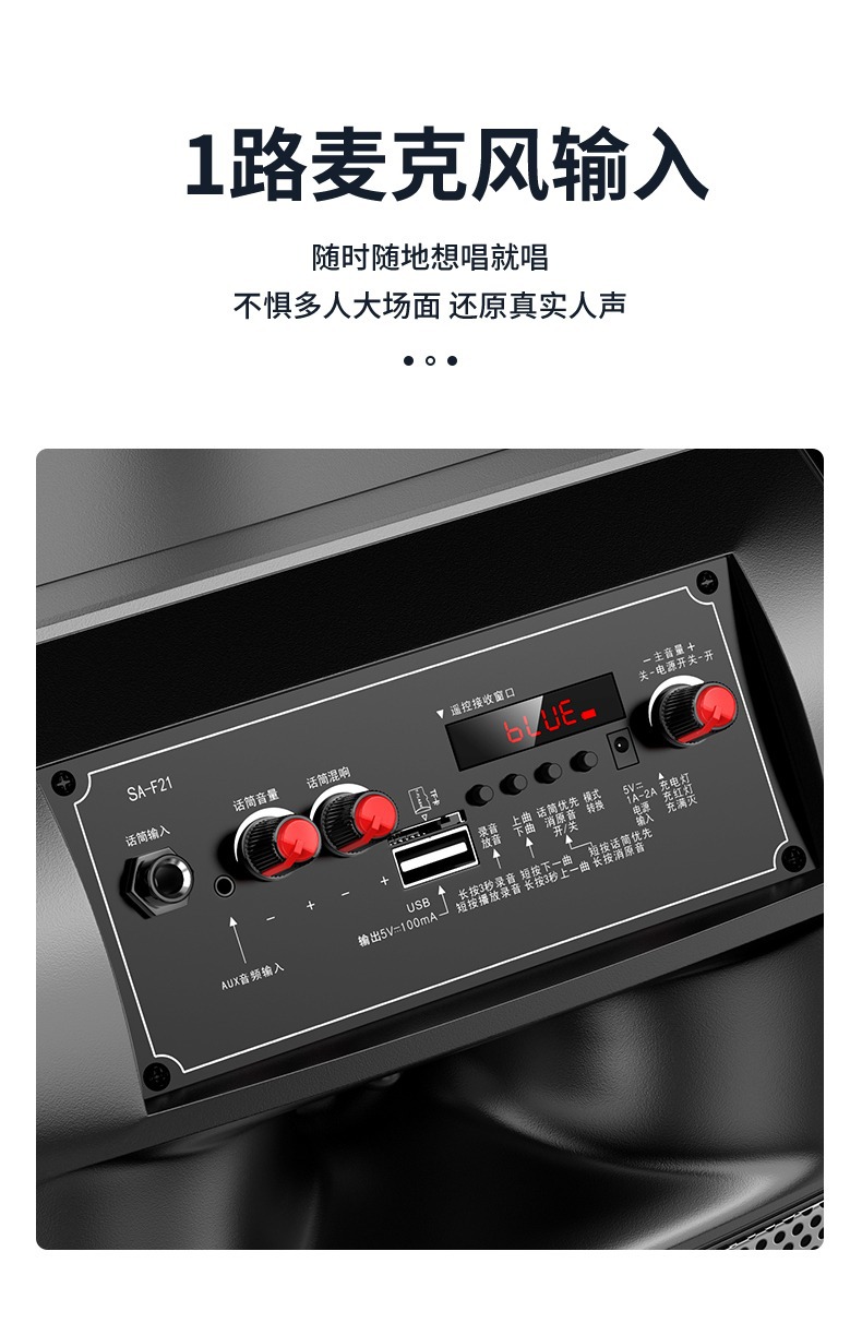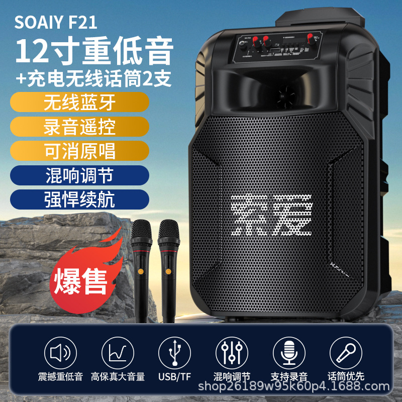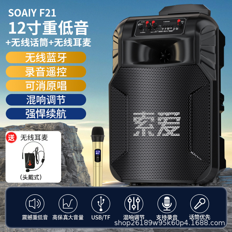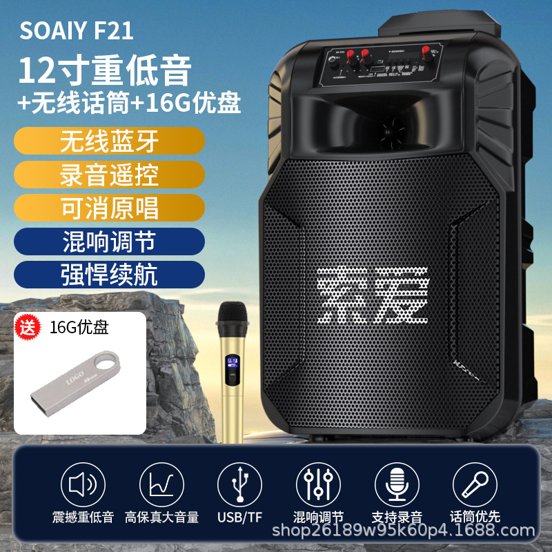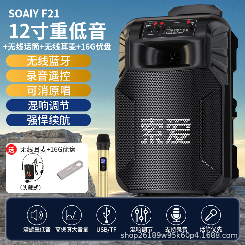 SOAIY F21 블루투스 스피커 모바일 트롤리 12inch 휴대용 스퀘어 댄스 스피커(무선 마이크 포함)