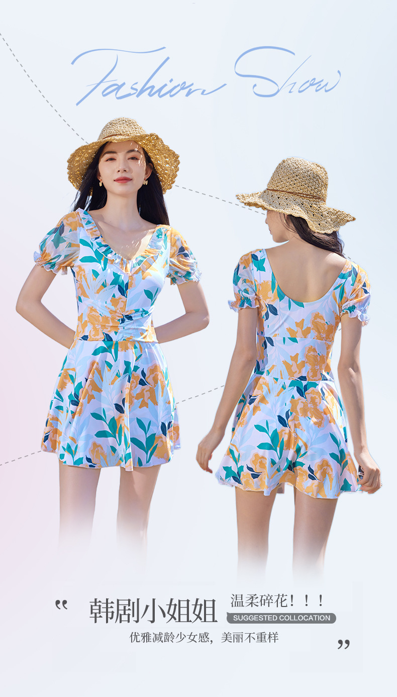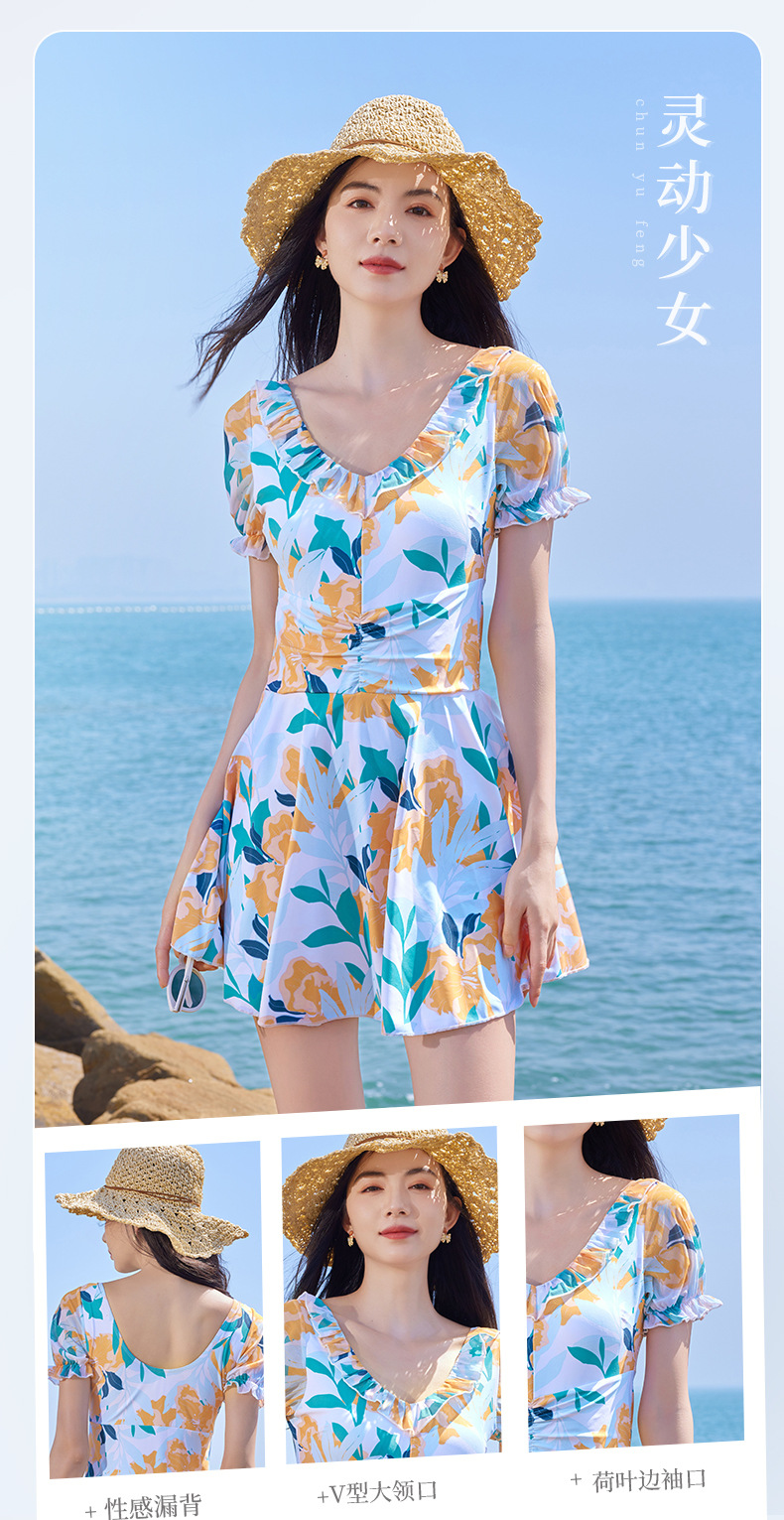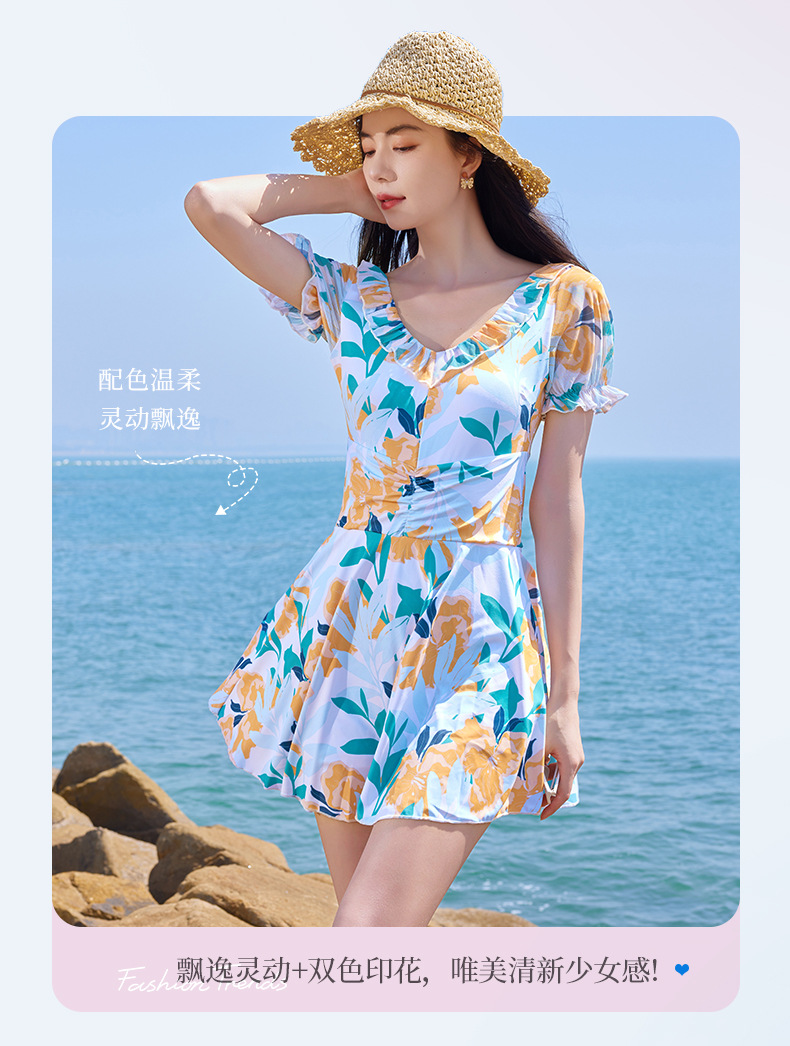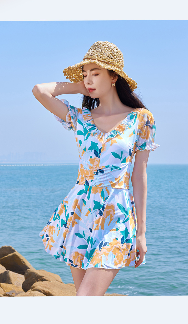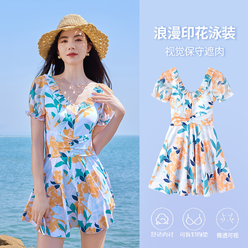 가을과 겨울 온천 여성 수영복 해변 휴가 신선한 꽃 수영복 스커트 원피스 하이 웨이스트 등이없는 수영복스토어 가기
