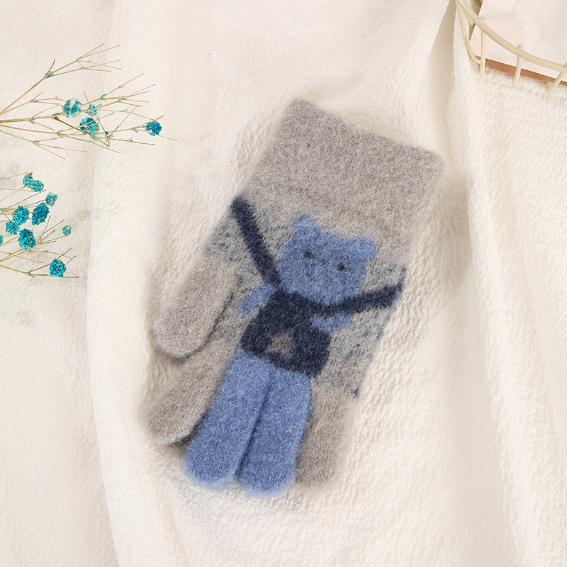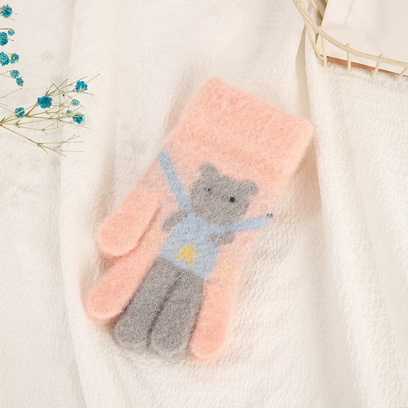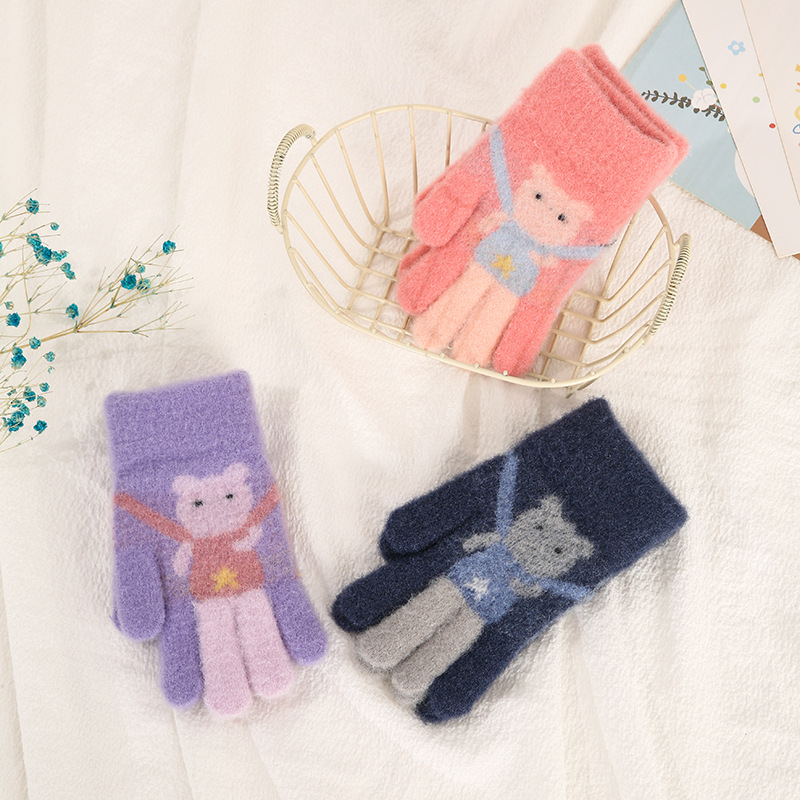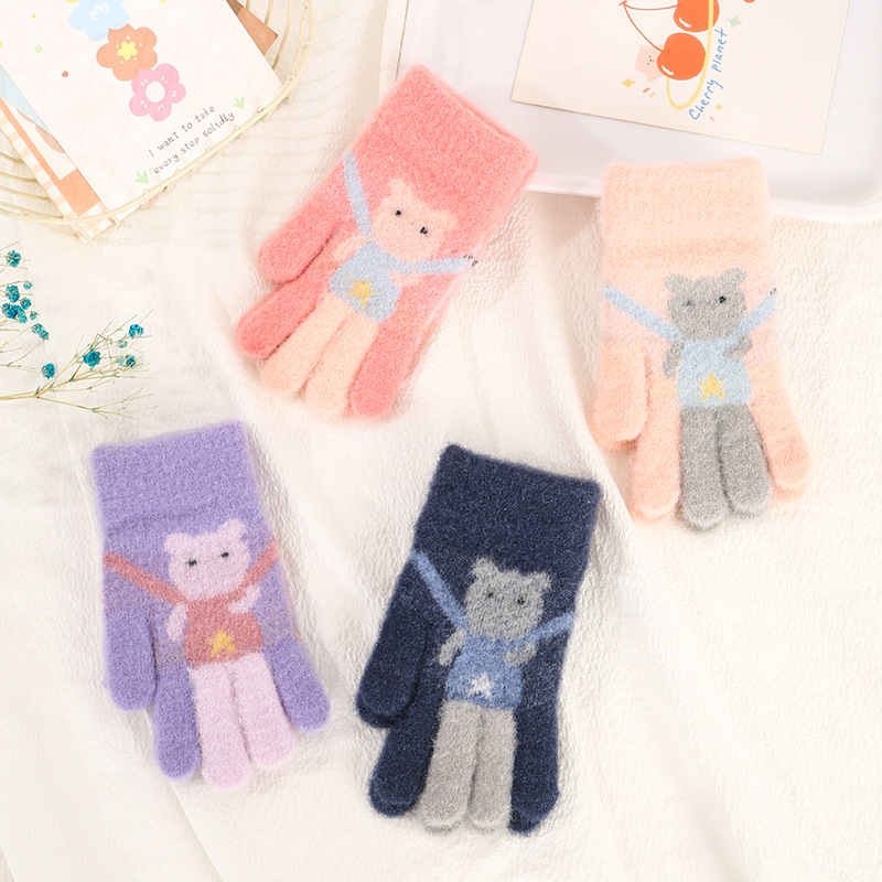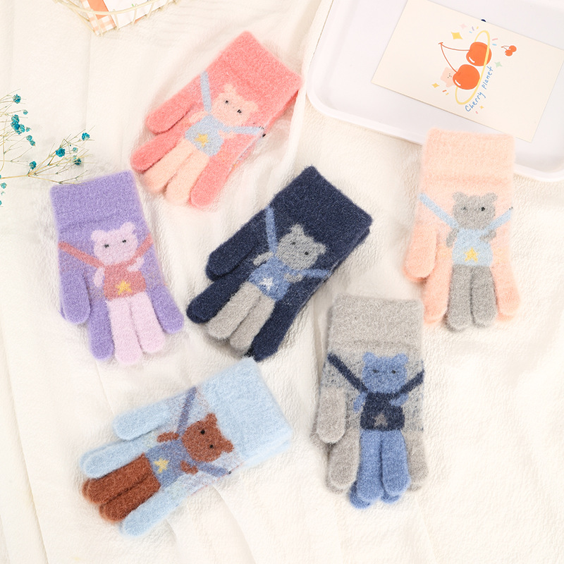 어린이 장갑 가을과 겨울 다섯 손가락 만화 곰 소년과 소녀 초등 학생을위한 방한 따뜻한 니트 장갑