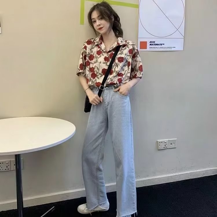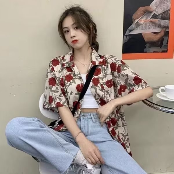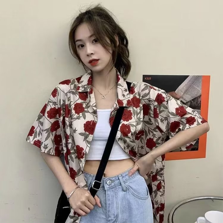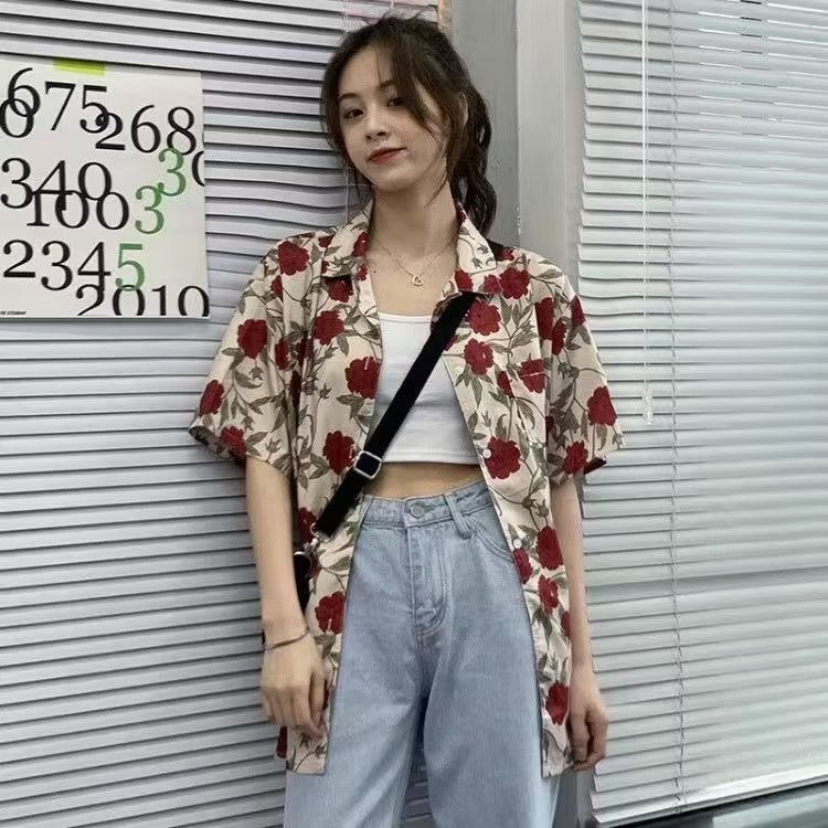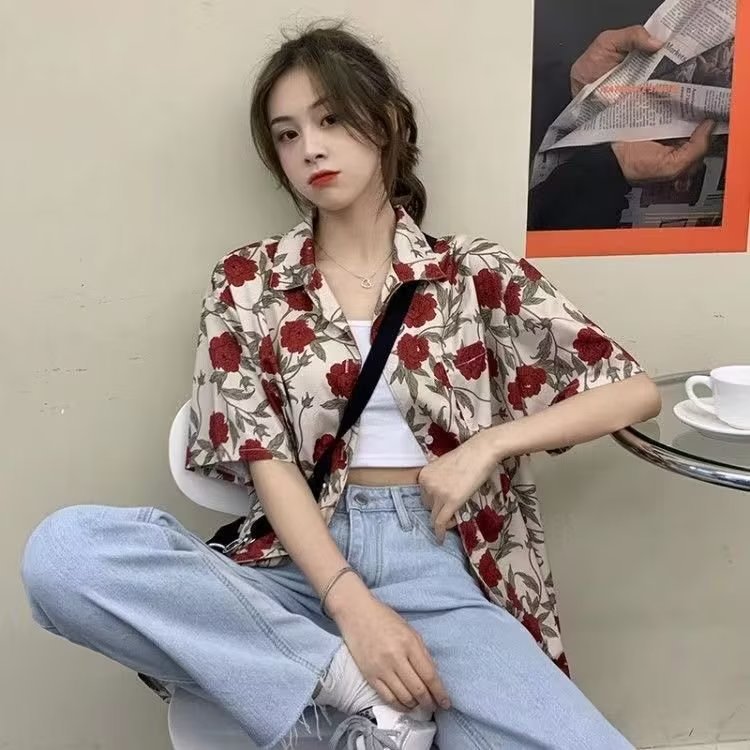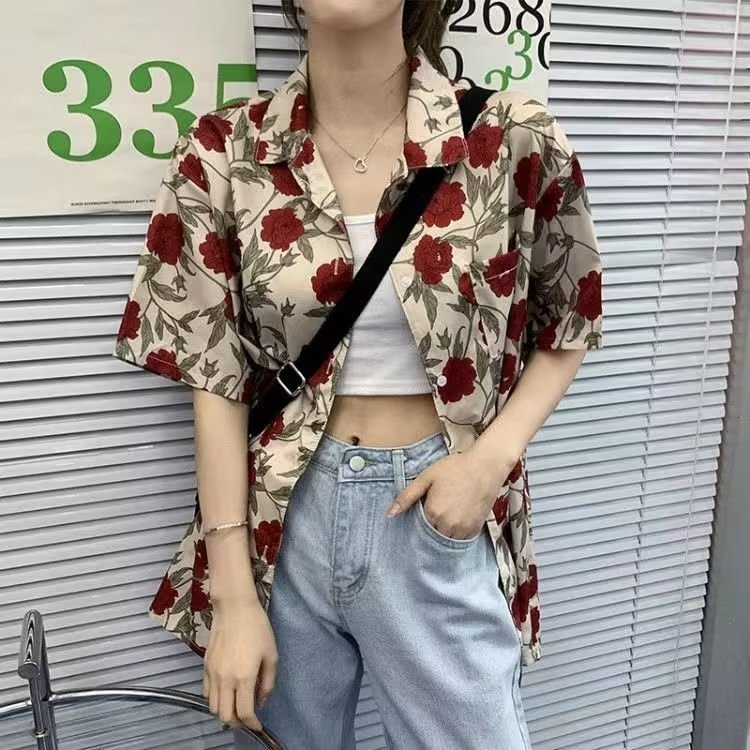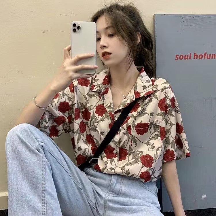 한국식 홍콩식 루즈한 셔츠 반팔 여성 학생 레트로 프린트 쉬폰 셔츠 틈새 디자인 센스 자외선 차단제 트렌디