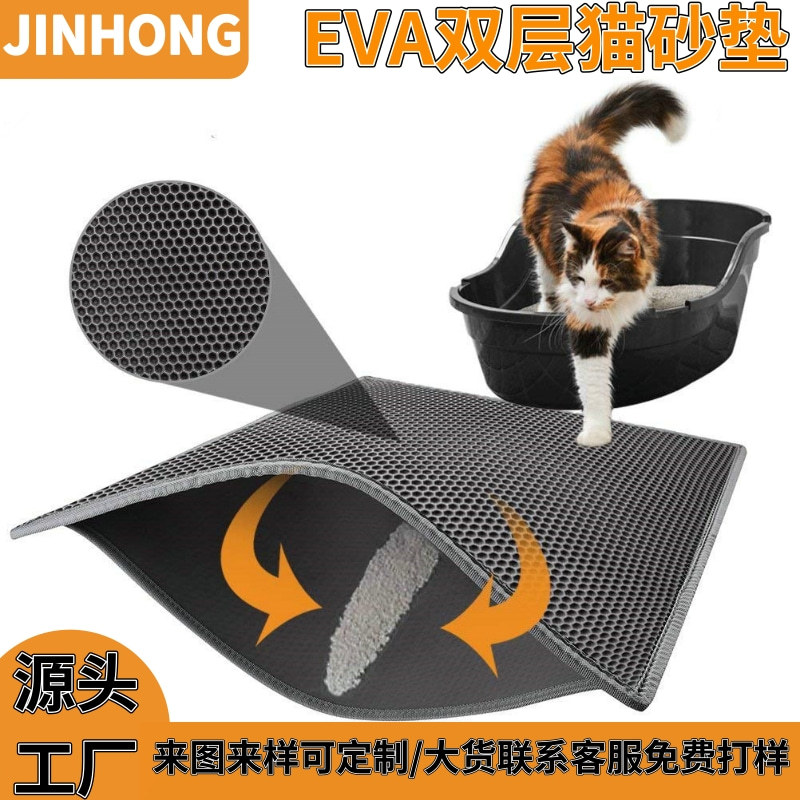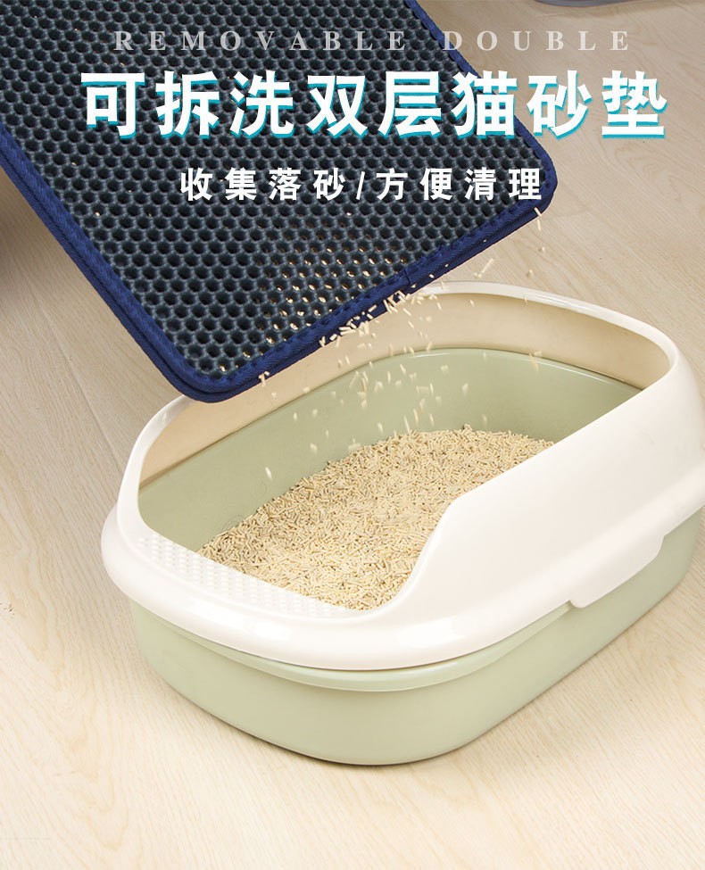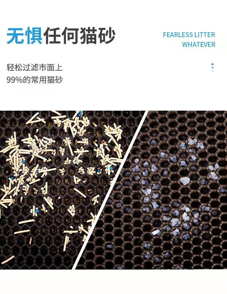 产品功能:适用95%以上种类的猫砂,上层通孔材料,猫砂可轻易通过,下层防水材质,猫砂、小便等脏物可聚集于此。猫砂垫为上下双层设计:上层采用六角形的洞孔凹凸设计,除了让猫砂落入后不再溅出外,圆球型的柔滑触感也可以避免猫咪抓坏,下层垫密封专门存放猫砂,底部设计成规则性的圆孔,有效防滑避免横冲直撞的猫咪滑到受伤。