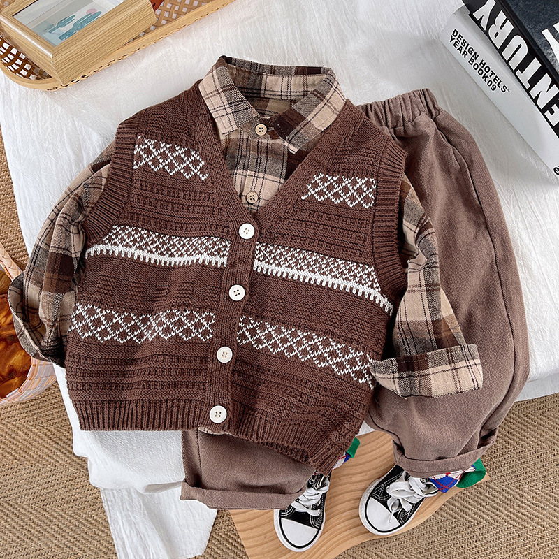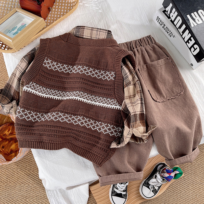 어린이 가을 세트 빈티지 가디건 스웨터 Maillard 스타일 격자 무늬 셔츠 단색 캐주얼 바지 3 종 세트