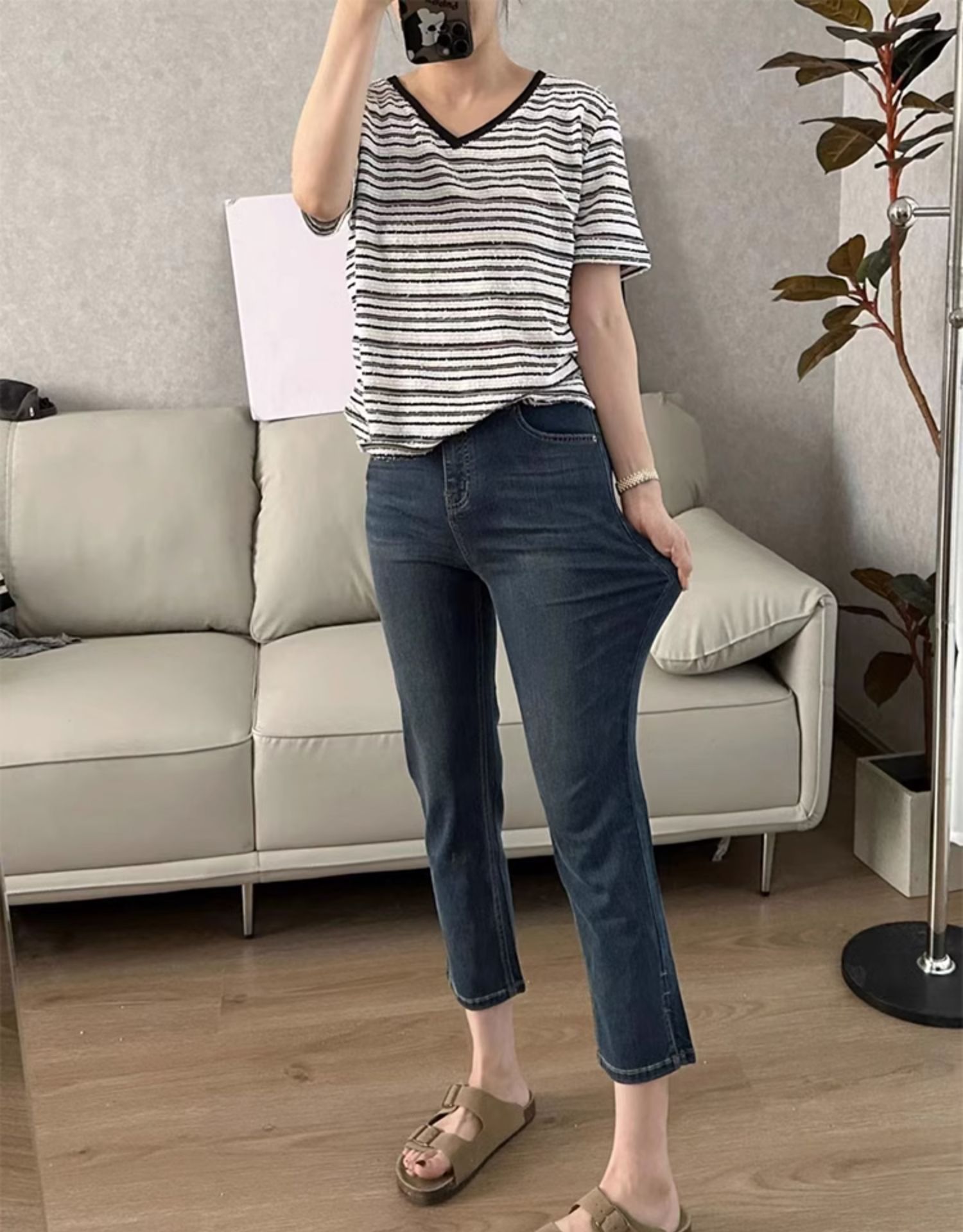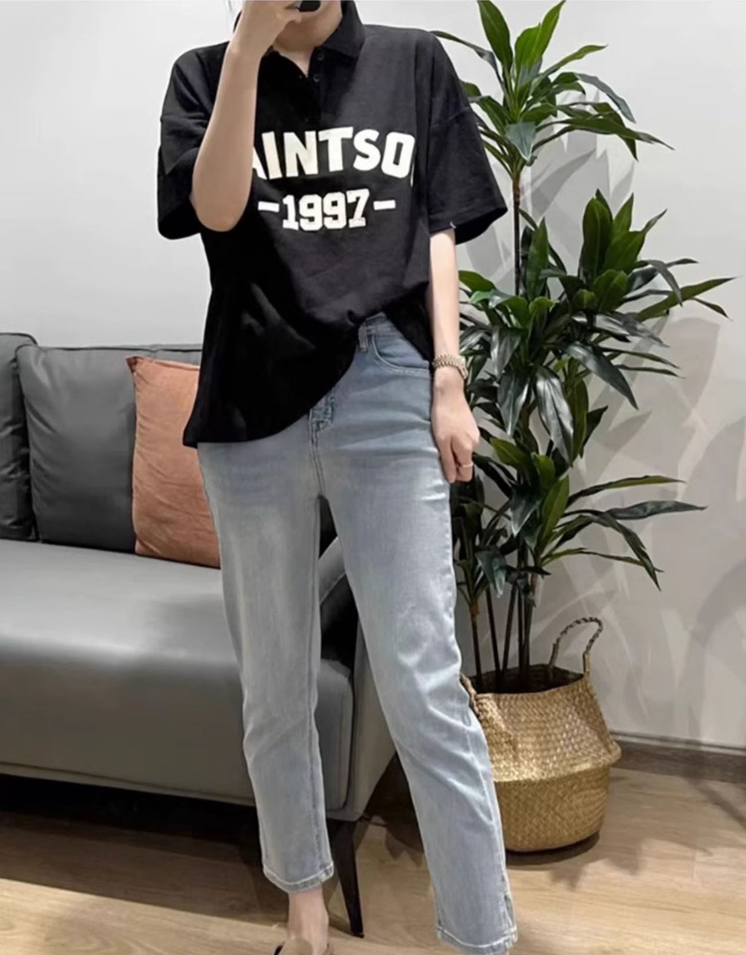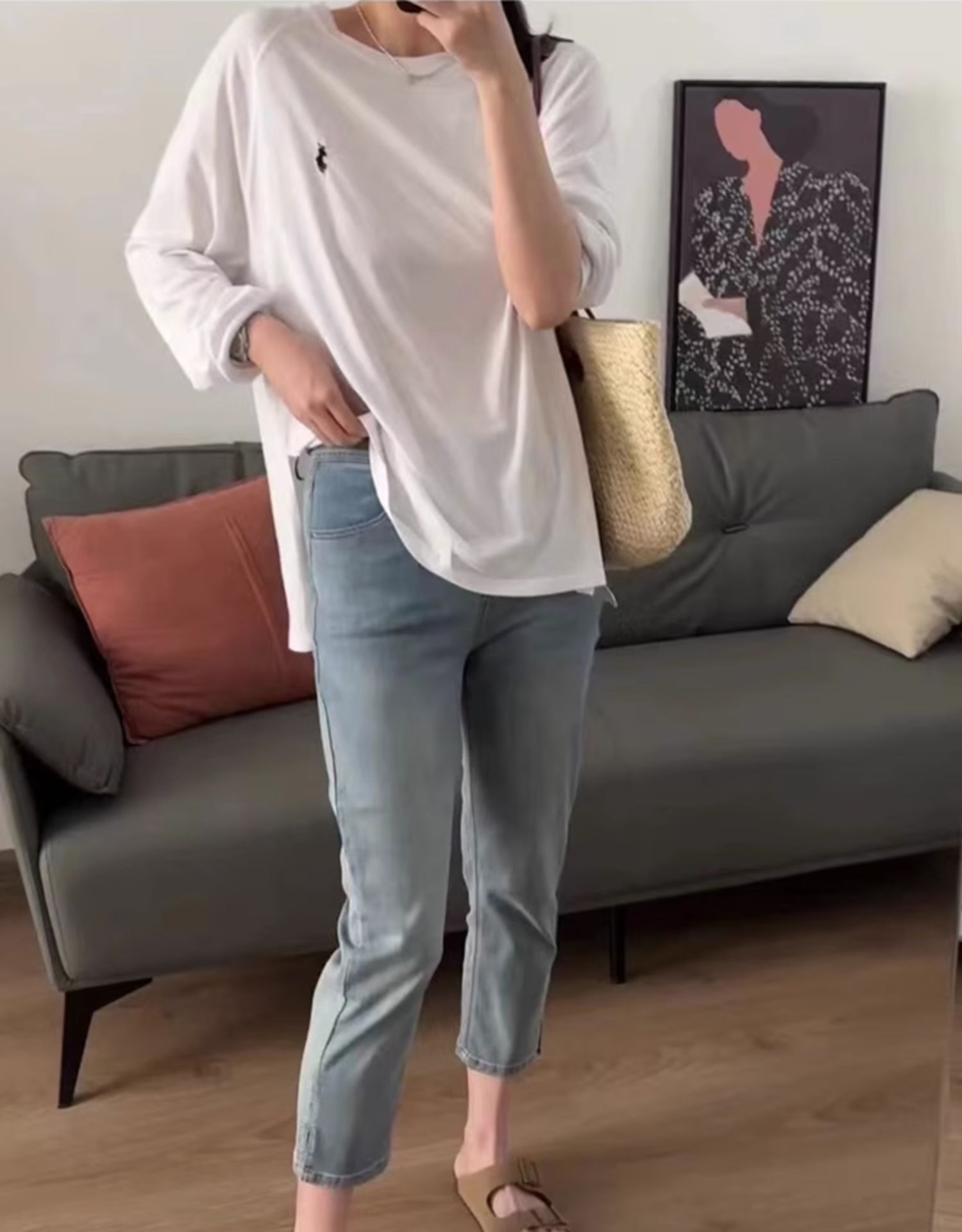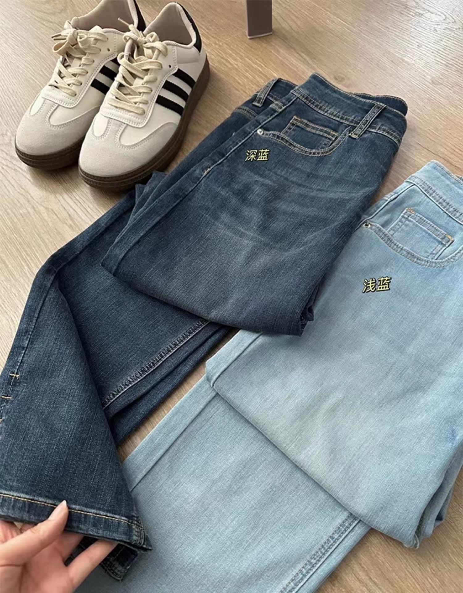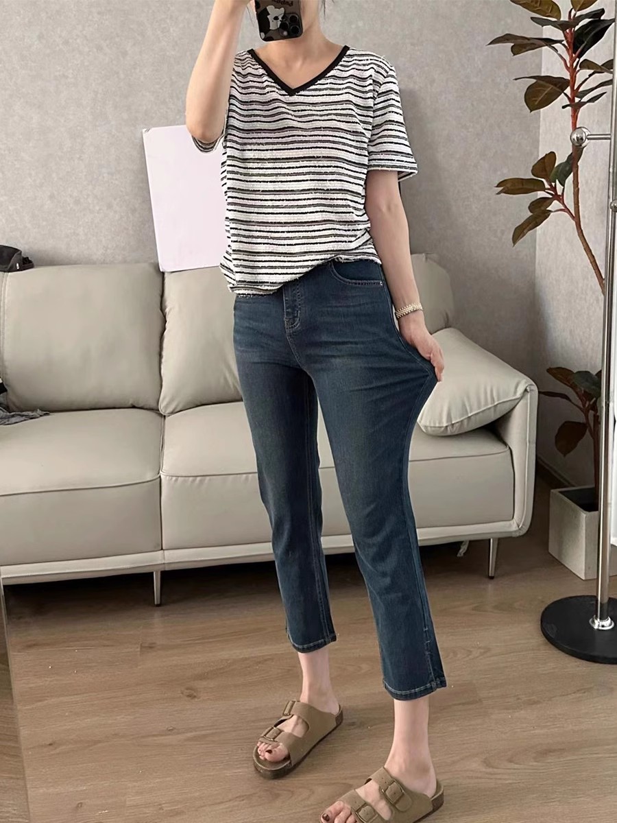 플러스 사이즈 통통녀 청바지 여자의 봄과 가을 2023 얇은 바지 작은 남자 Harlan 슬림 연기 바지스토어 가기
