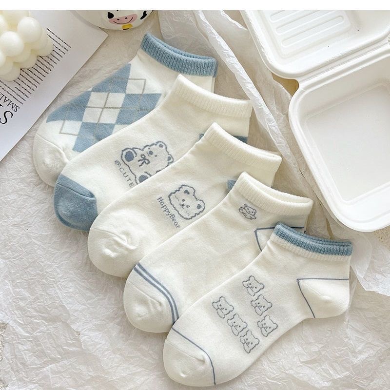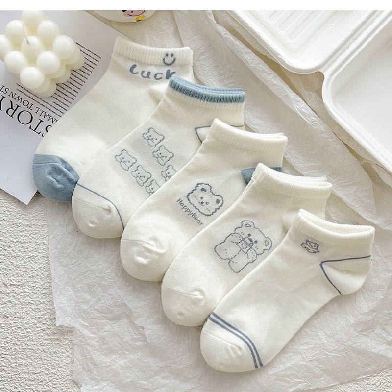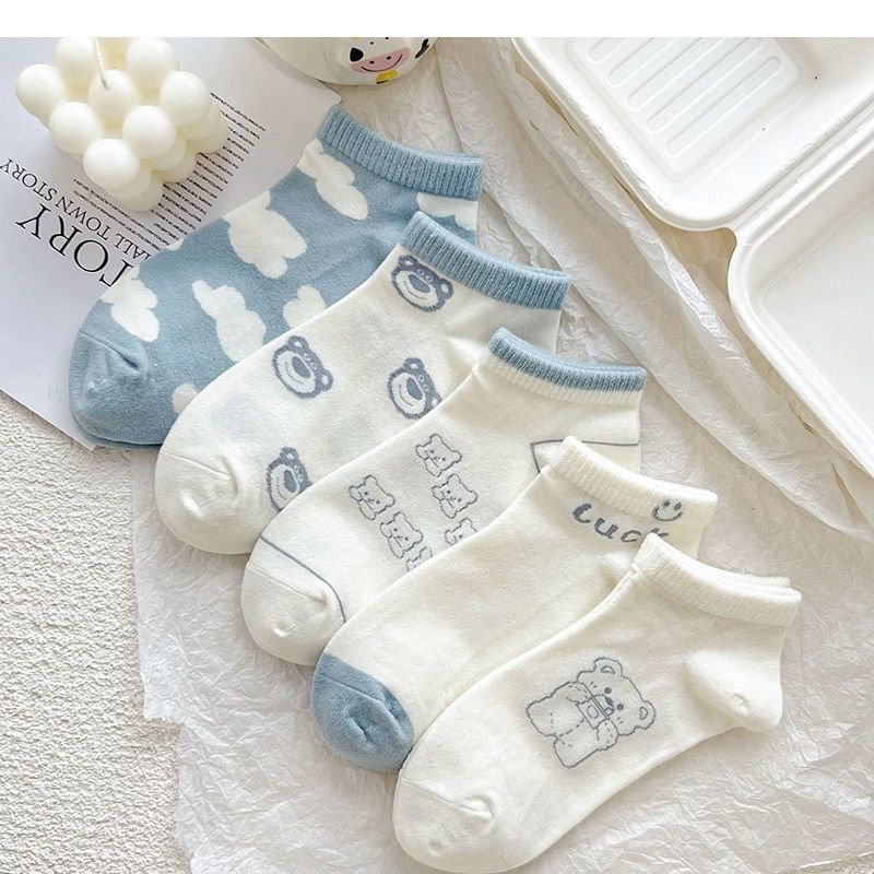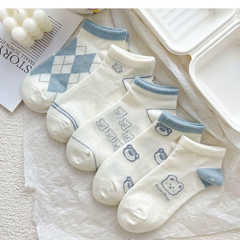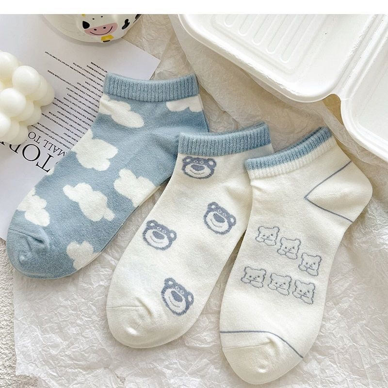 봄과 여름 트렌디 한 블루 베어 양말 여성용 짧은 튜브 인 트렌디 한 귀여운 곰 만화 얕은 입 낮은 탑 여성 양말